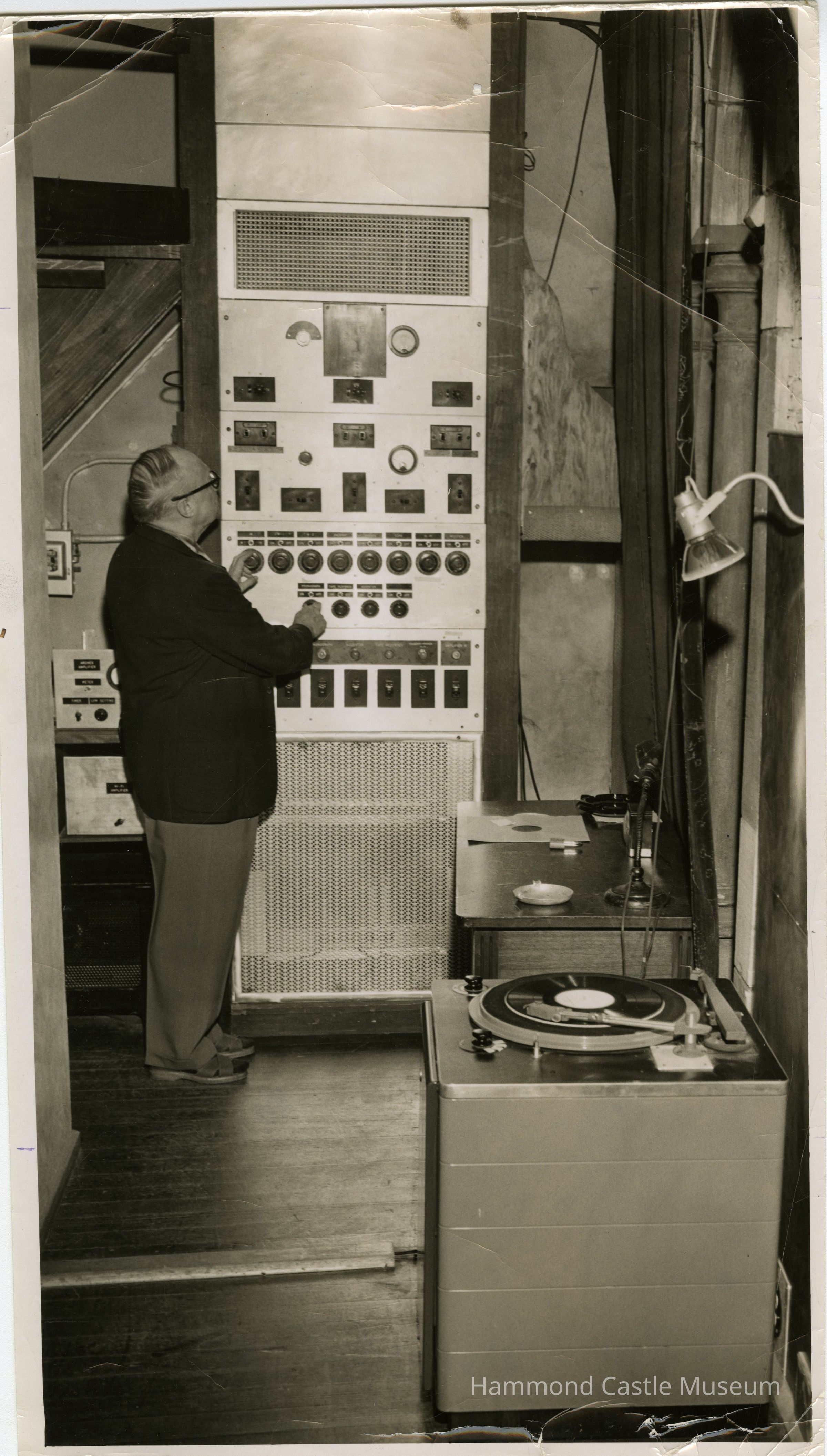 2 copies of photo of Hammond Jr with Dynamic Multiplier under organ stairs