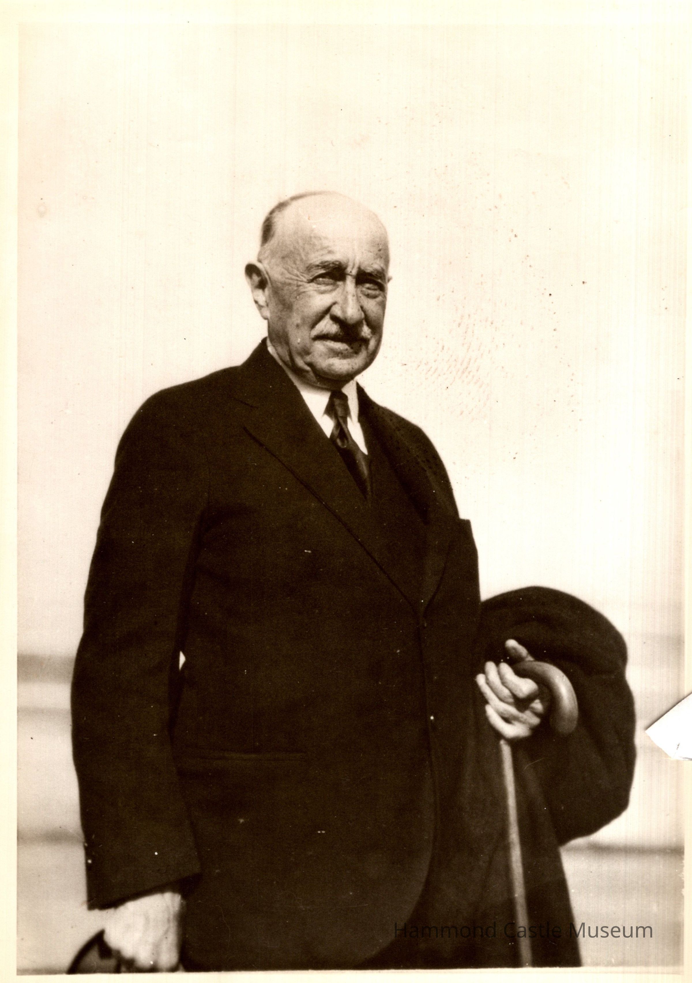 Photo of Hammond Sr holding coat, hat & cane, 1925 ca