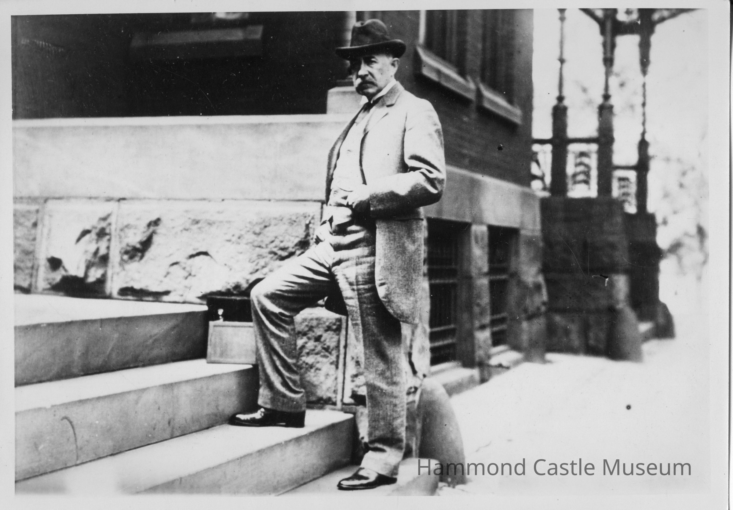 2 copies of photo of Hammond Sr on building steps, 1925 ca