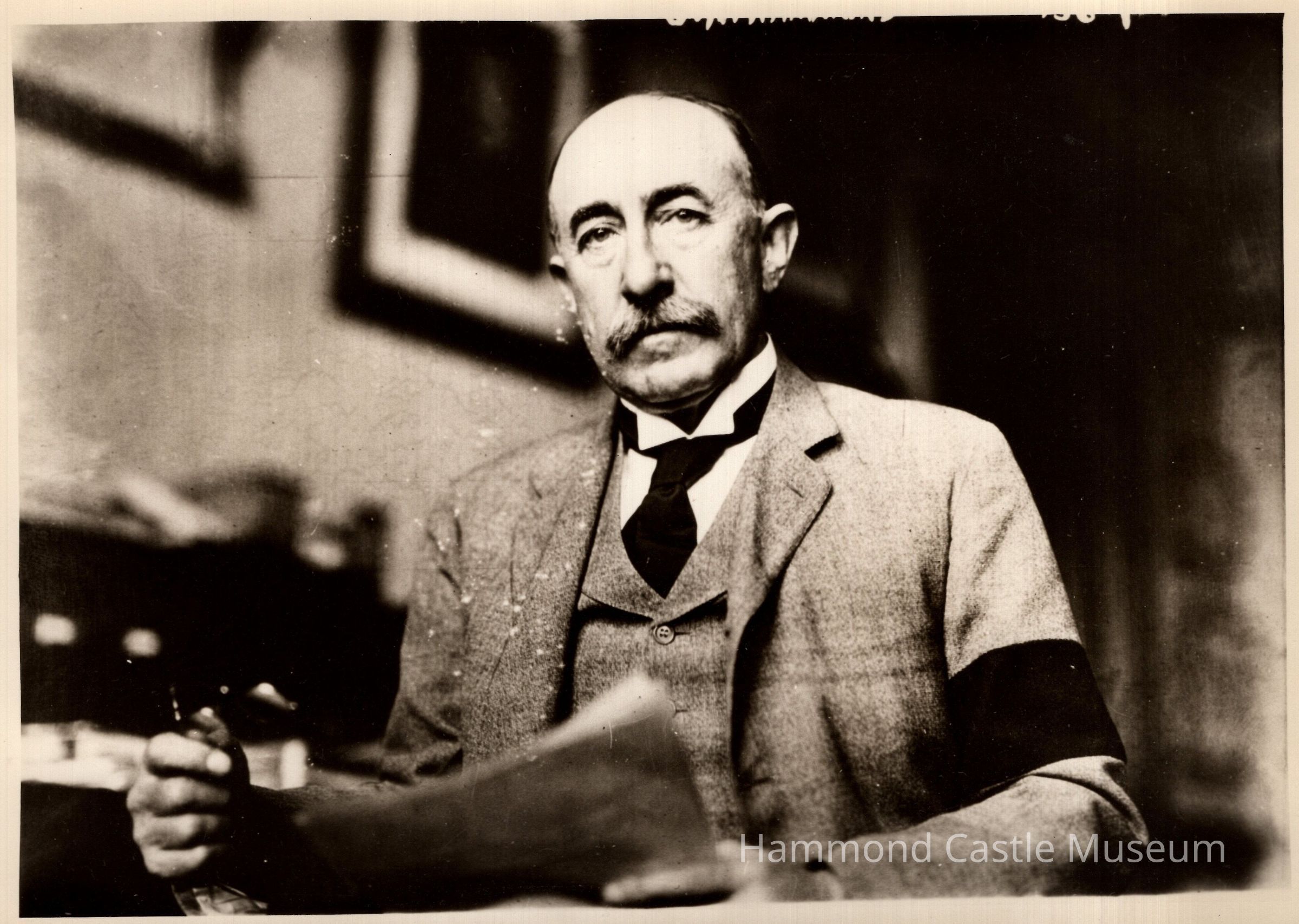 2 copies of photo of Hammond Sr holding papers & wearing mourning armband, 1930 ca