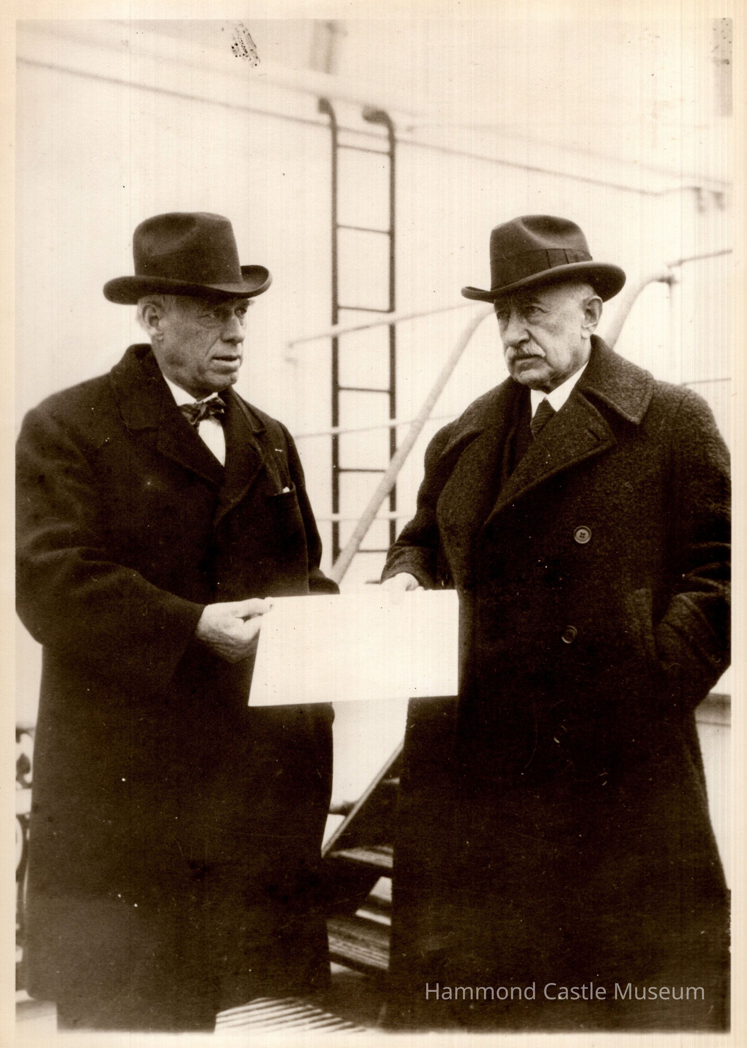 2 copies of photo of Hammond Sr (rt) with unknown man on deck of ship, 1925 ca