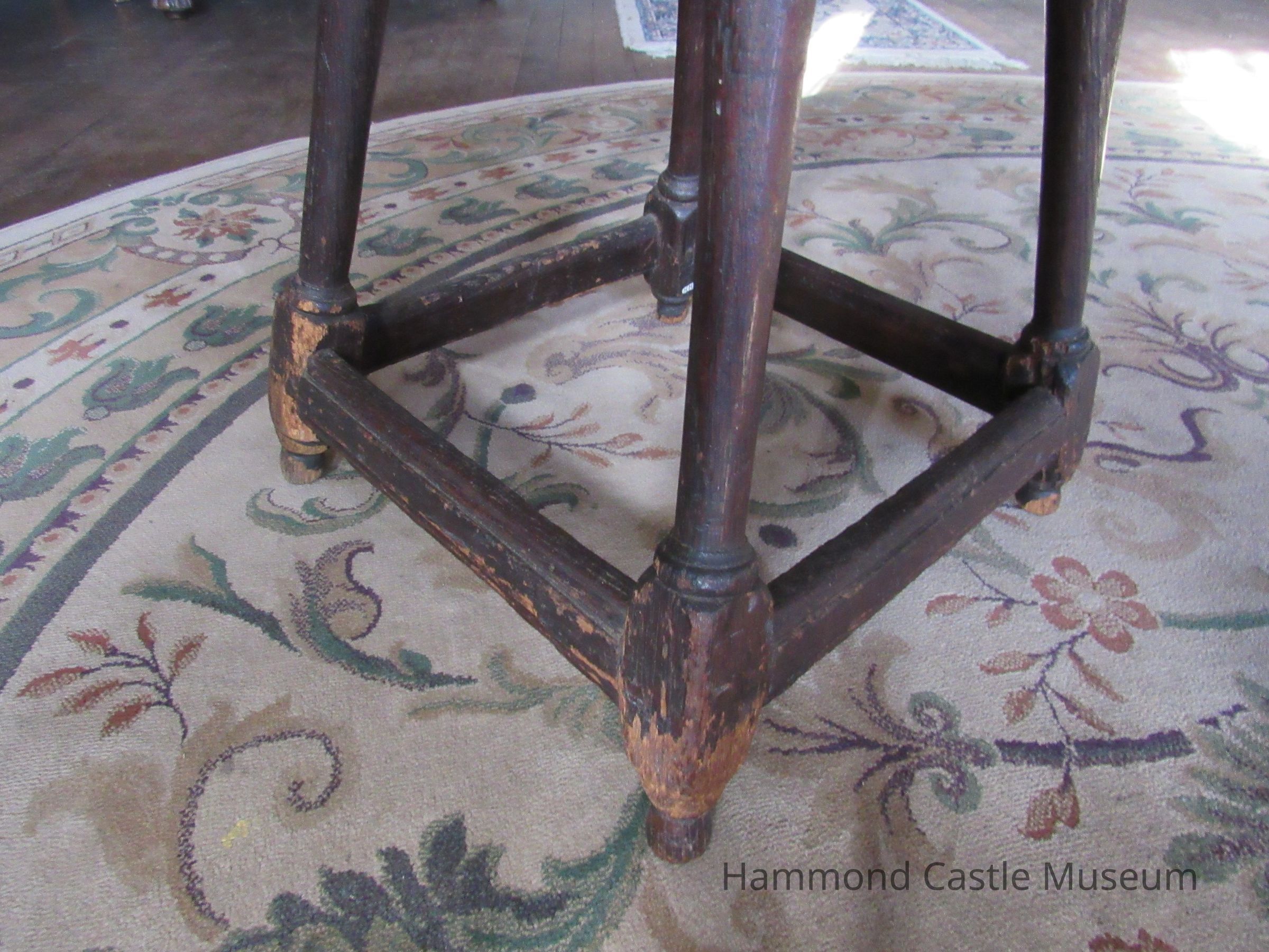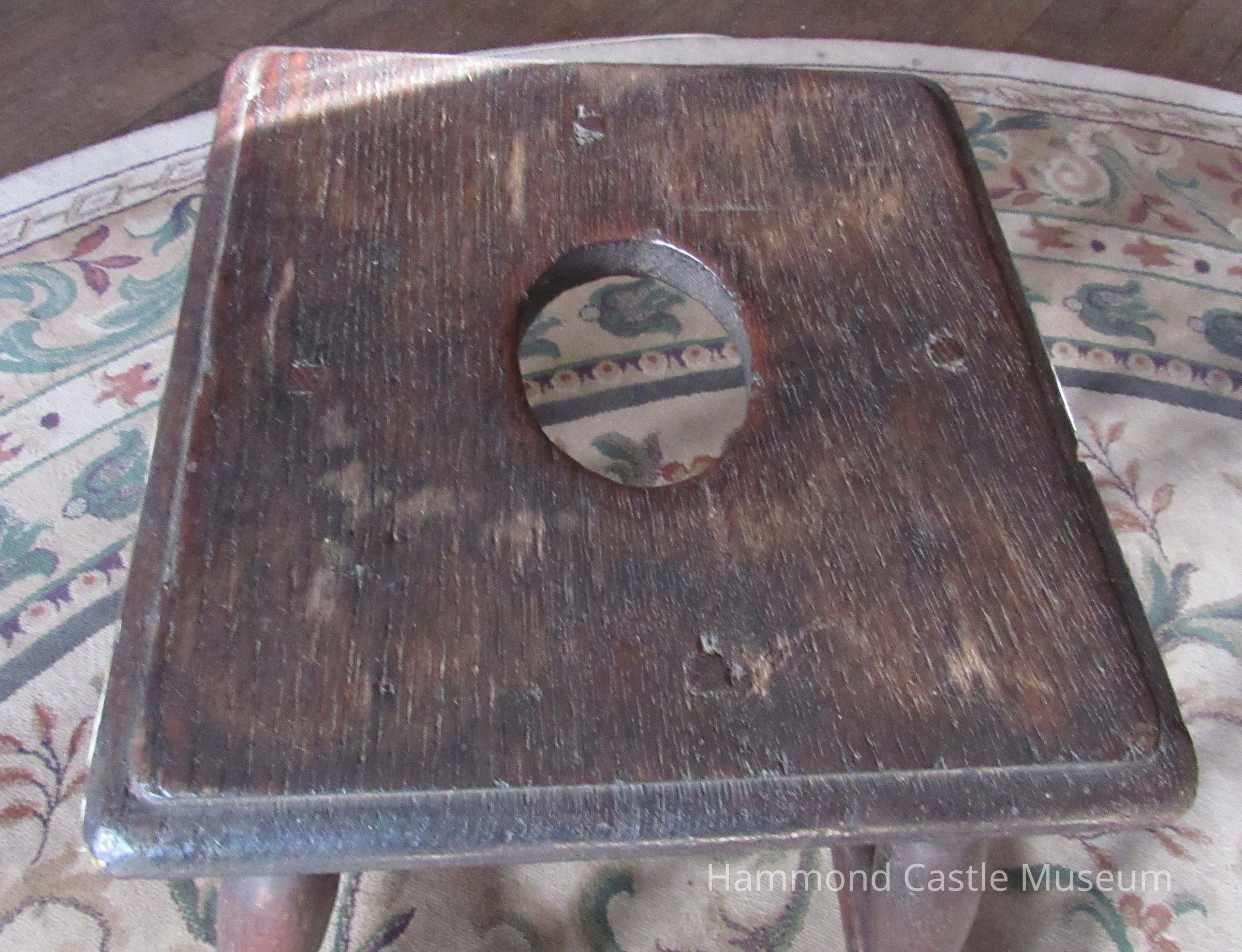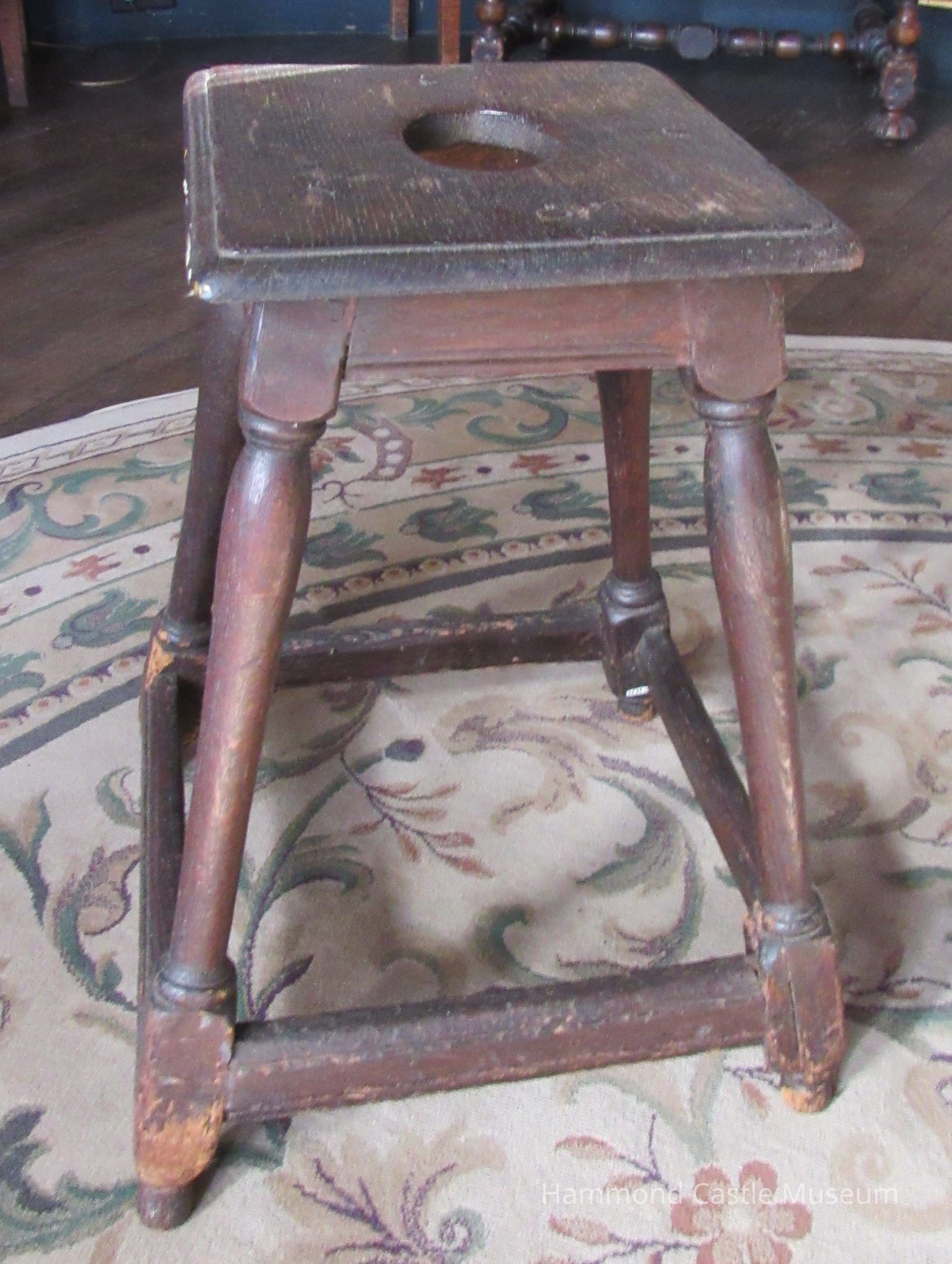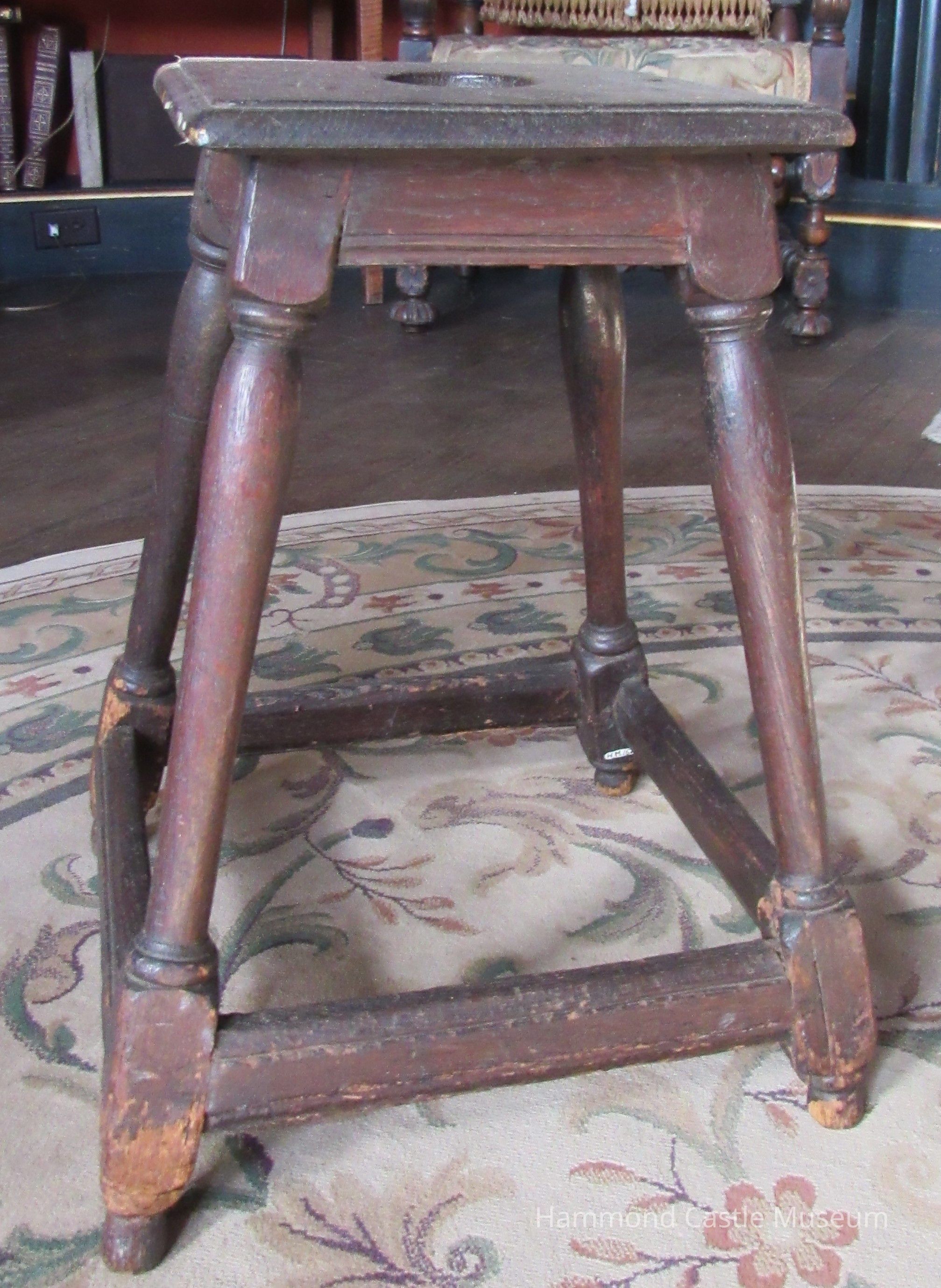 Joint stool with oval hand grip. Box-like reinforcement stretchers at bottom of legs possibly French Gothic