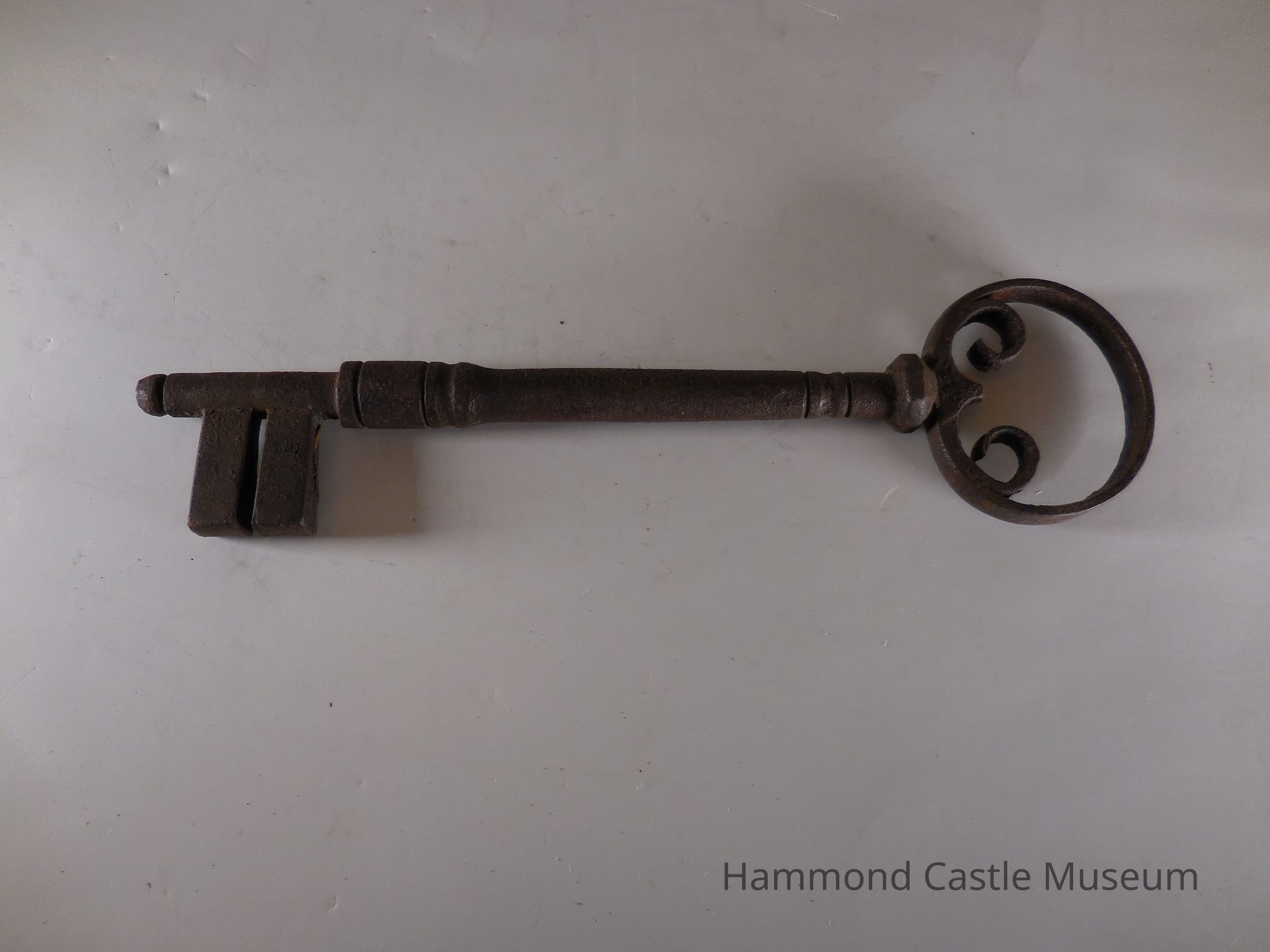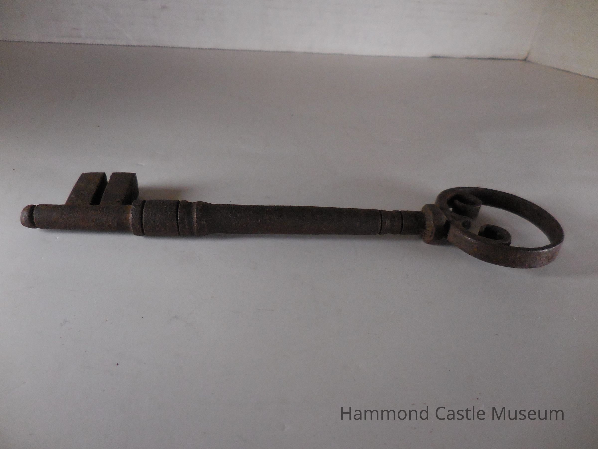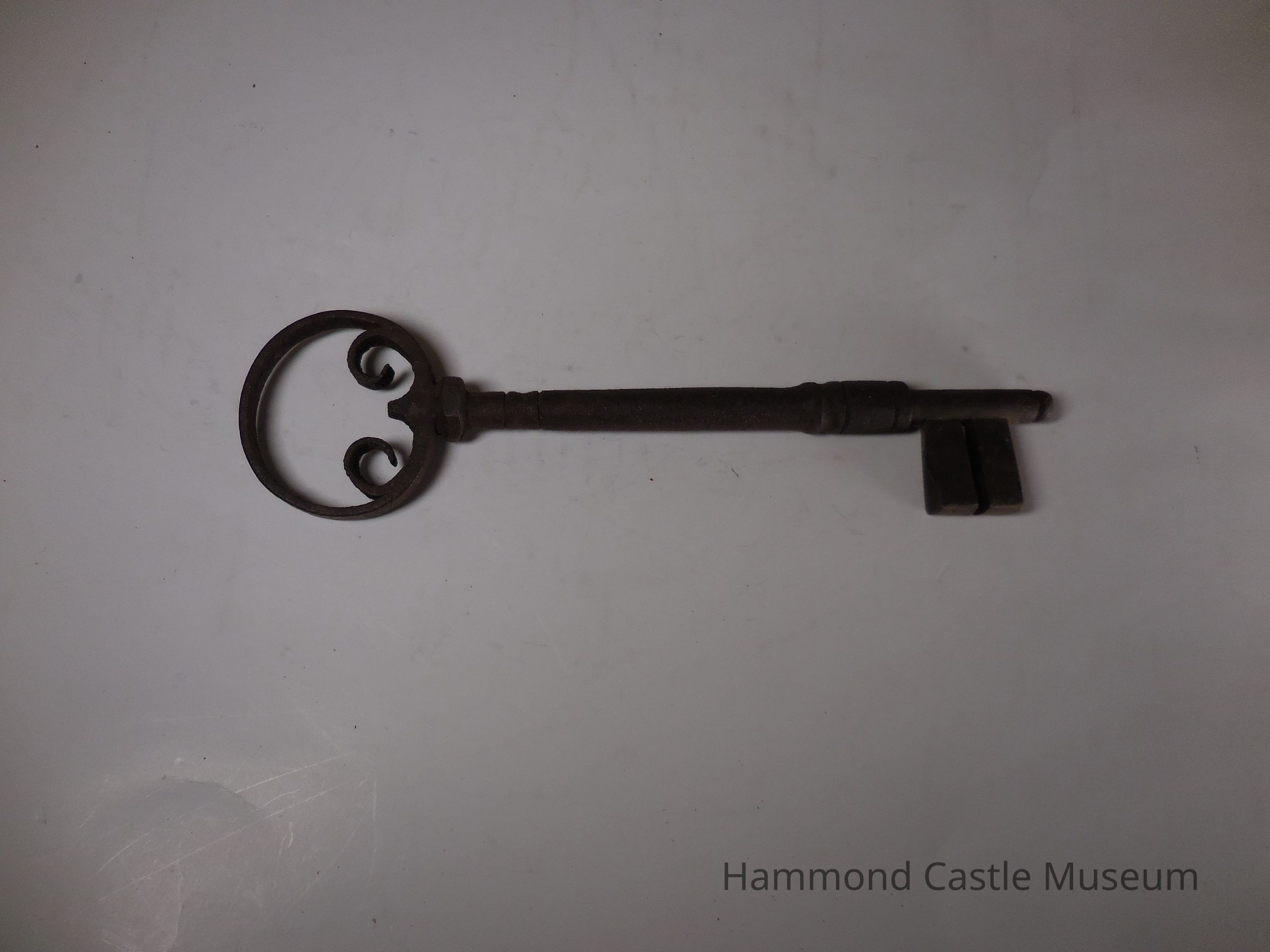 Key to Iron Plated and Studded Door with 2 Arch Detail. Large key, circular head, shaft extends slightly beyond the bit.