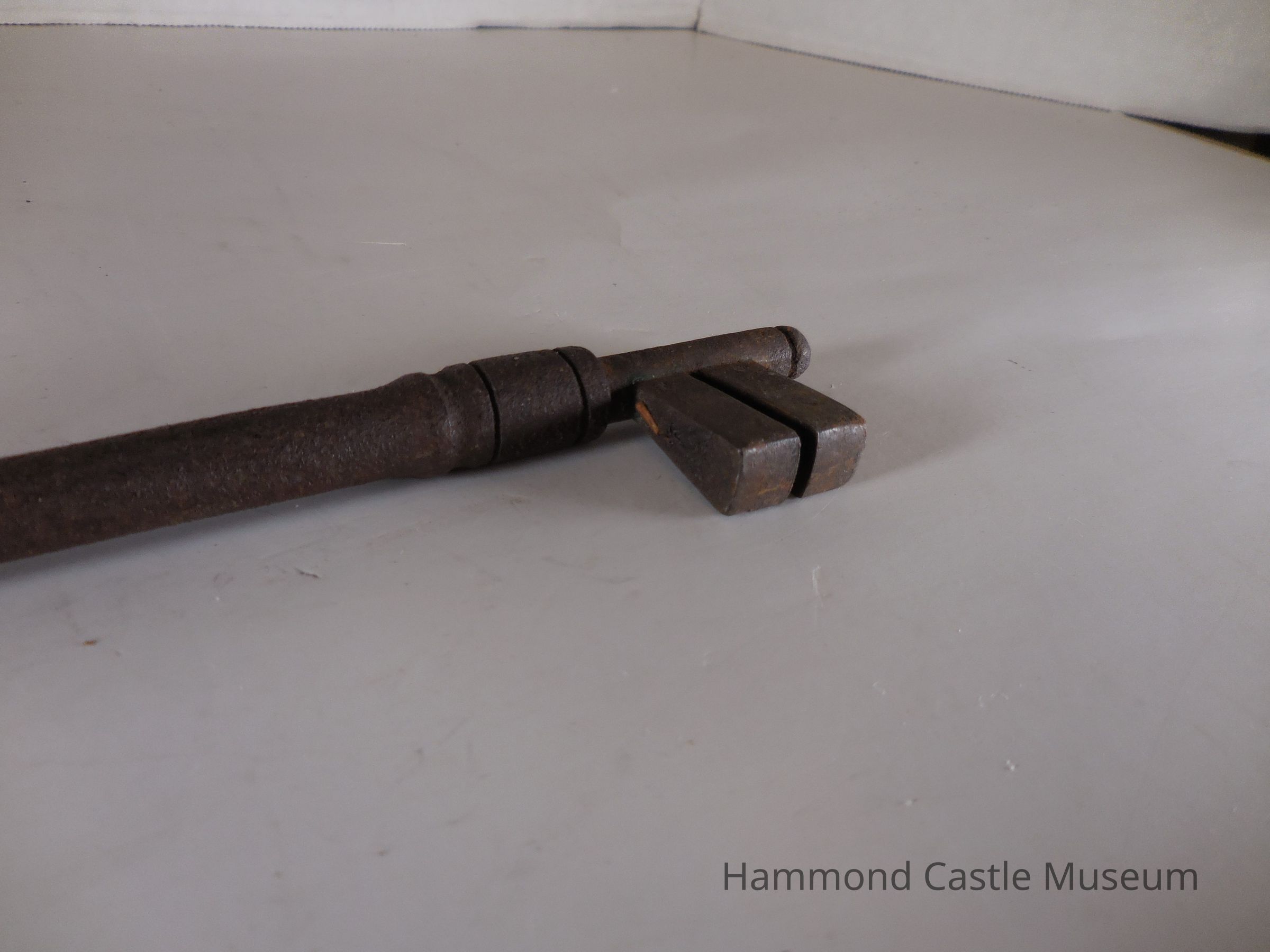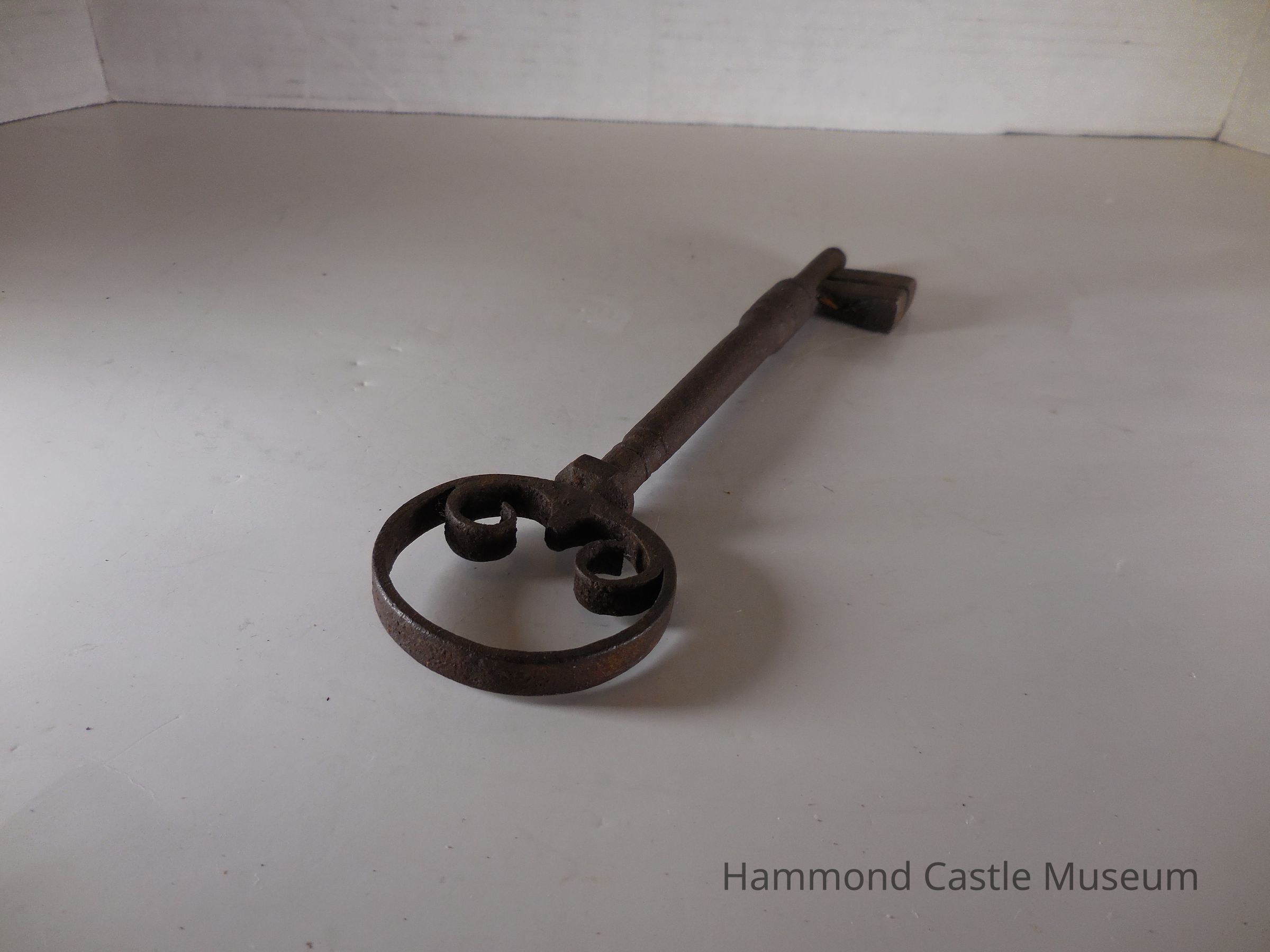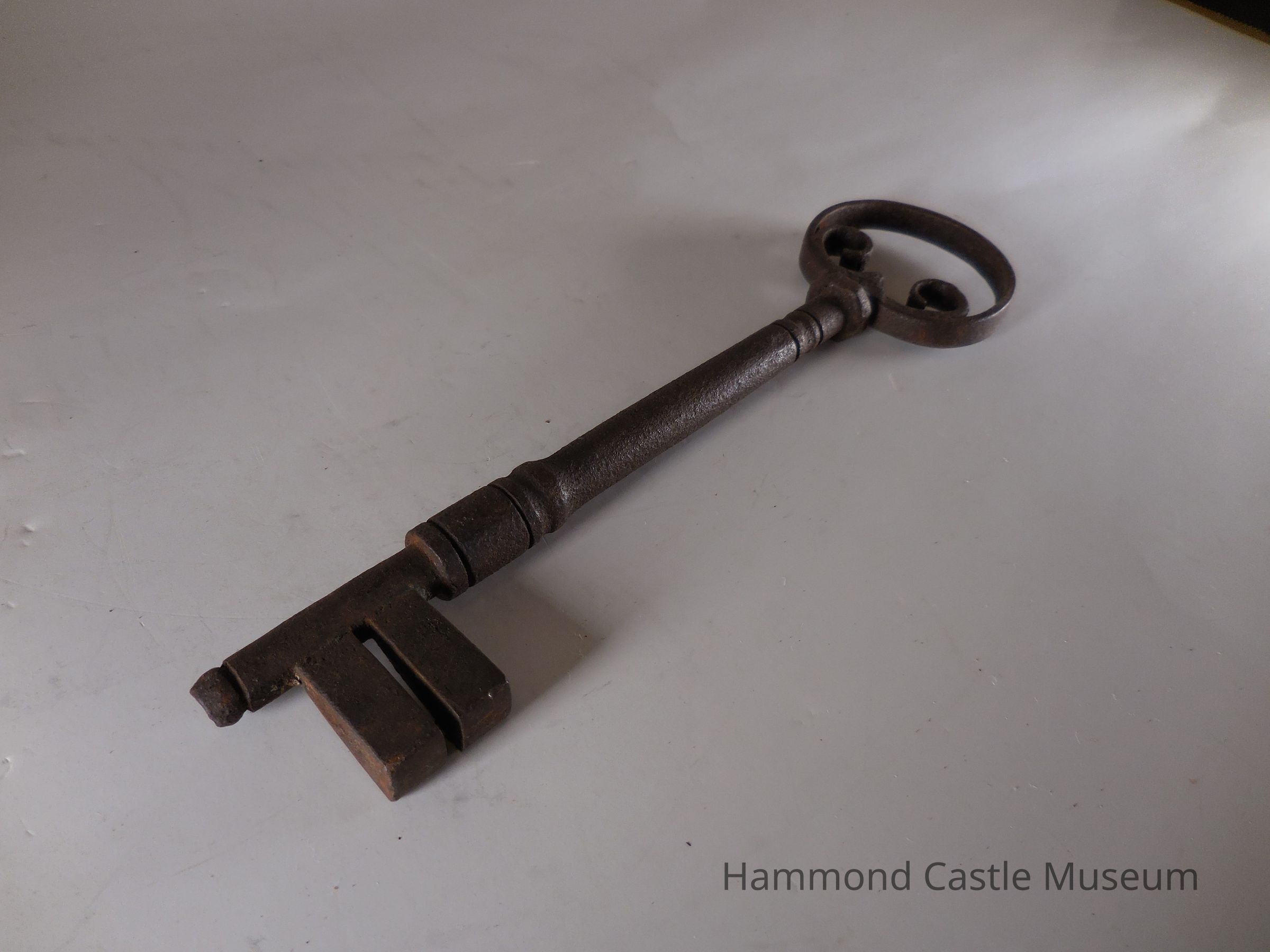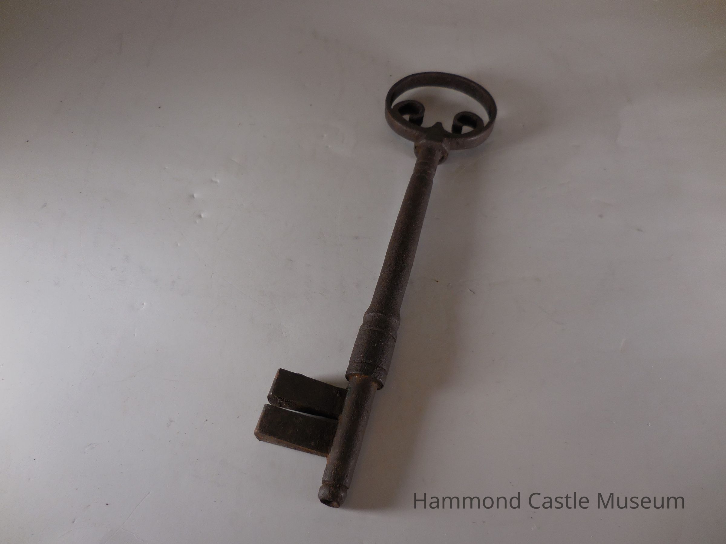 Key to Iron Plated and Studded Door with 2 Arch Detail. Large key, circular head, shaft extends slightly beyond the bit.