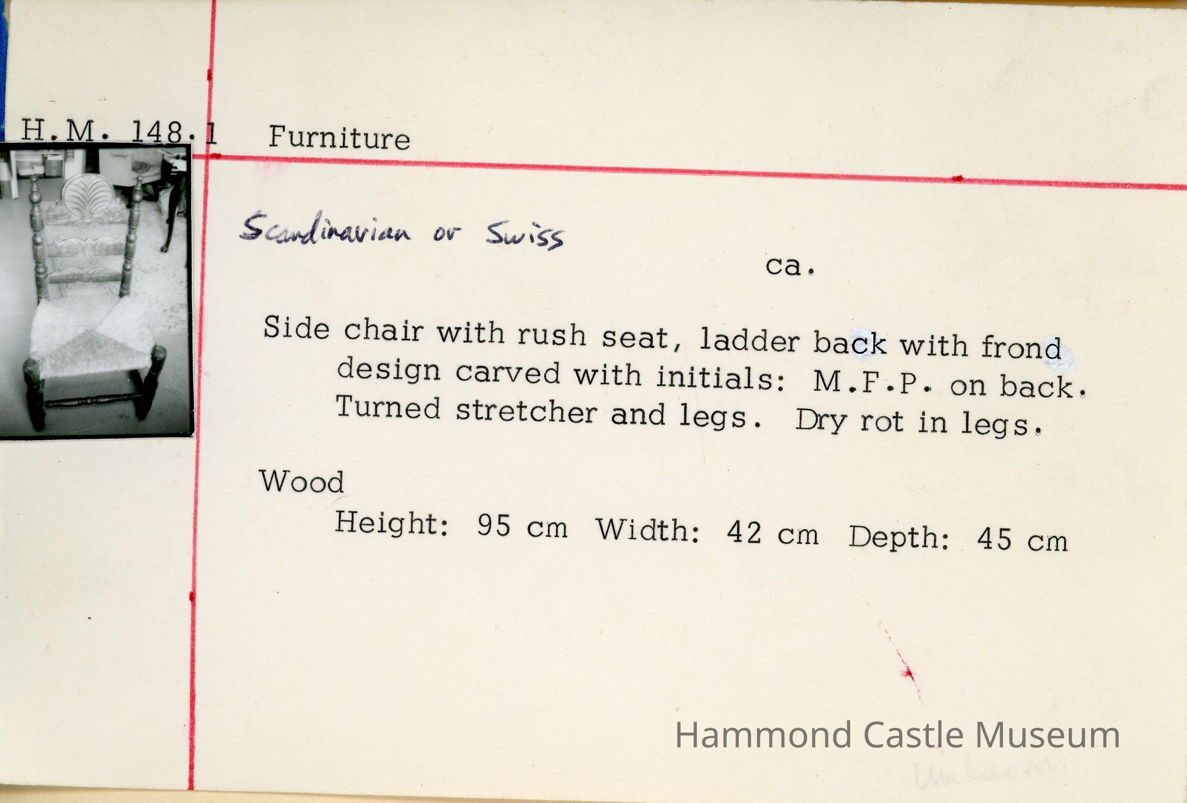 Side chair with rush seat, ladder back with front pineapple design carved with initials: M.F.P. on back. Turned stretcher and legs. Dry rot in legs.