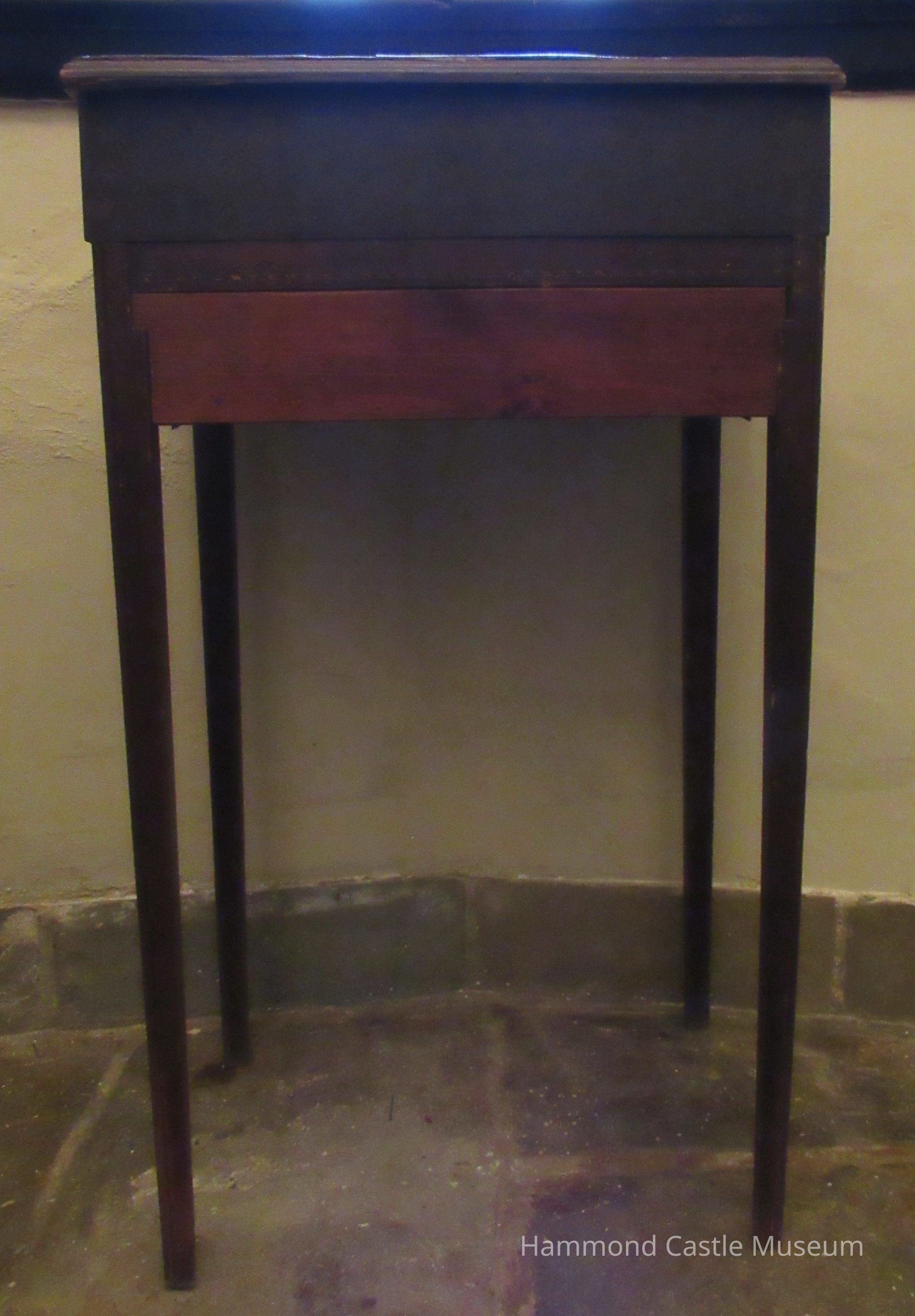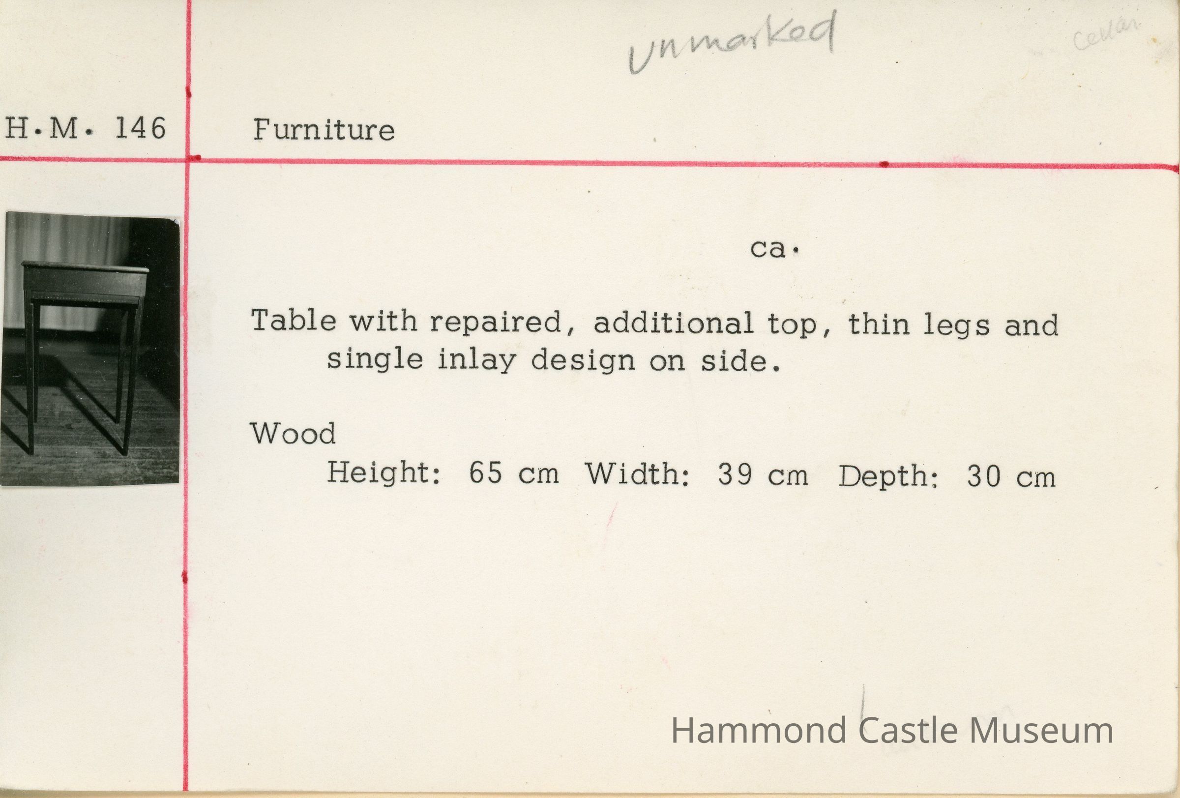 Table with repaired, additional top, thin legs and single inlay design on side.