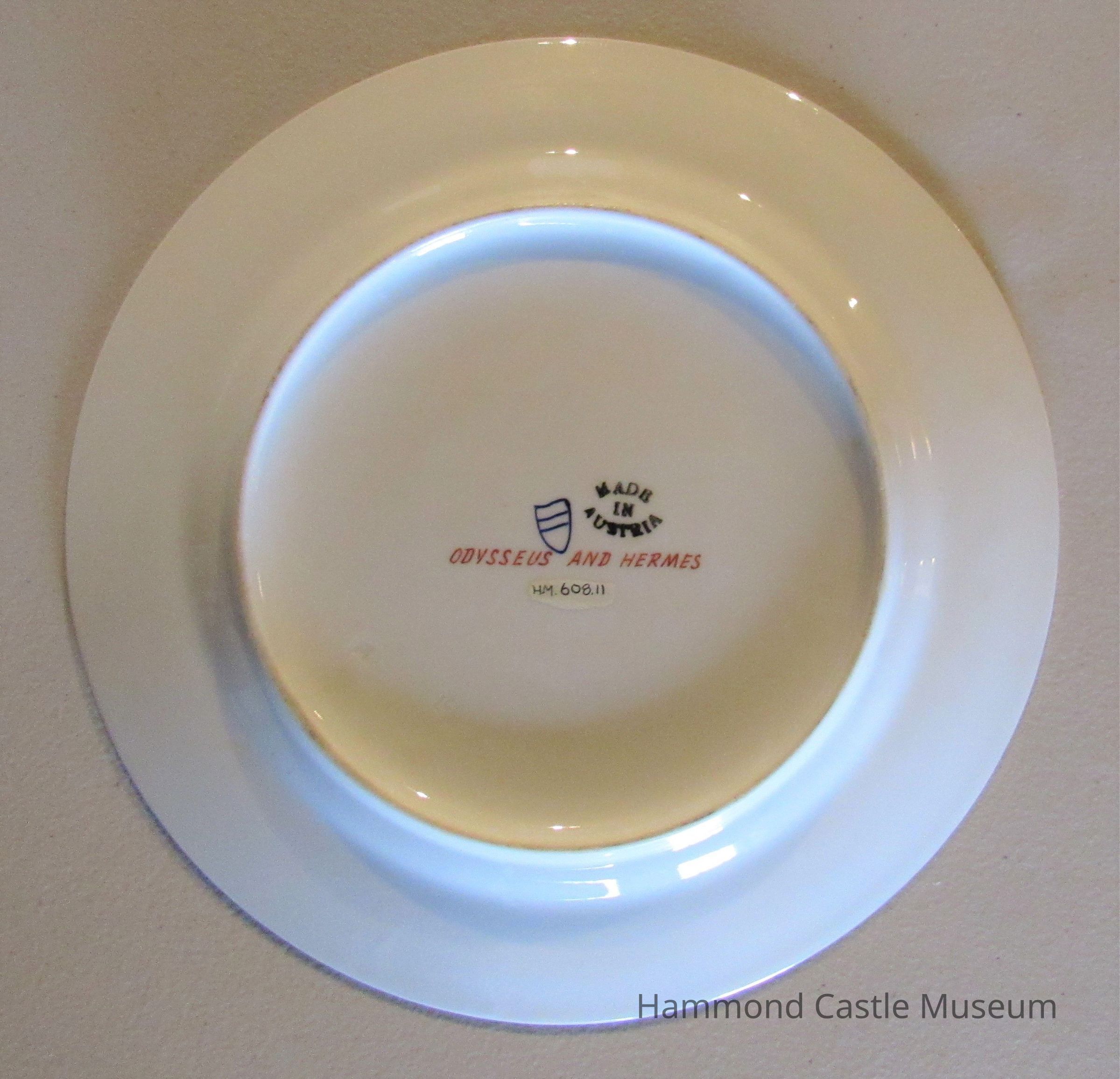 Mid-19th century Austrian hard paste ceramic plate with Classical hand painted scene. Each plate hand signed. Border of lavender and gilt. Stamped "Vienna, Austria" with hand painted marking in blue.