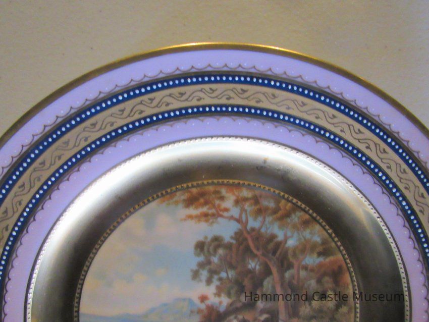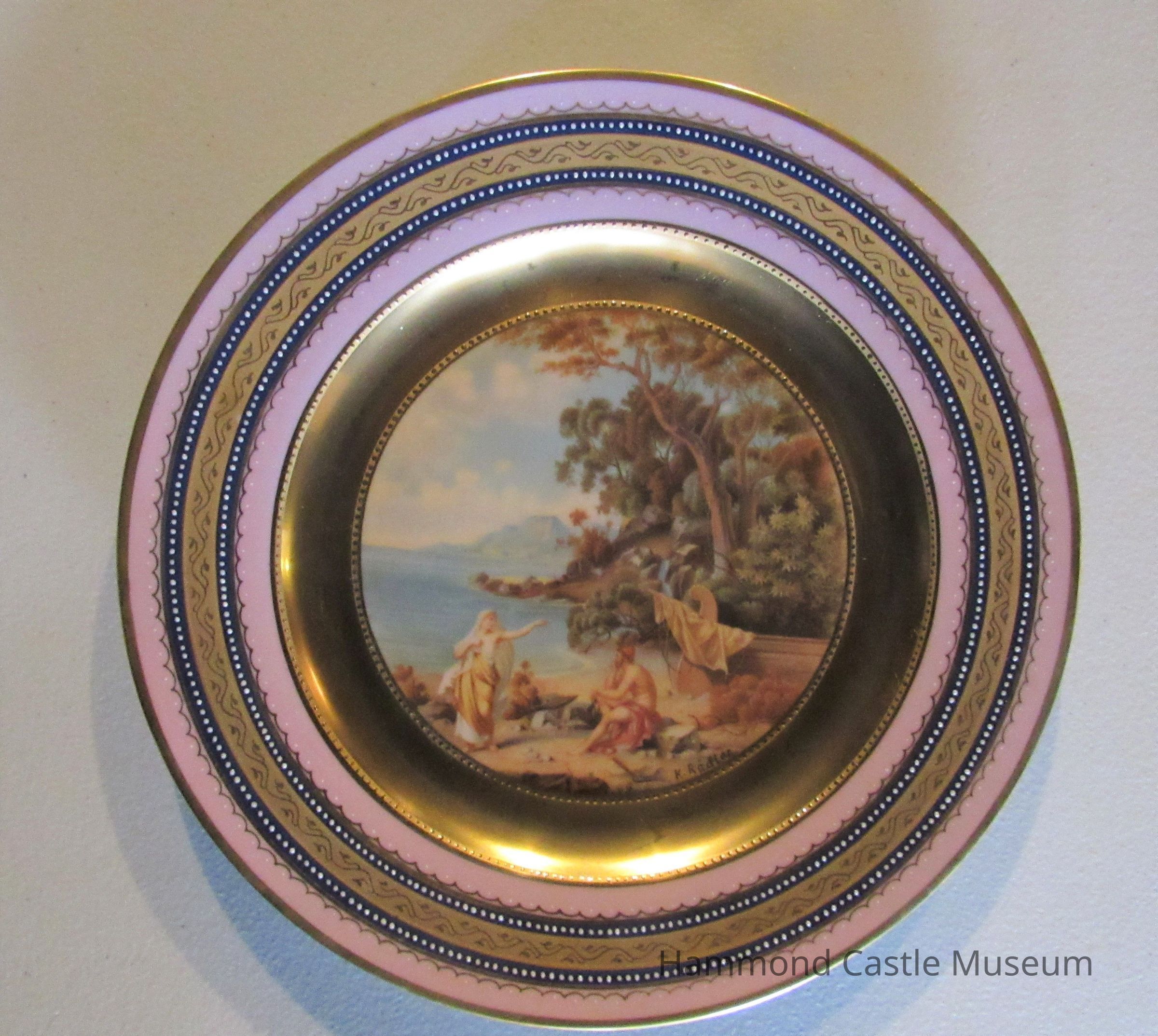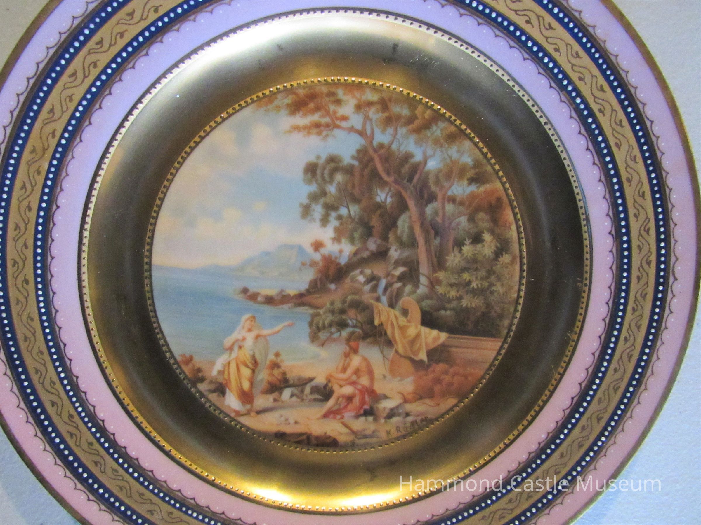 Mid-19th century Austrian hard paste ceramic plate with Classical hand painted scene. Each plate hand signed. Border of lavender and gilt. Stamped "Vienna, Austria" with hand painted marking in blue.