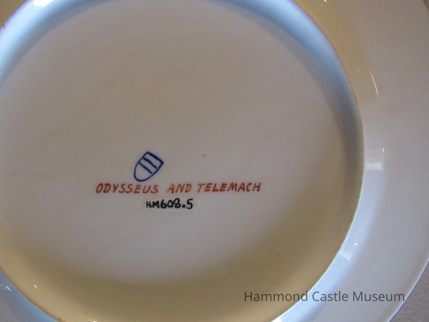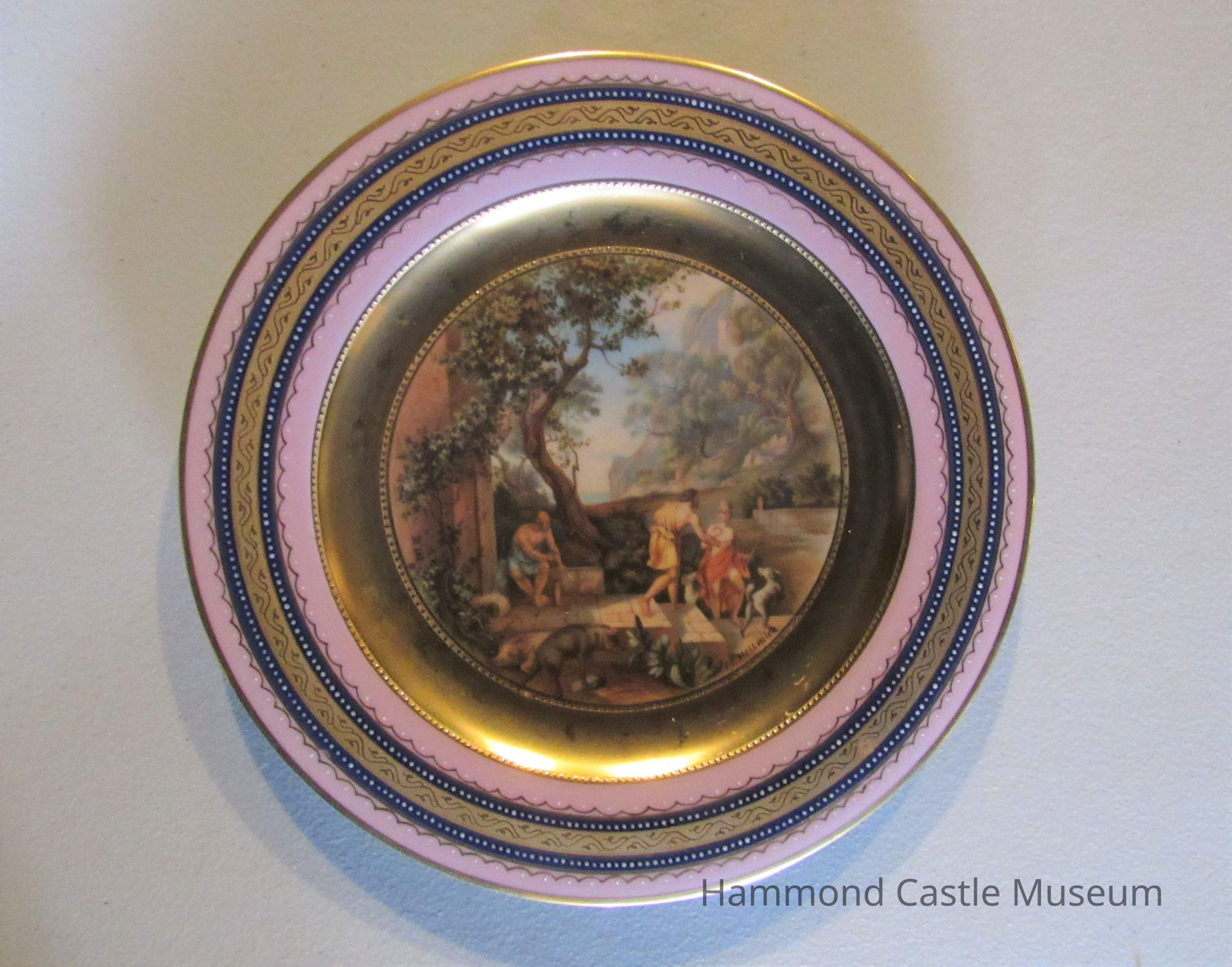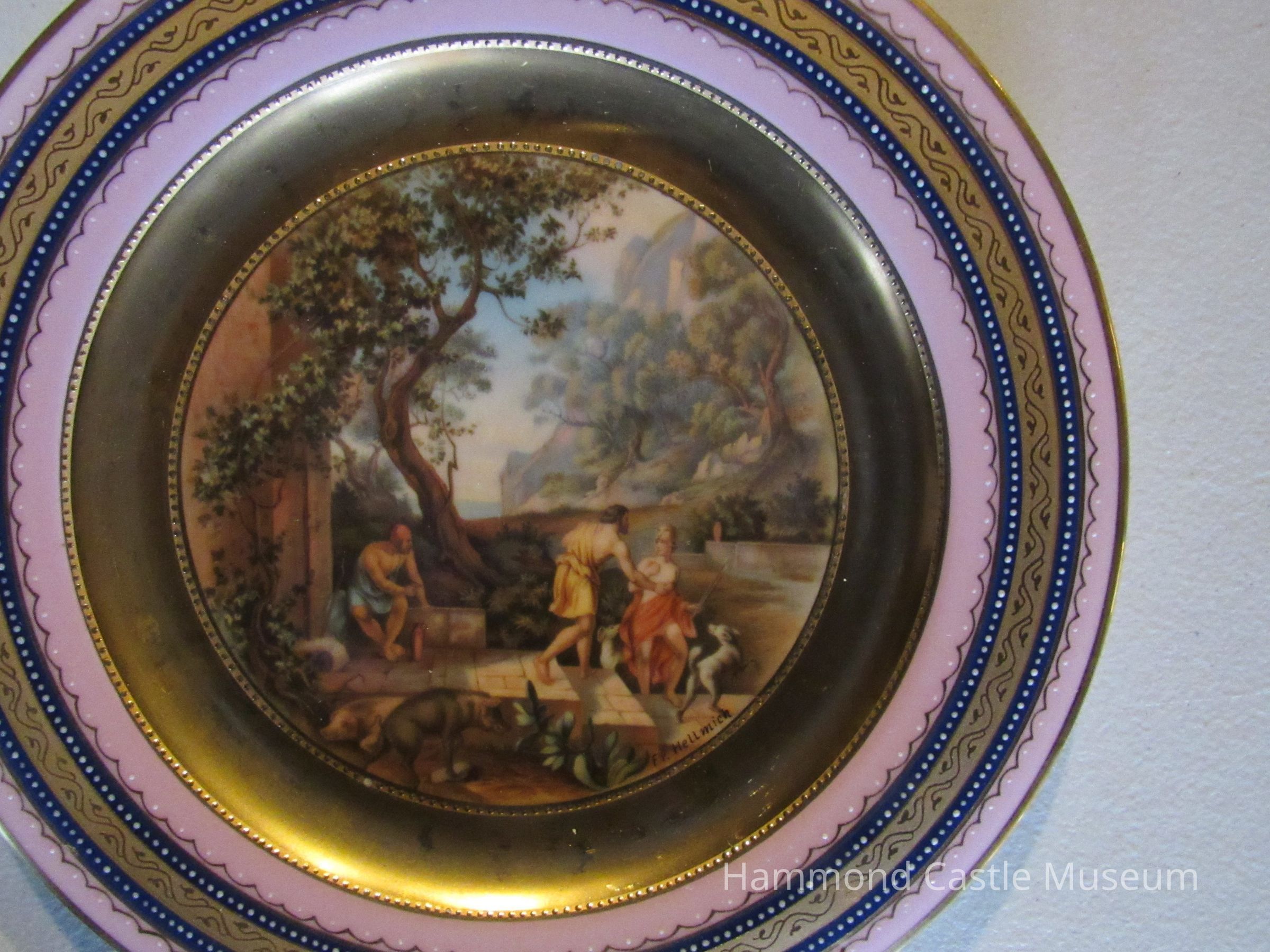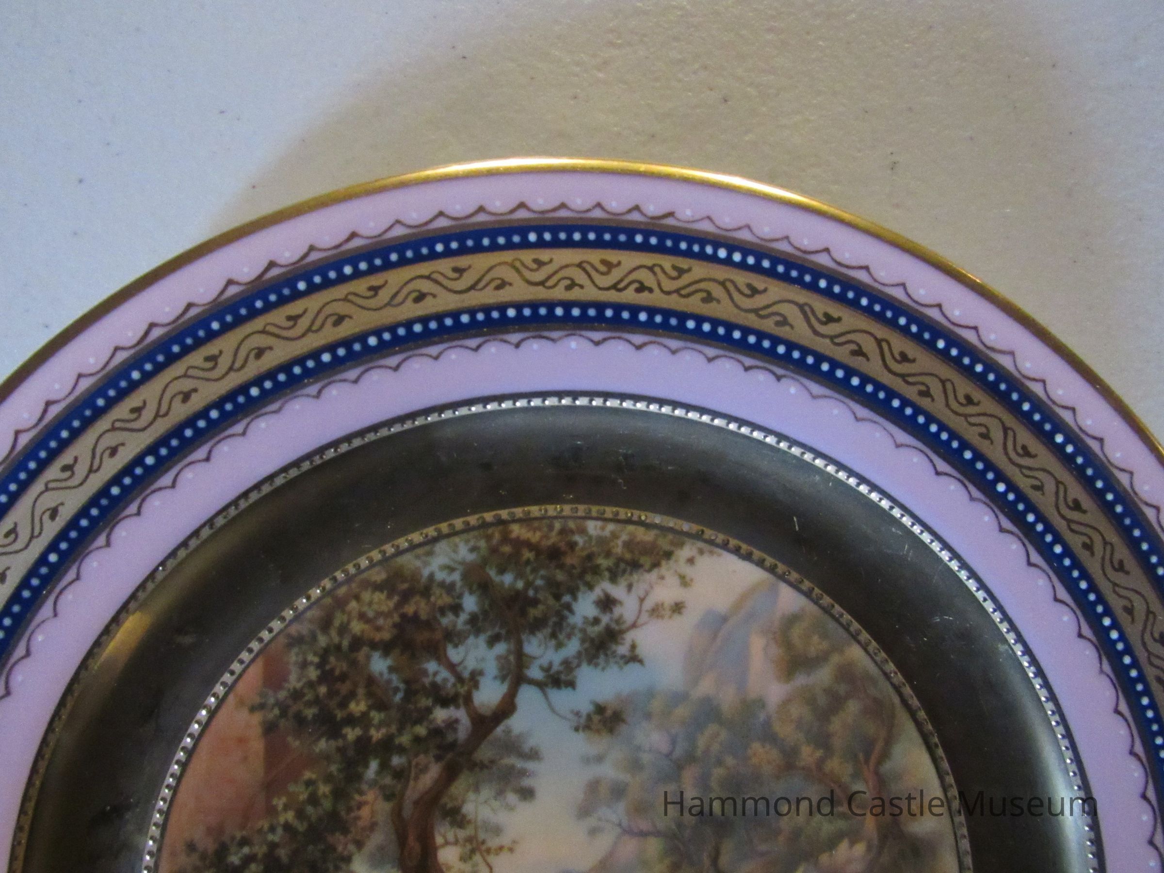 Mid-19th century Austrian hard paste ceramic plate with Classical hand painted scene. Each plate hand signed. Border of lavender and gilt. Stamped "Vienna, Austria" with hand painted marking in blue.