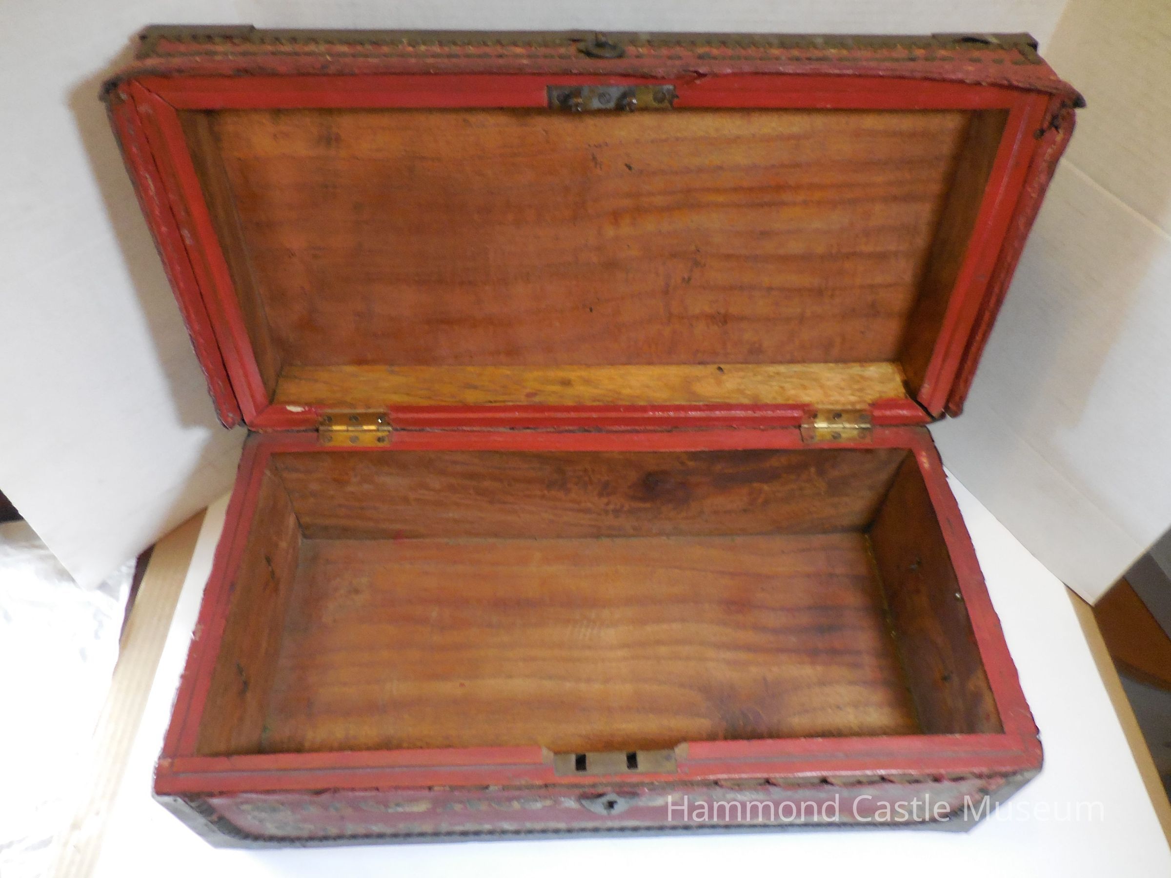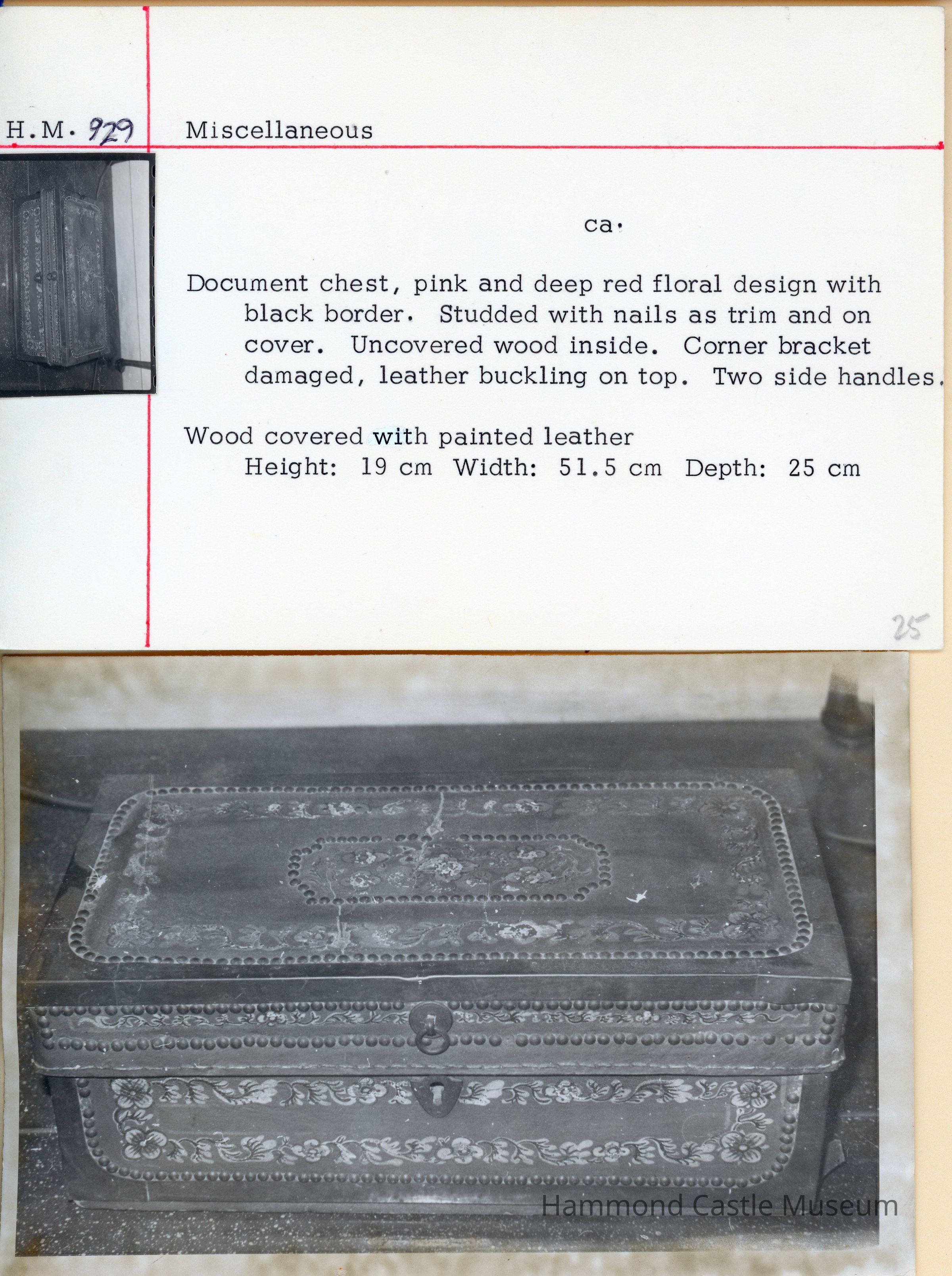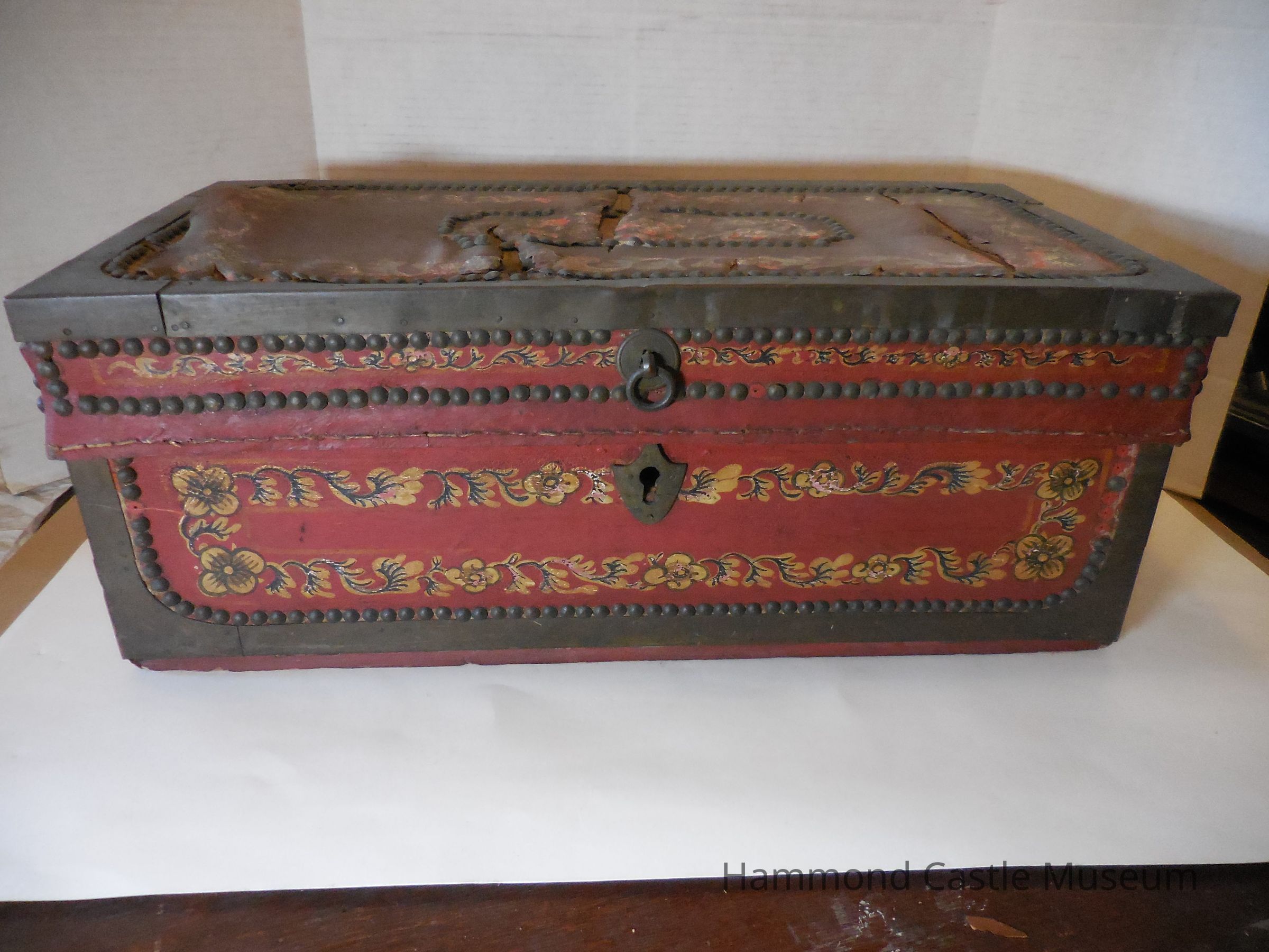 Leather document chest, pink and deep red floral design with black border. Studded with nails as trim and on cover. Uncovered wood inside. Corner bracket damaged, leather buckling on top. Two side handles.