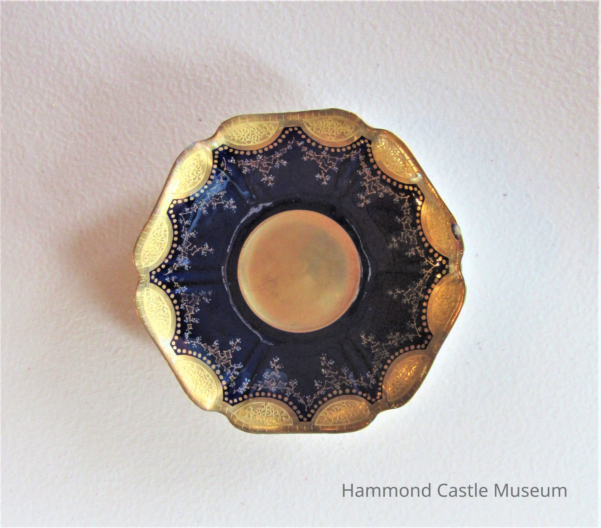 b- saucer signed H. Mehuts Dinards on each underside; blue ground with gold central medallion and scalloped decoration.