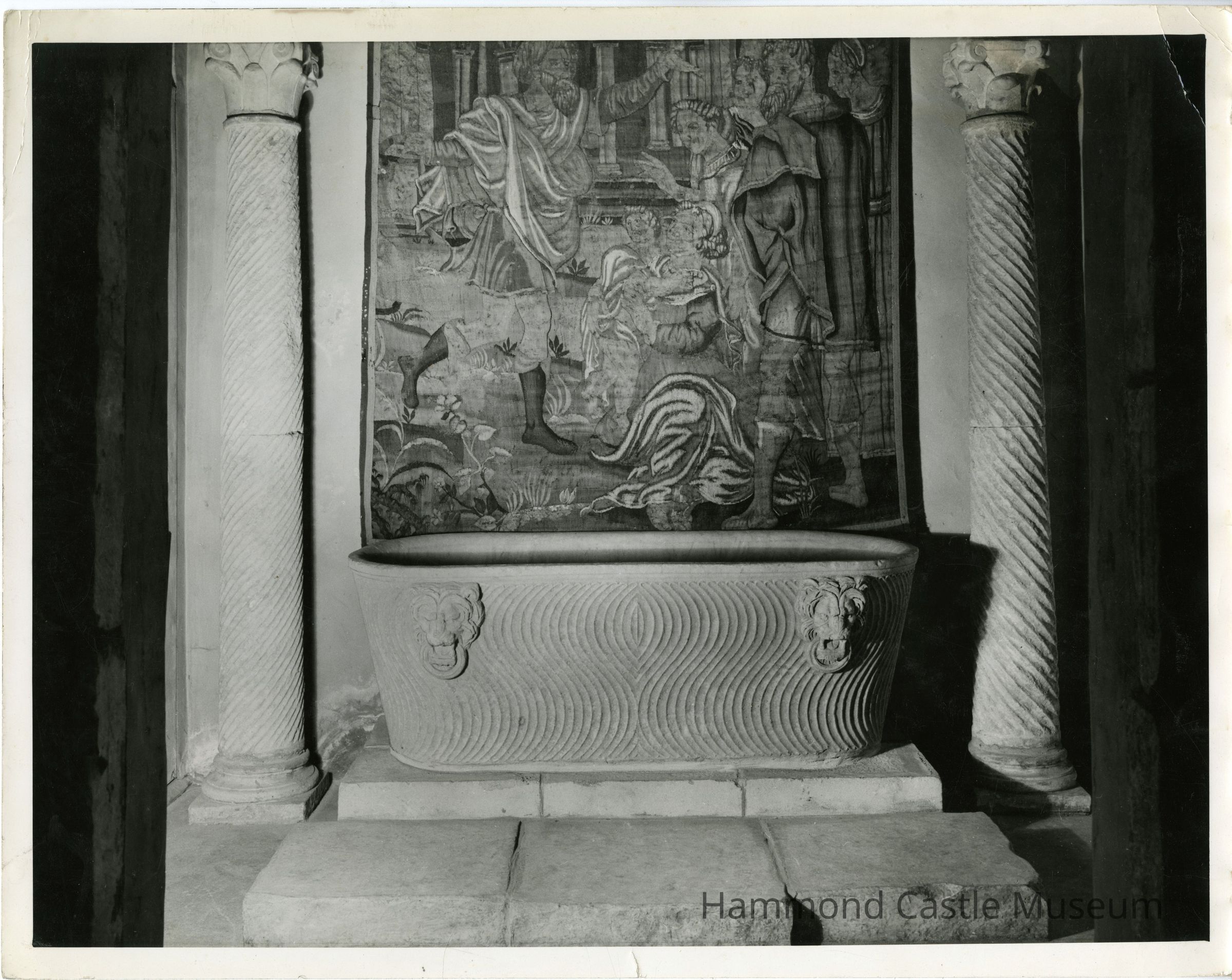 Photo of Lion-Sarcophagus Bathtub in 2nd Gallery with tapestry above