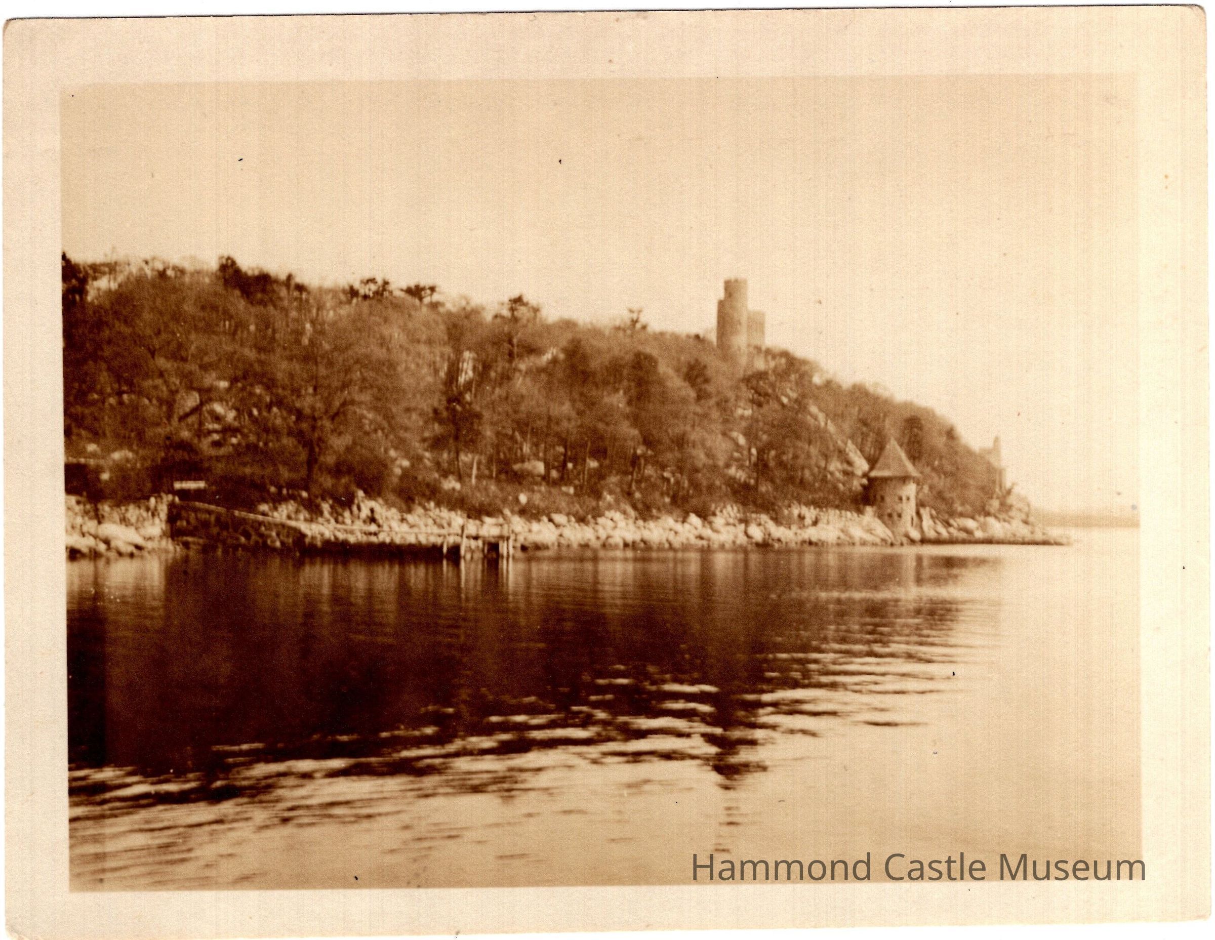 Photo of Lookout Hill Estate, view from cove (1924-1926) Guest Tower and boat house visible