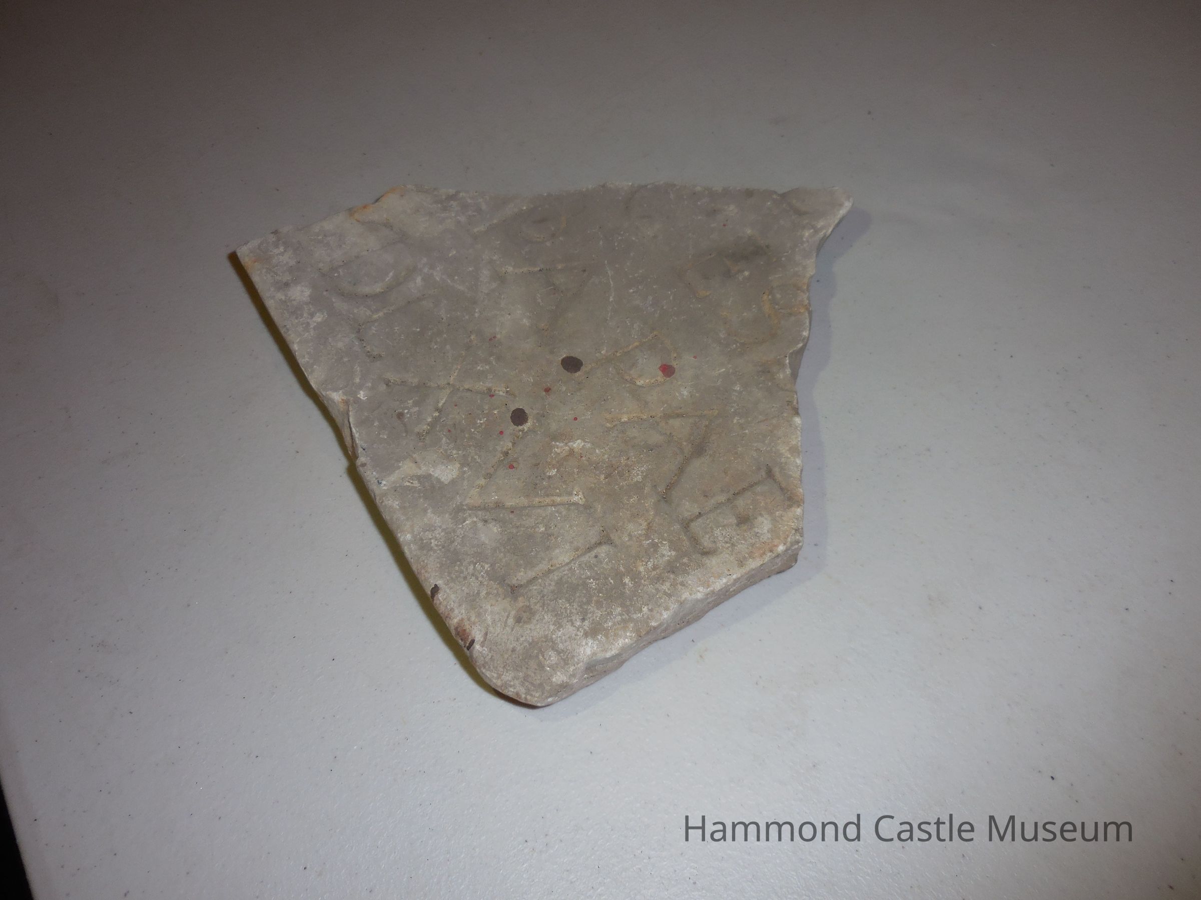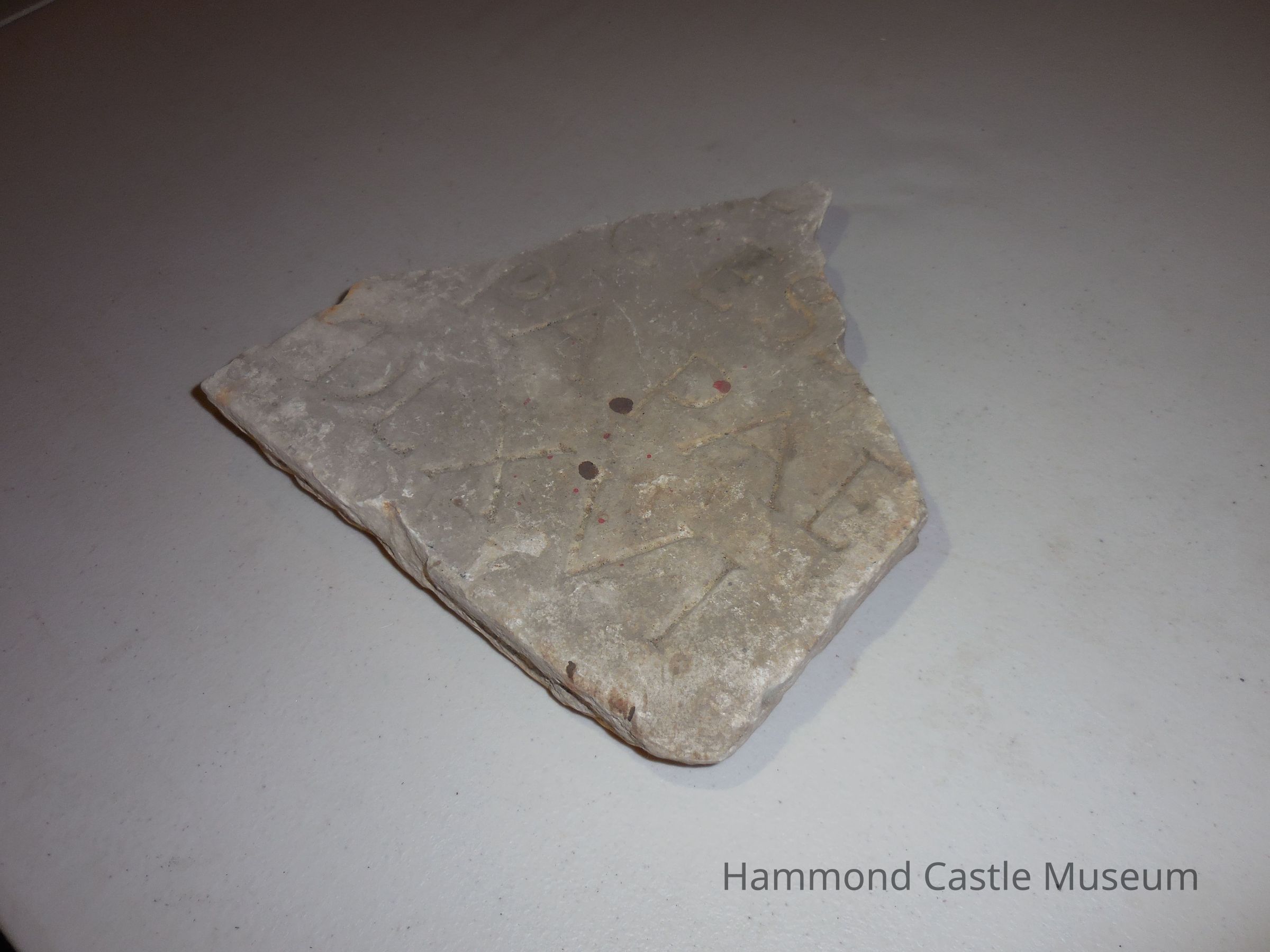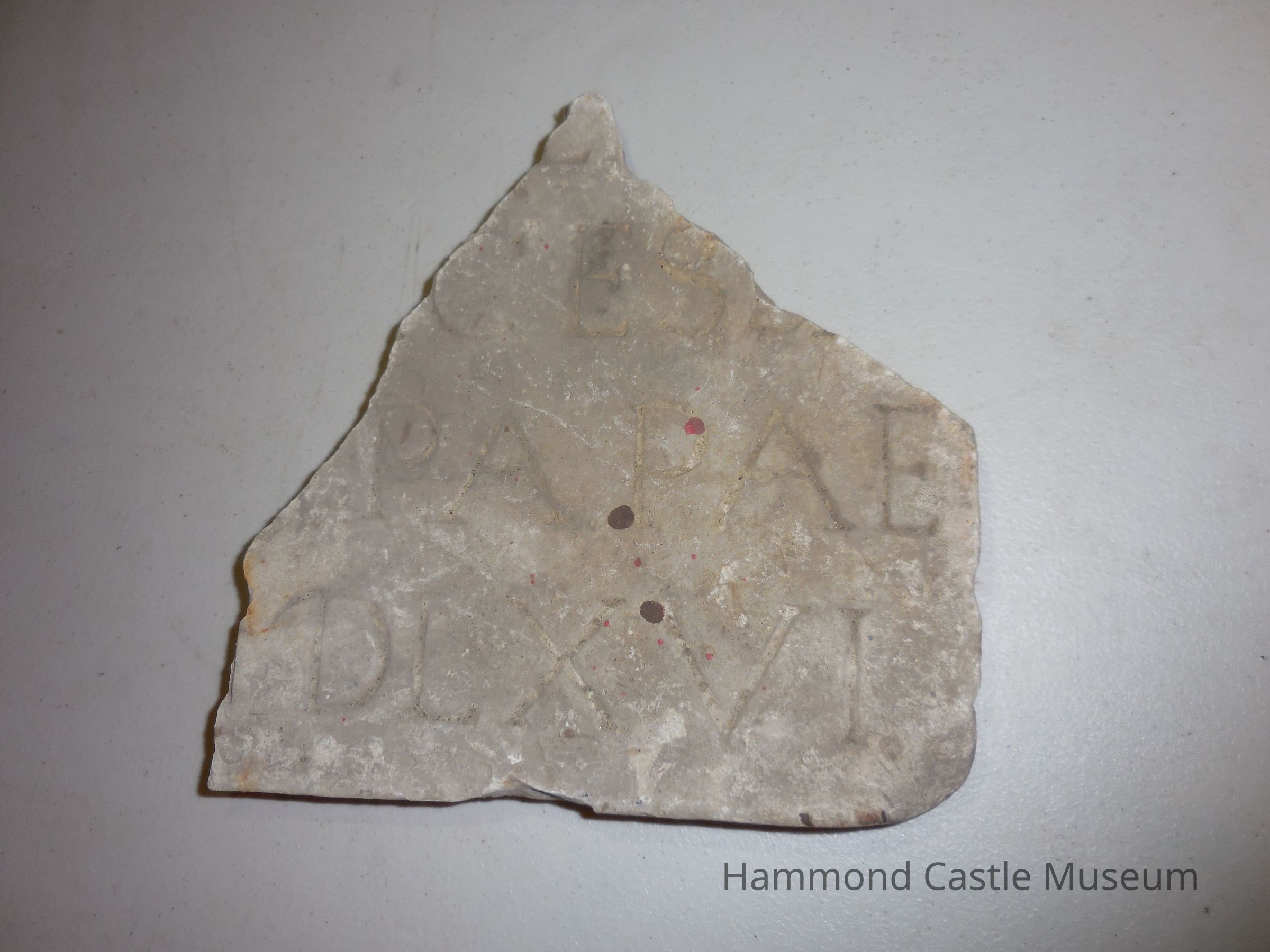 Marble fragment with inscription (in record-storage closet) 'Reportedly Roman, but possibly forgery inscribed - A PAPAE DLXVI * no translation