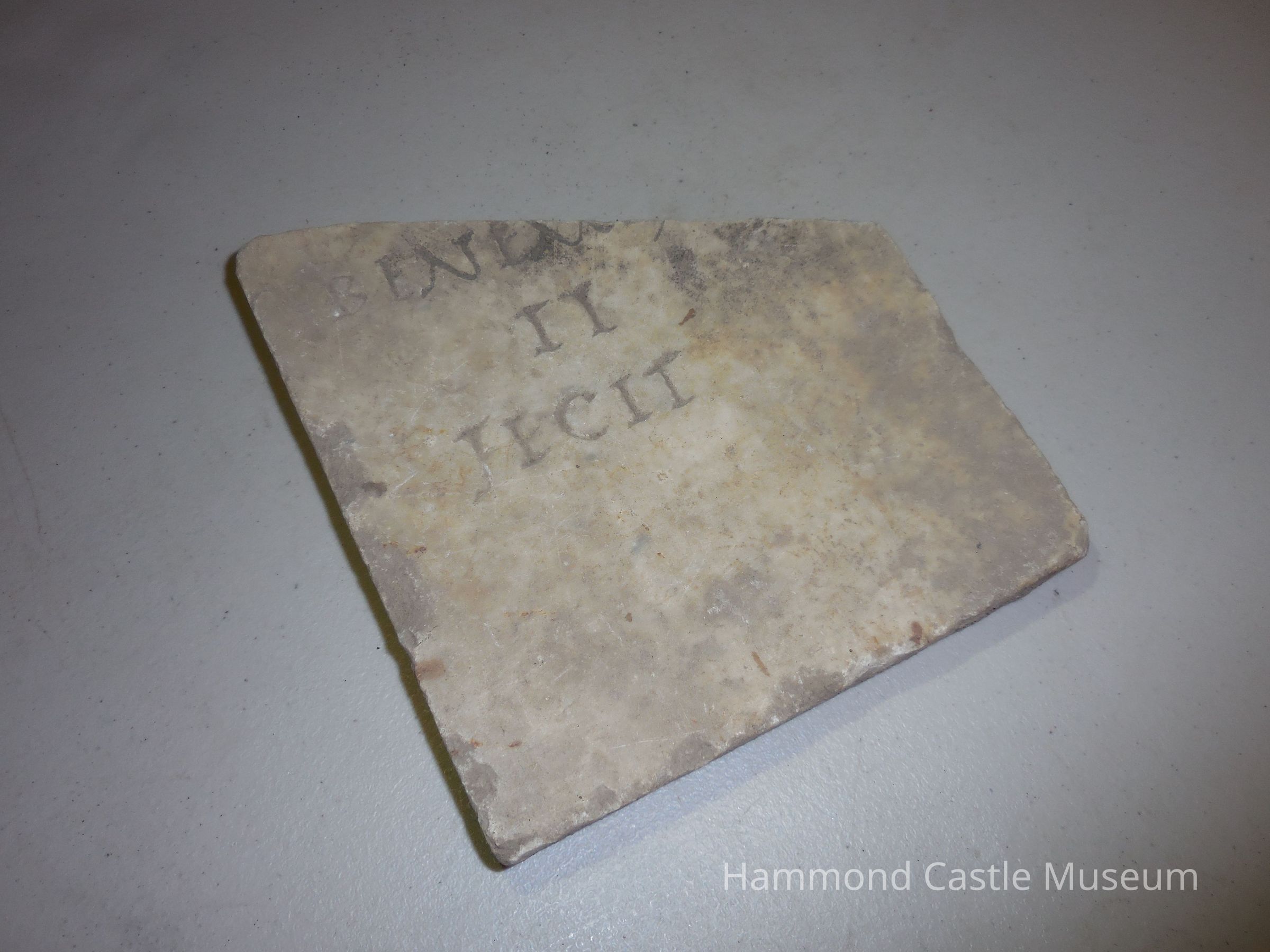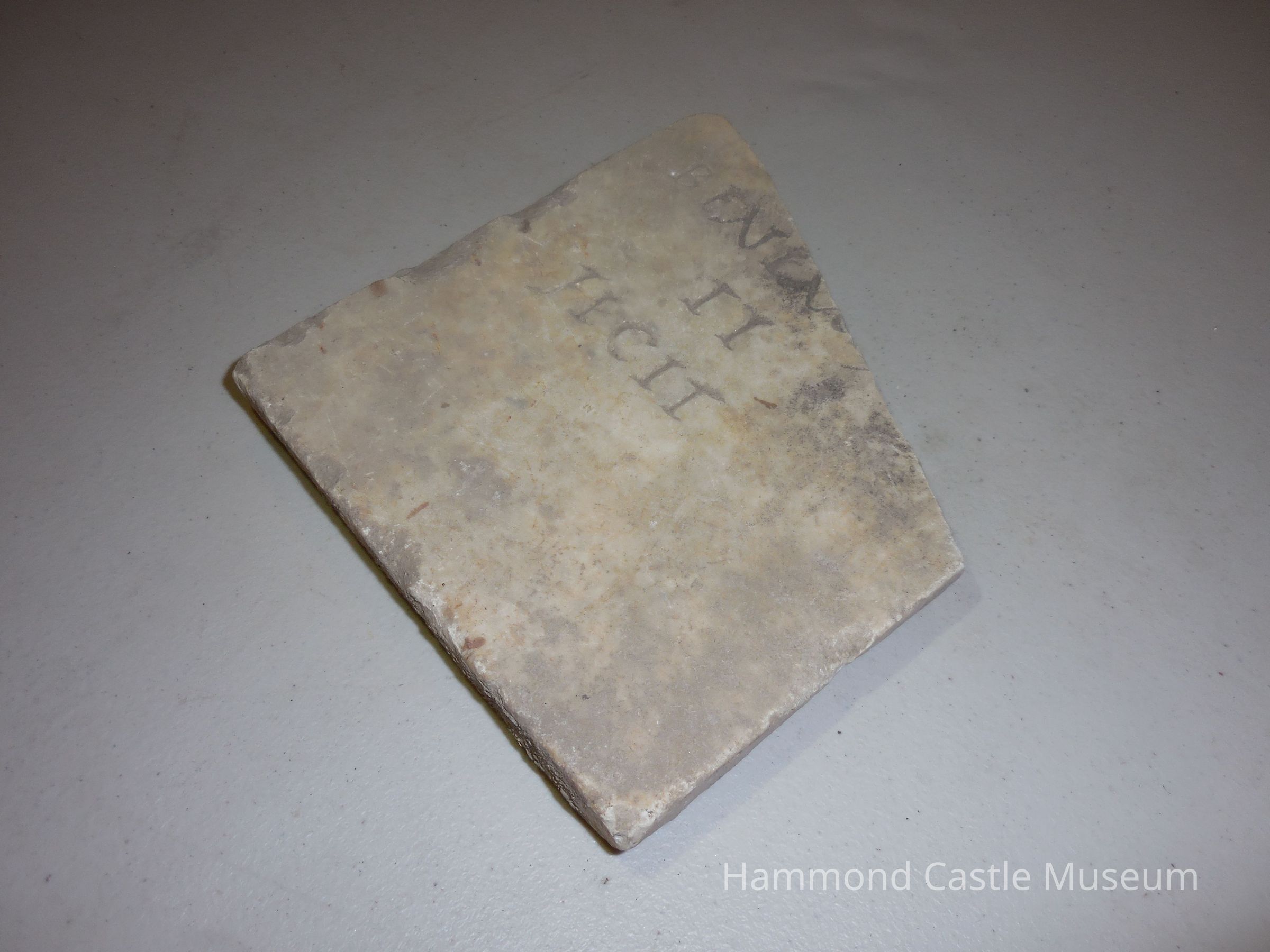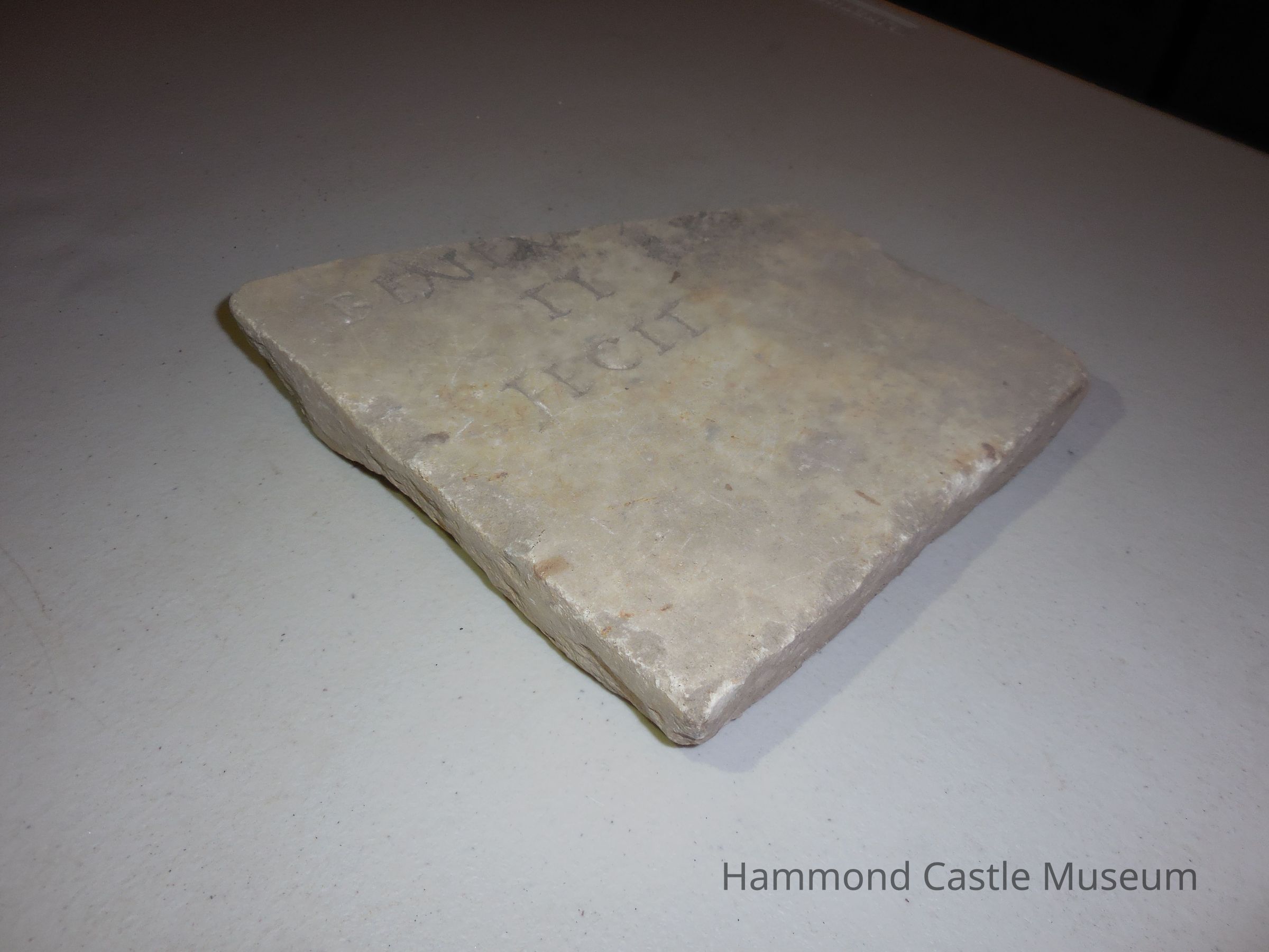 Marble fragment with inscription (in record-storage closet) 'Reportedly Roman, but possibly forgery inscribed - ENL II TECIT * no translation
