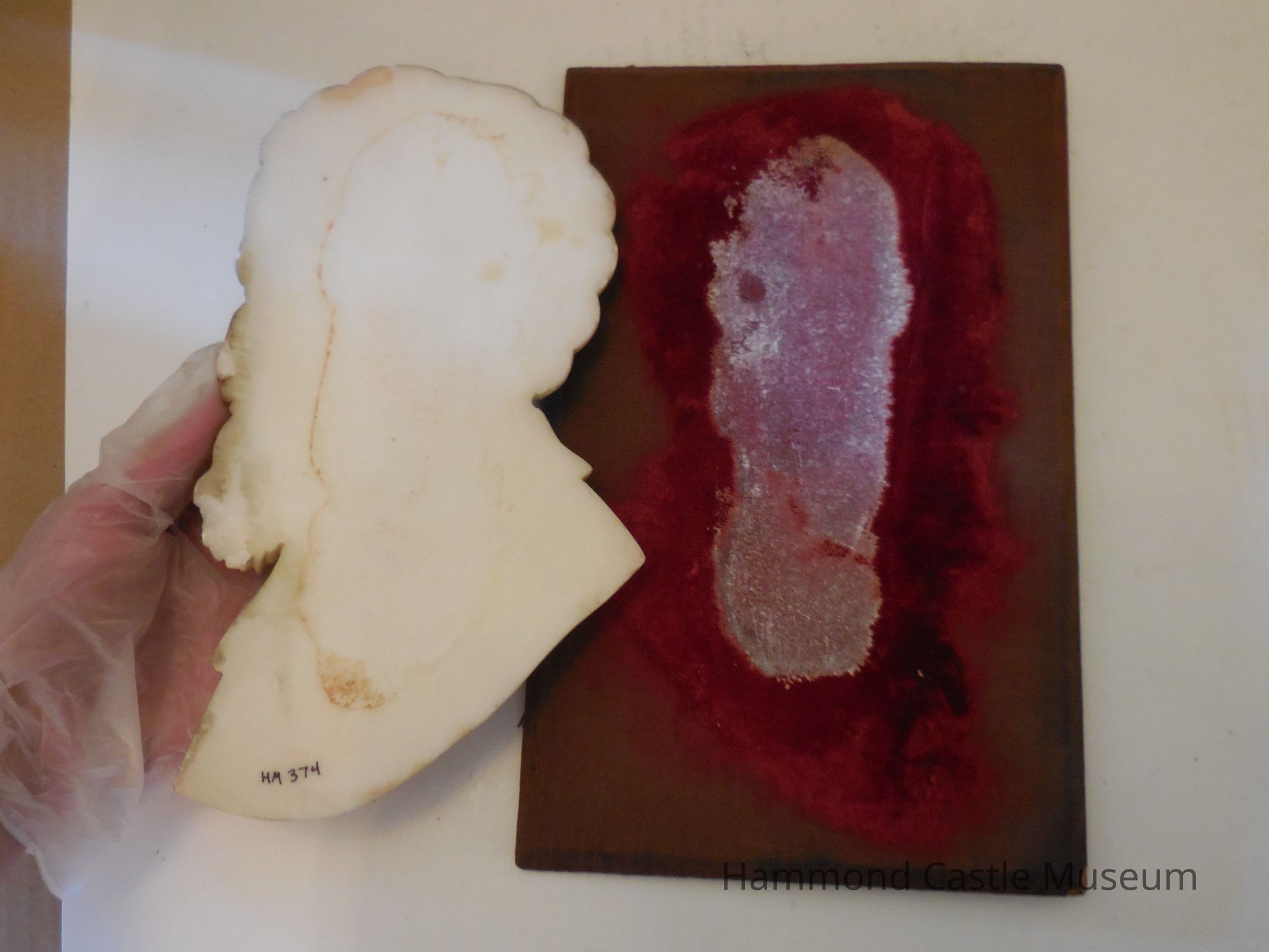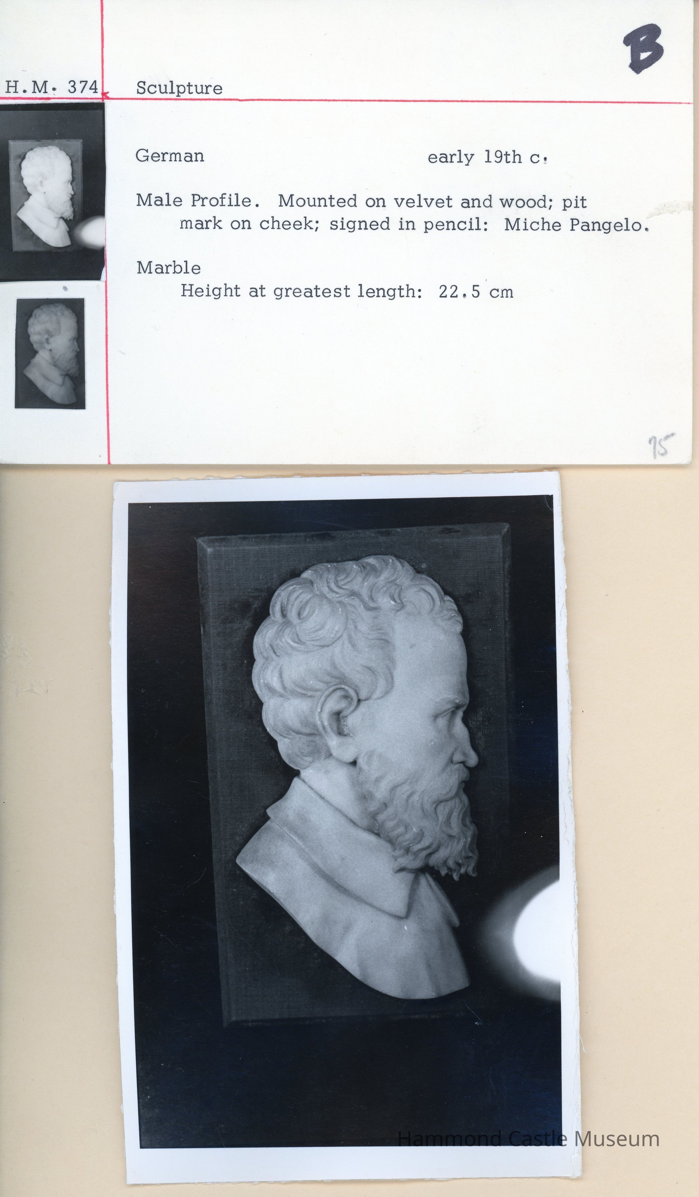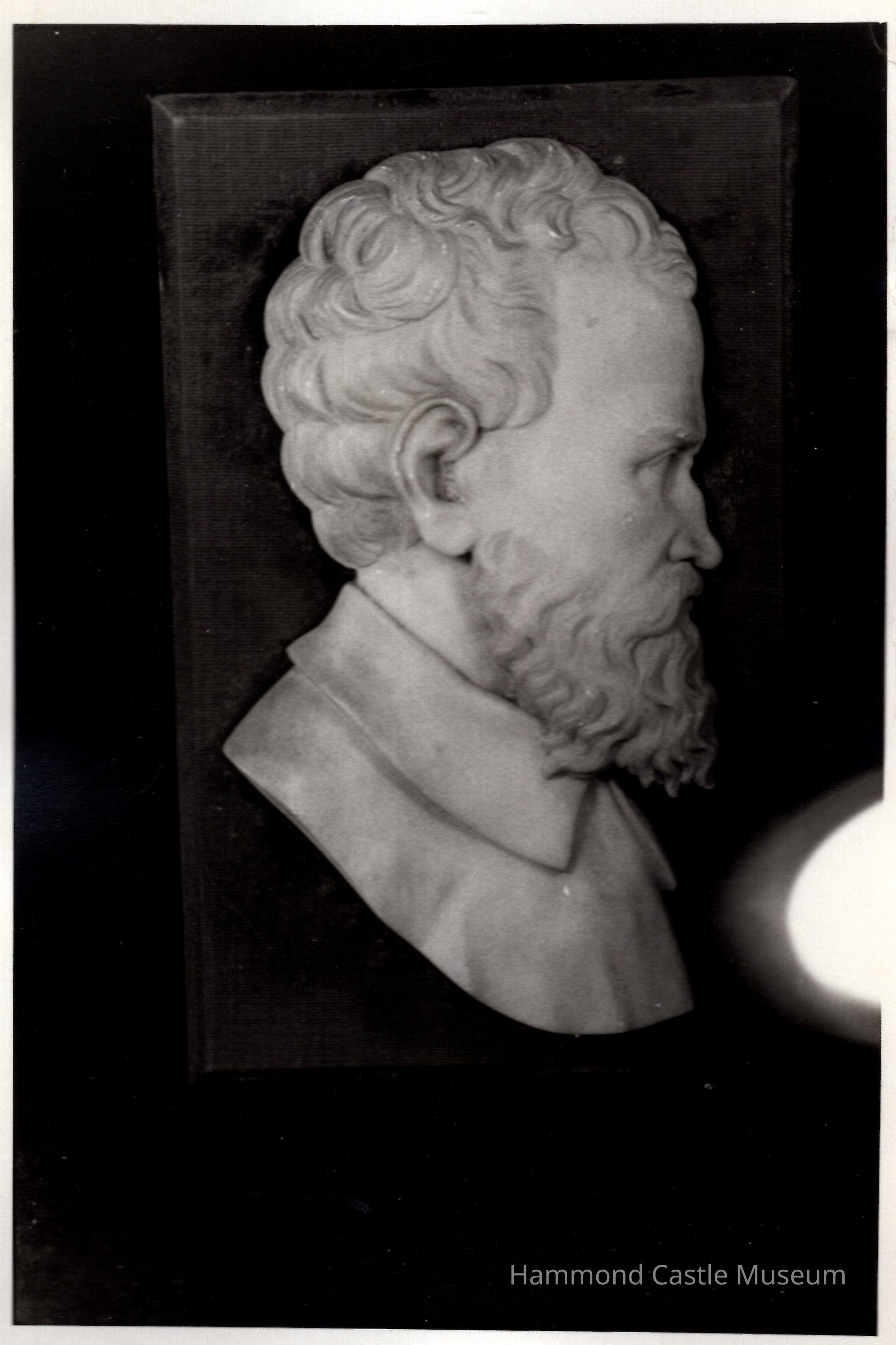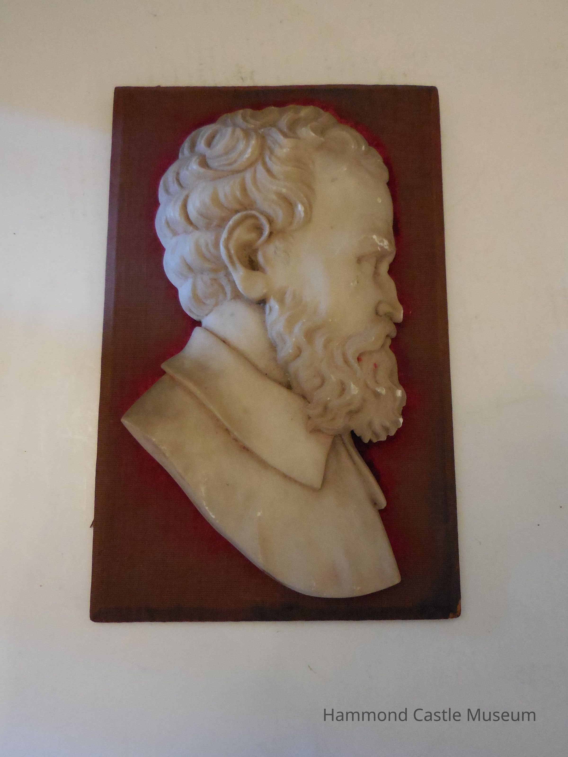 Marble profile of artist Michelangelo (written in pencil on bottom) mounted on velvet and wood. Pit mark on cheek;