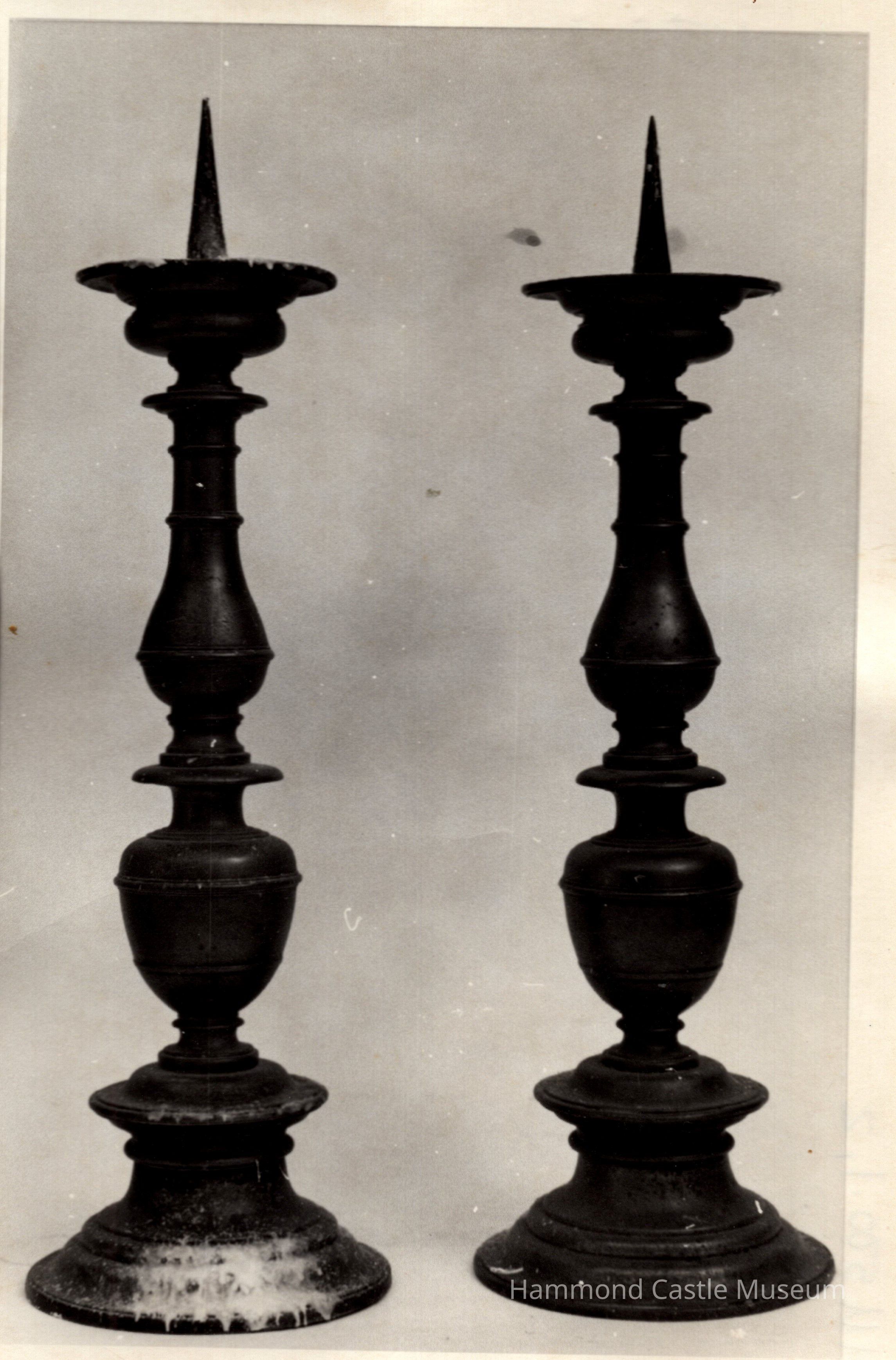 Set of 2 metal candlesticks with spike. Numerous turning. Slight pineapple shape just below center.