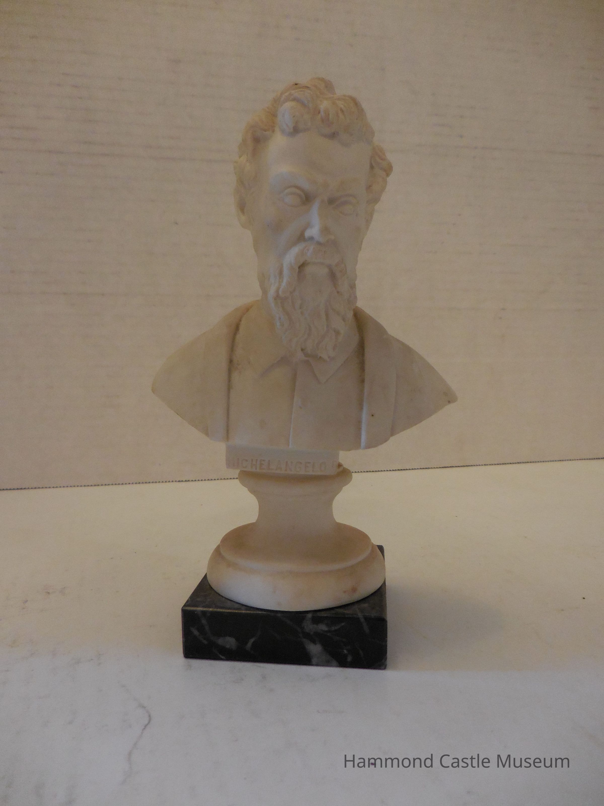 Alabaster bust of Michelangelo mounted on a block of marble. Made by G. Ruggeri in Italy.