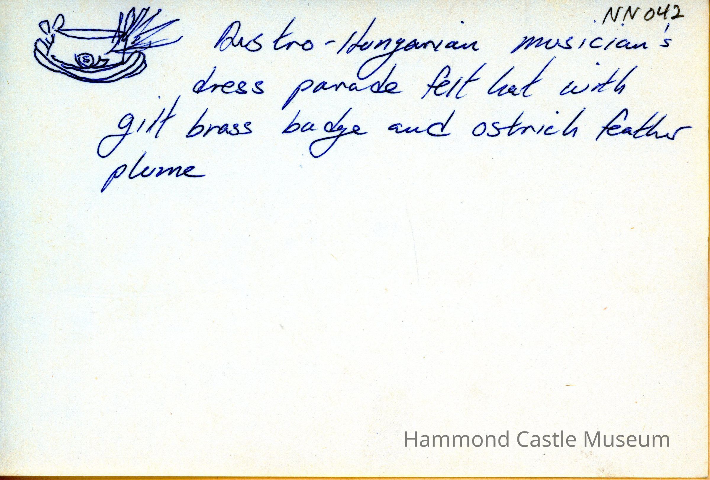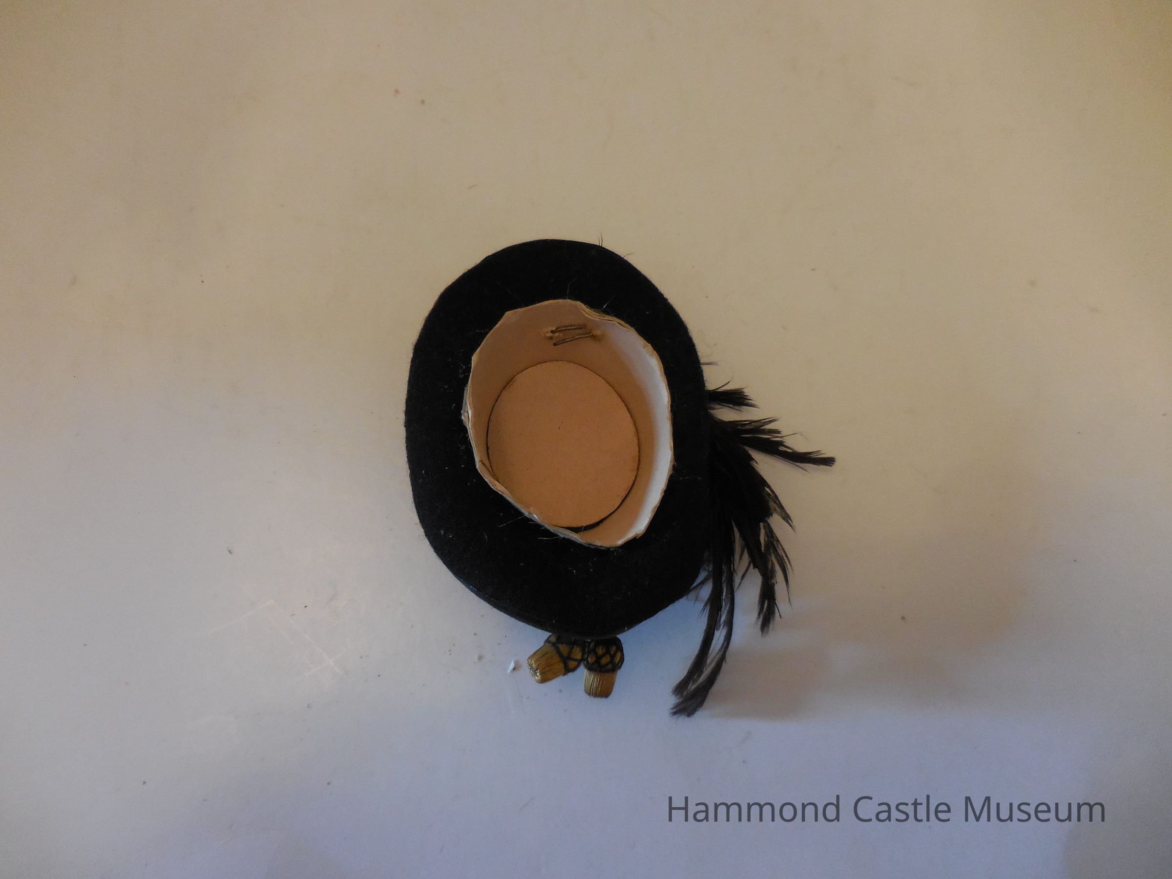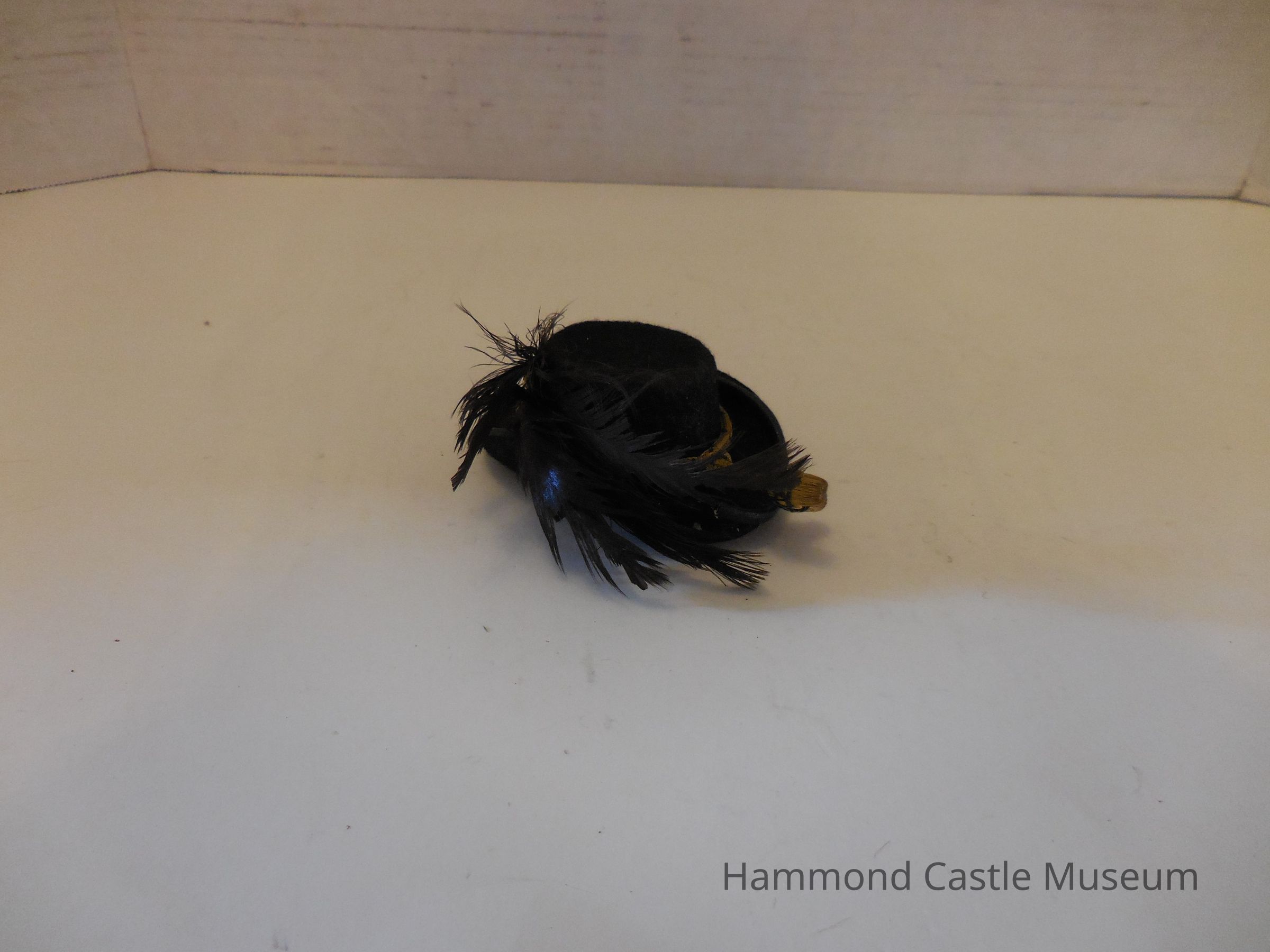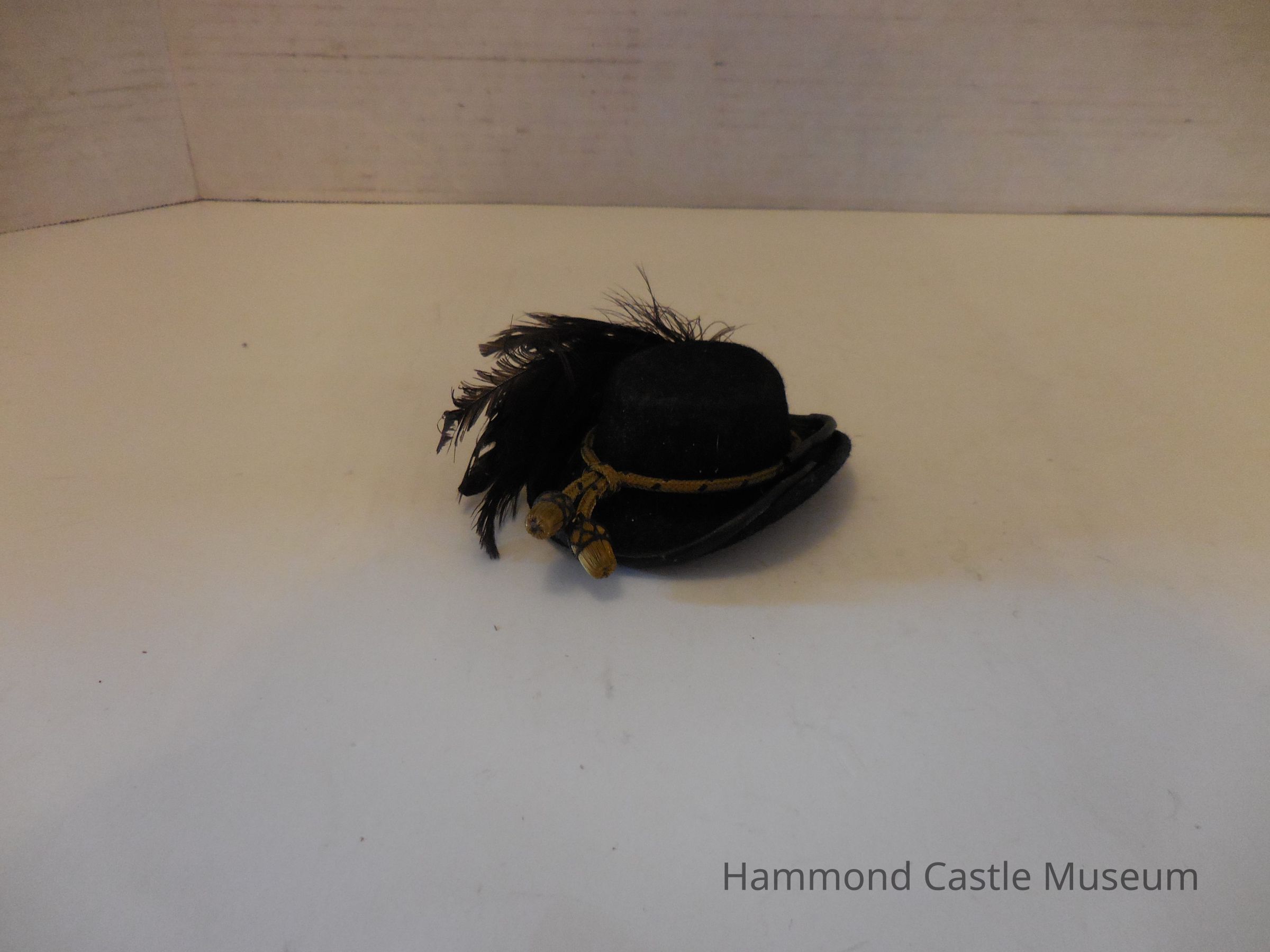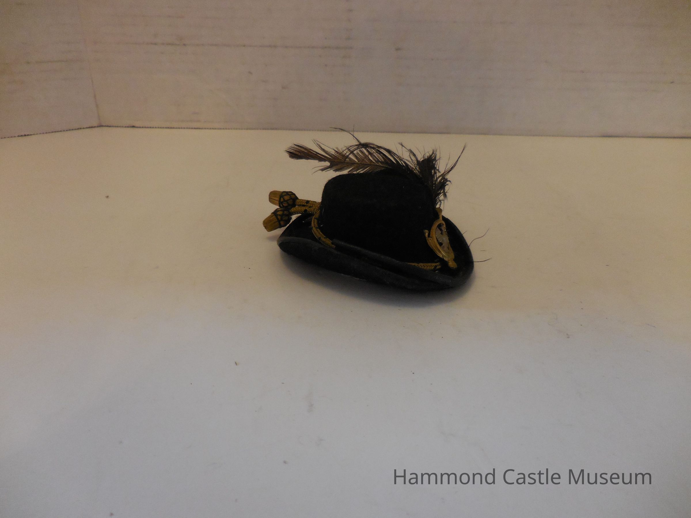 Mini Austro-Hungarian Musicians Cap, ca 1900 Dress parade felt hat w gilt badge & ostrich feather plum Part of set purchased, May 3, 1928, from Eugen Kettler of Hofburg, valet of Emperor Franz Joseph Favors from royal banquets from Emperor