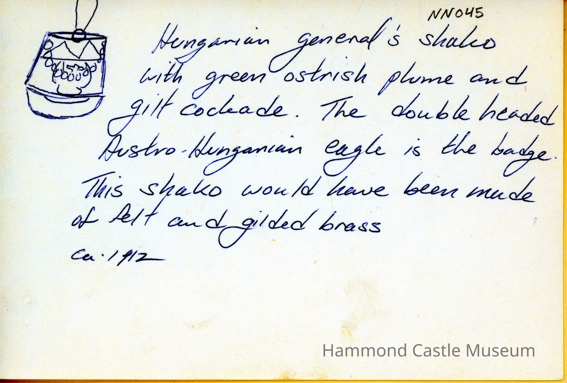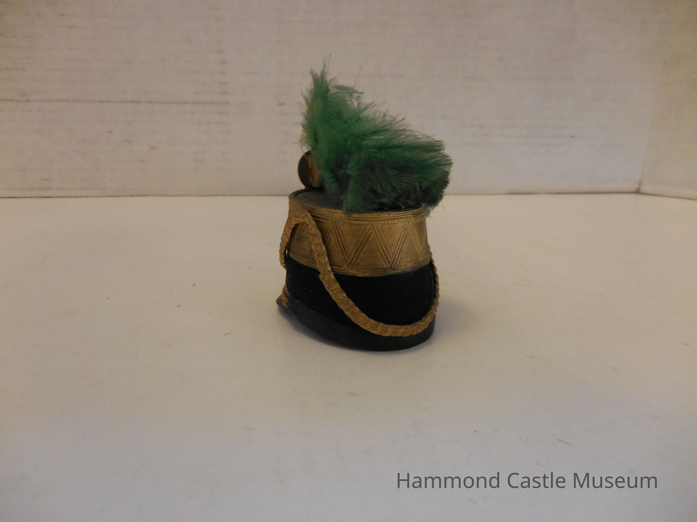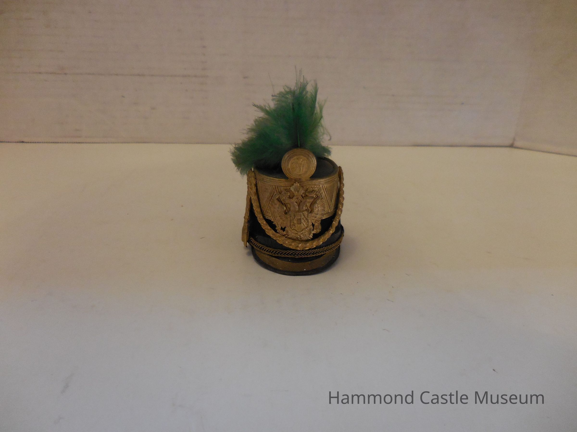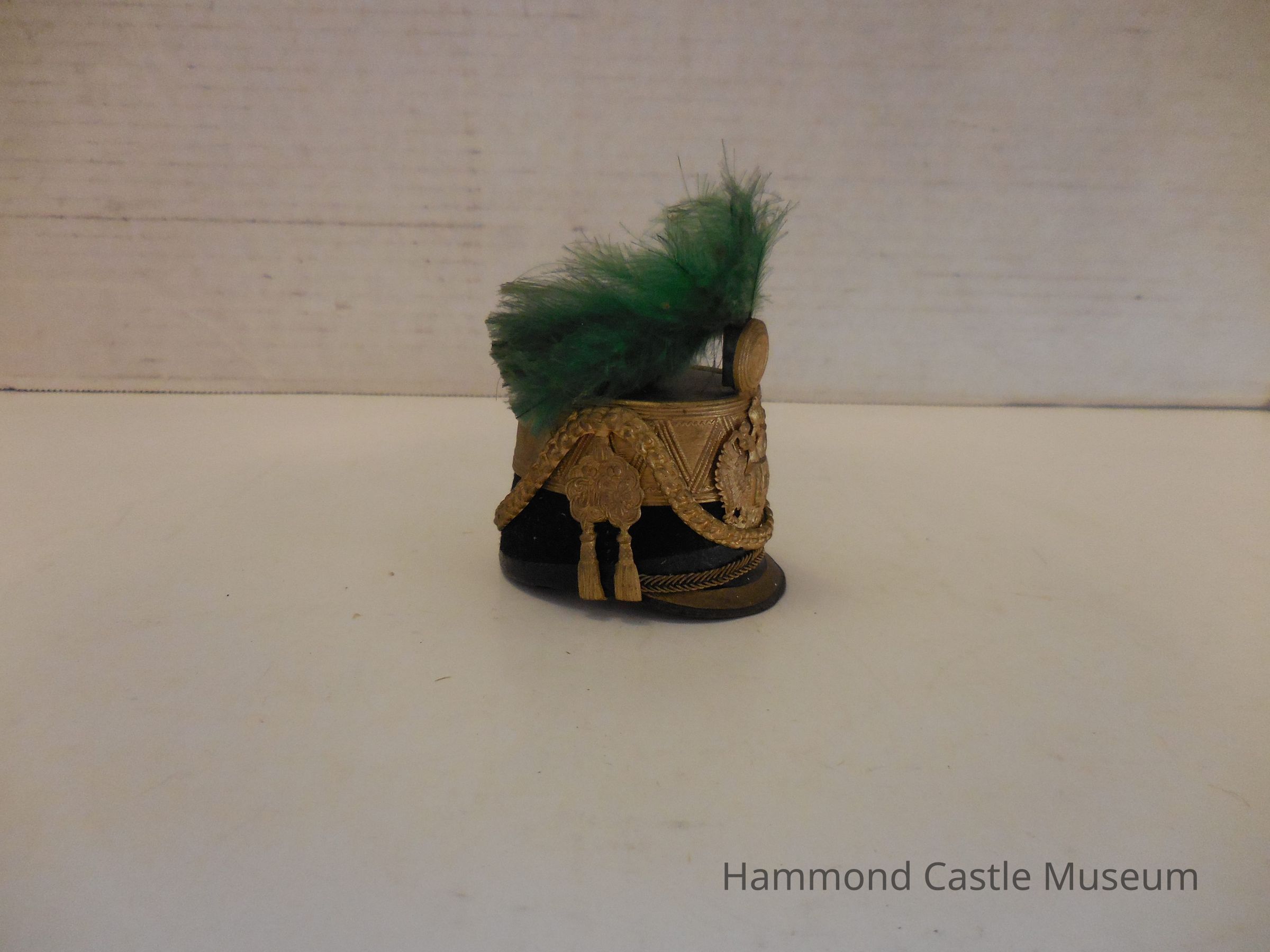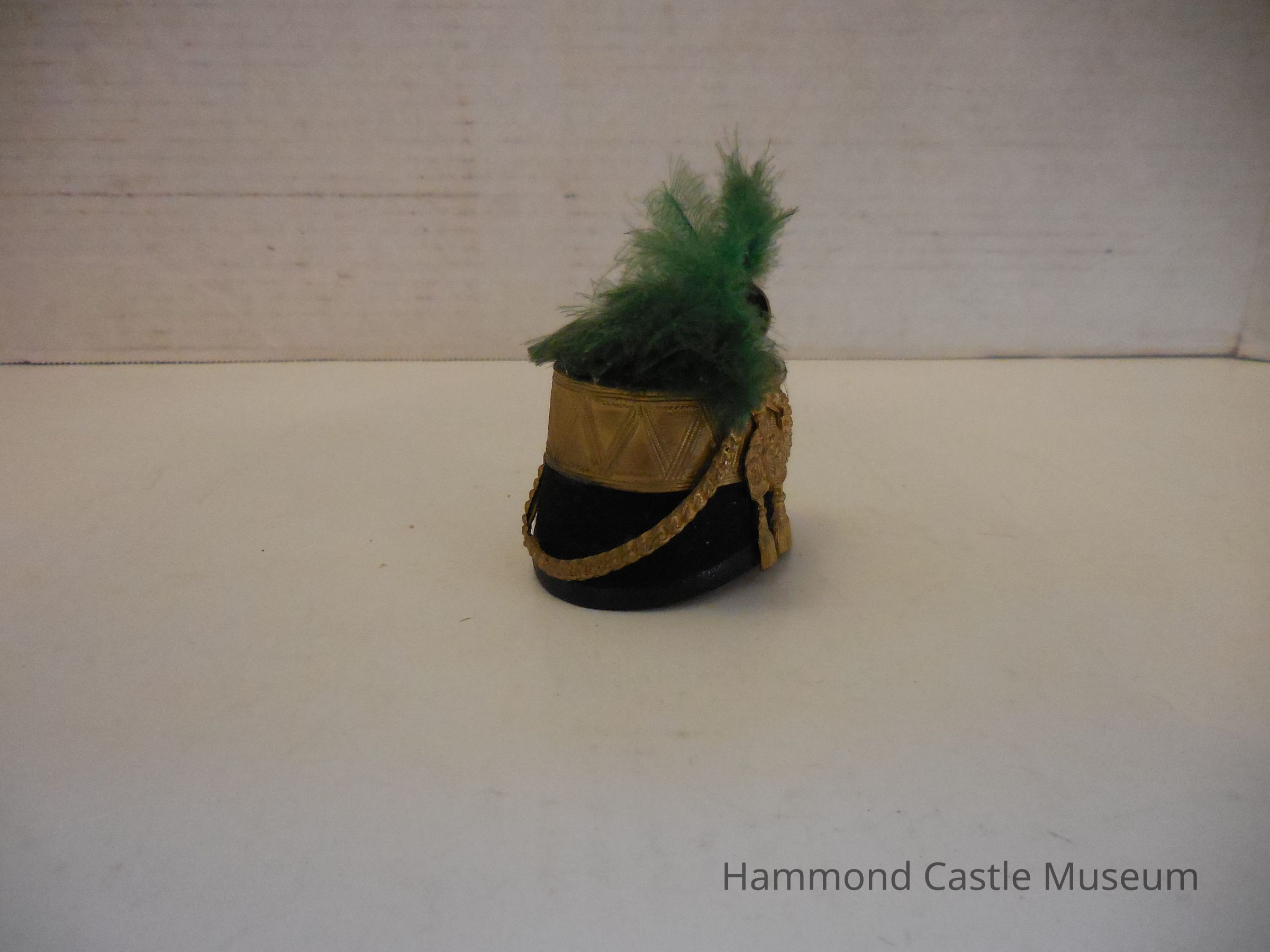 Original would have been made of felt & gilded brass w green ostrich plume & gilt cockade