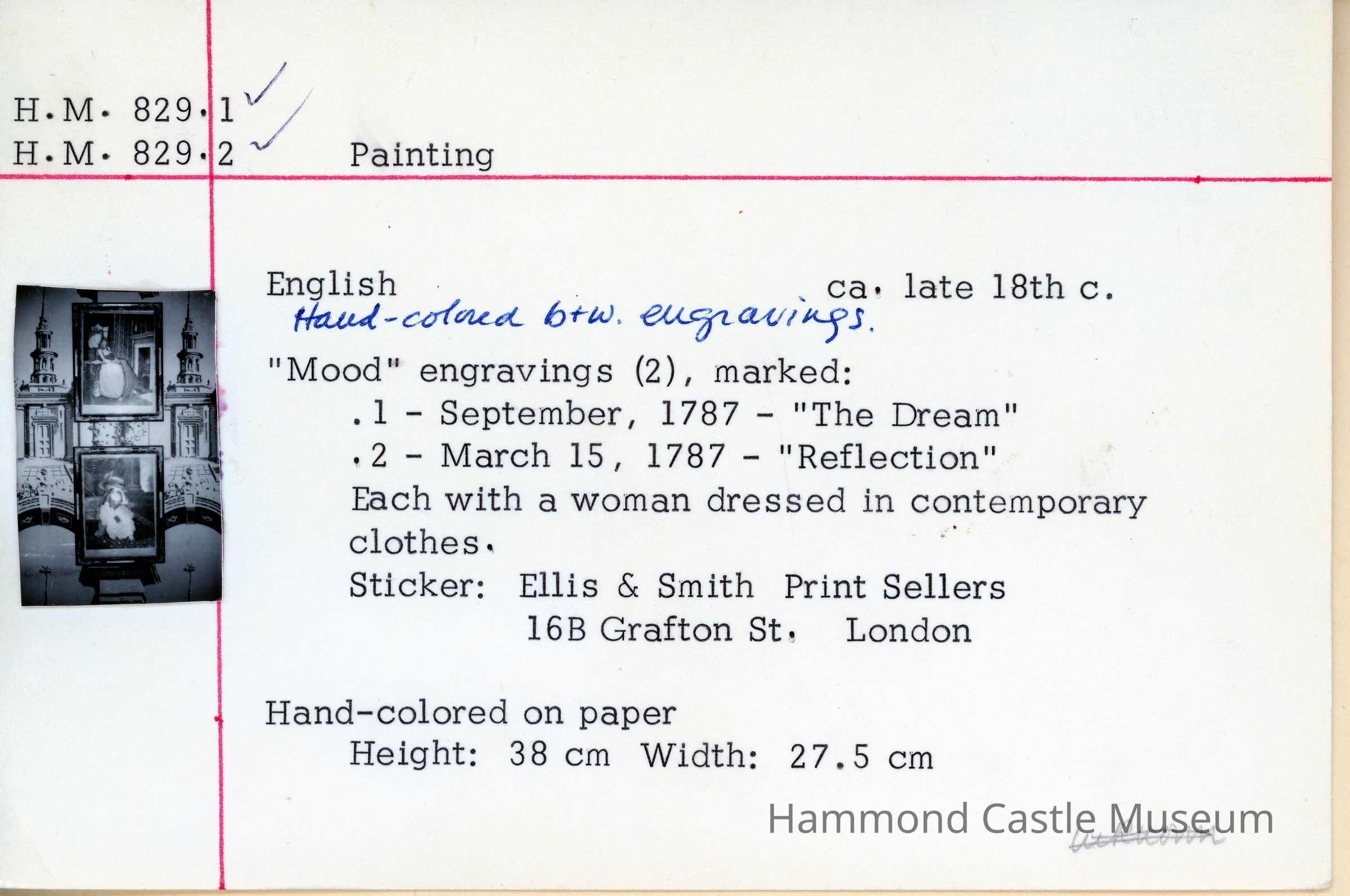 Set of 2 "Mood" engravings, marked: .1 -- September, 1787 -- "The Dream" .2 -- March 15, 1787 -- "Reflection" Each with a woman dressed in contemporary clothes. Sticker: Ellis & Smith Print Sellers 16B Grafton St. London
