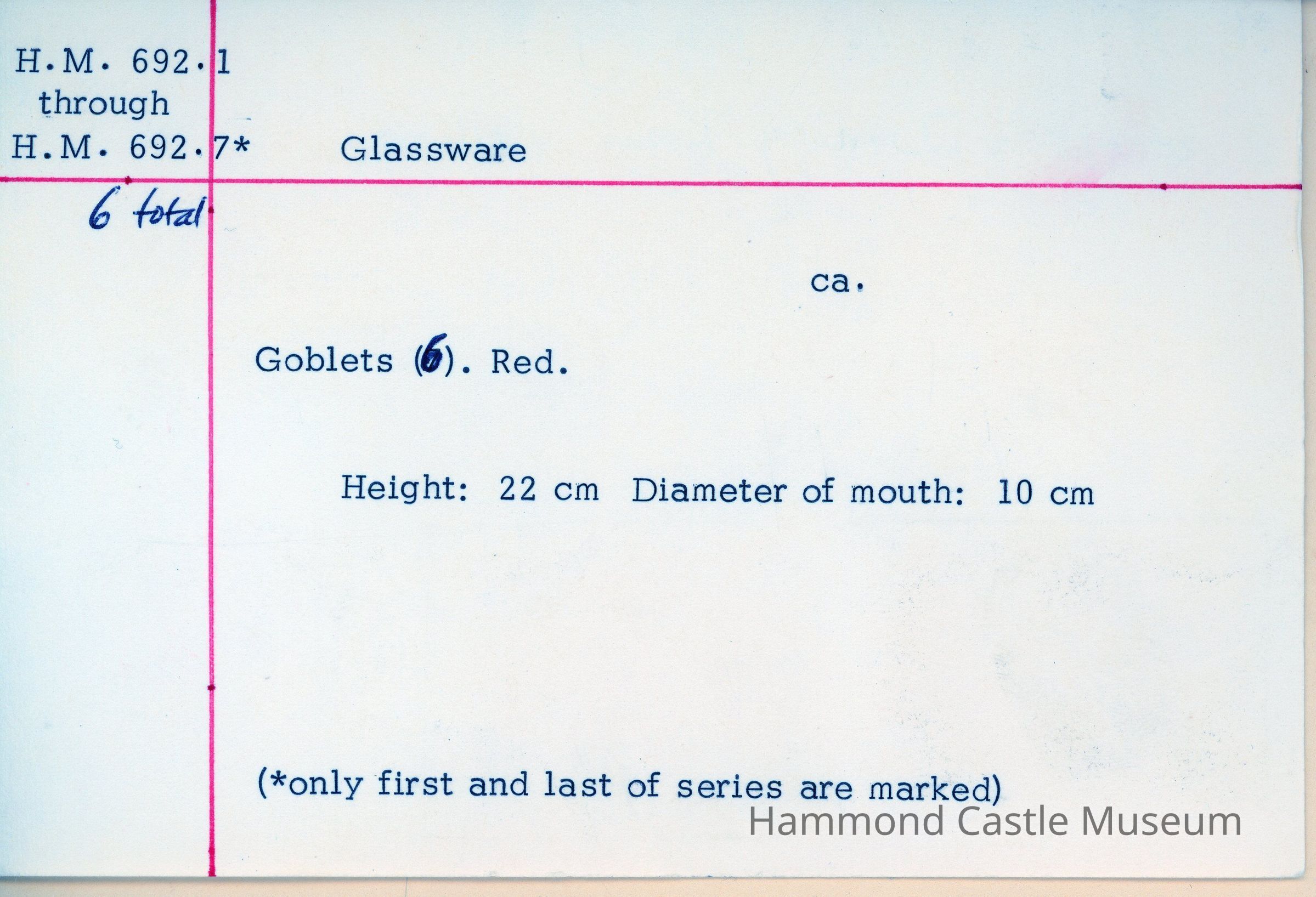 Set of 6 Murano Italian Red Glass Goblets. ca 1830 Purchased from Orsini Palace sale, Venice, 1923