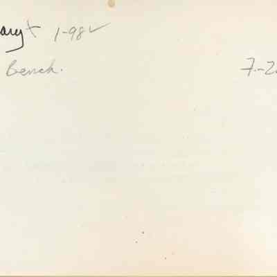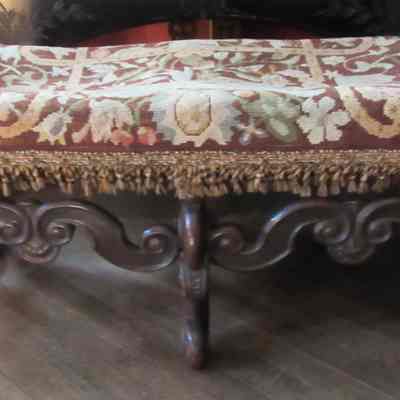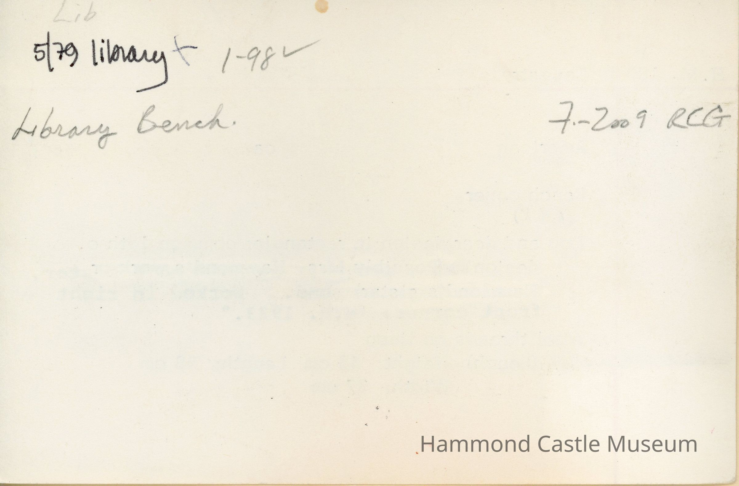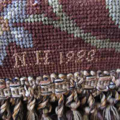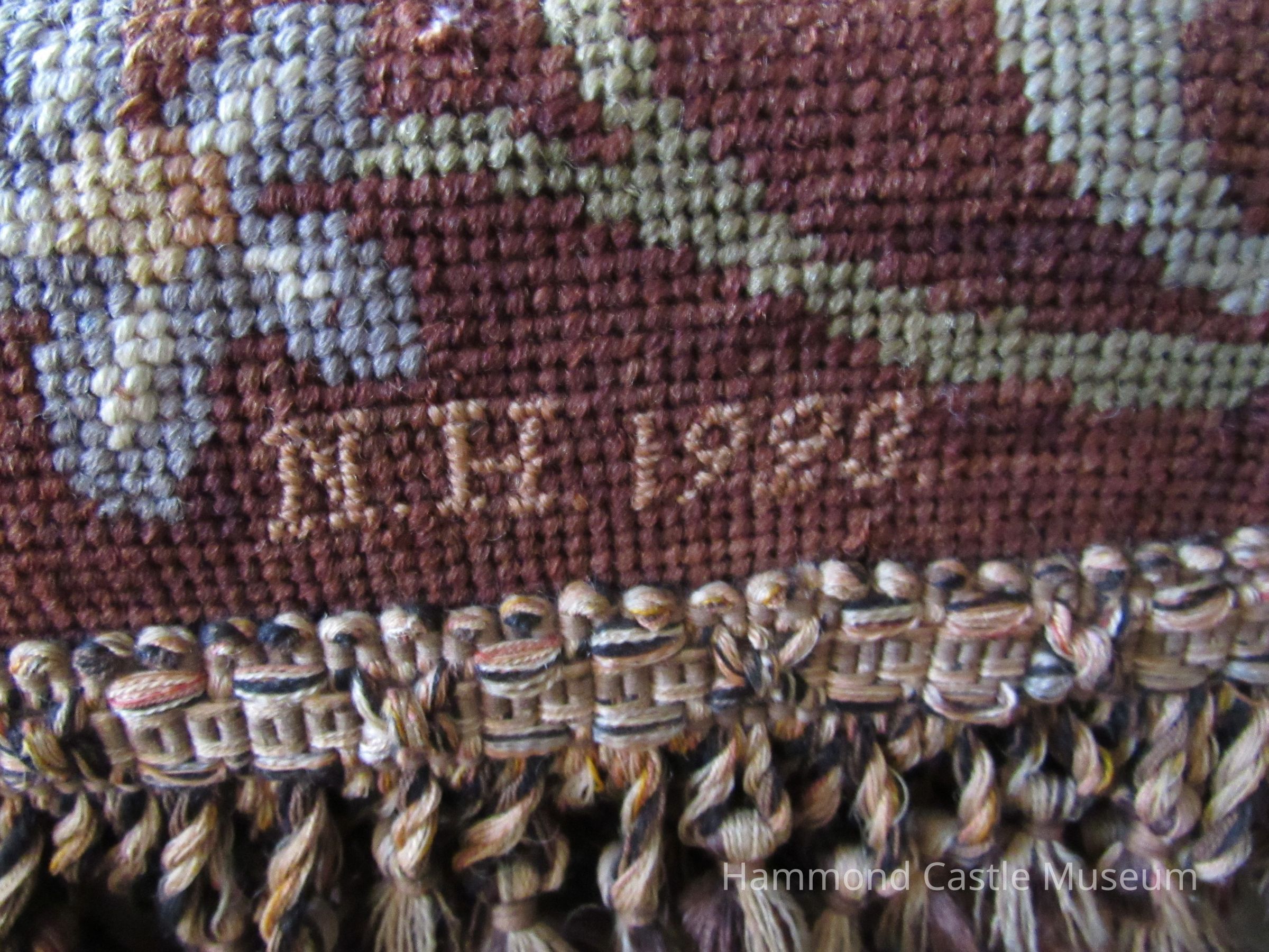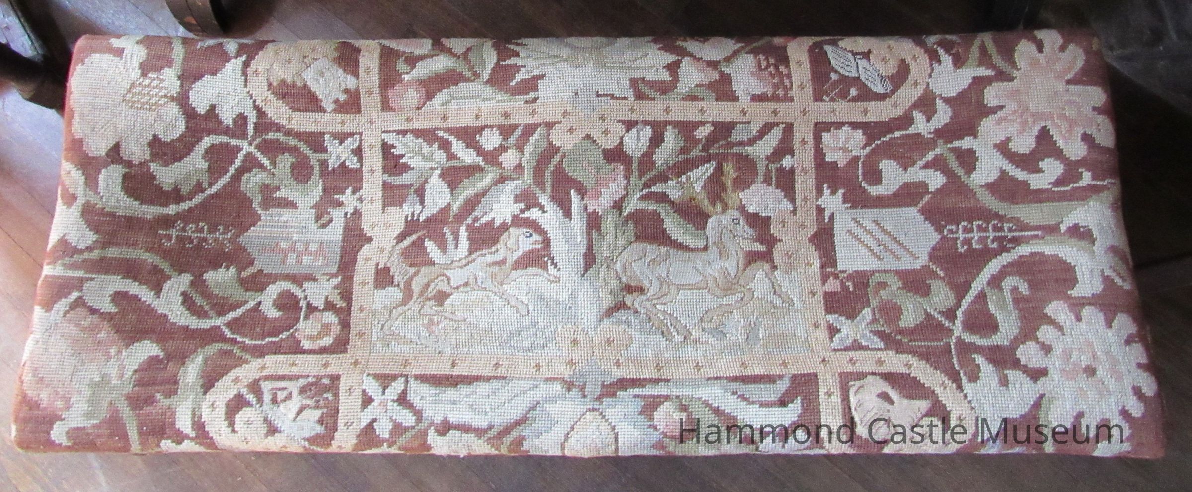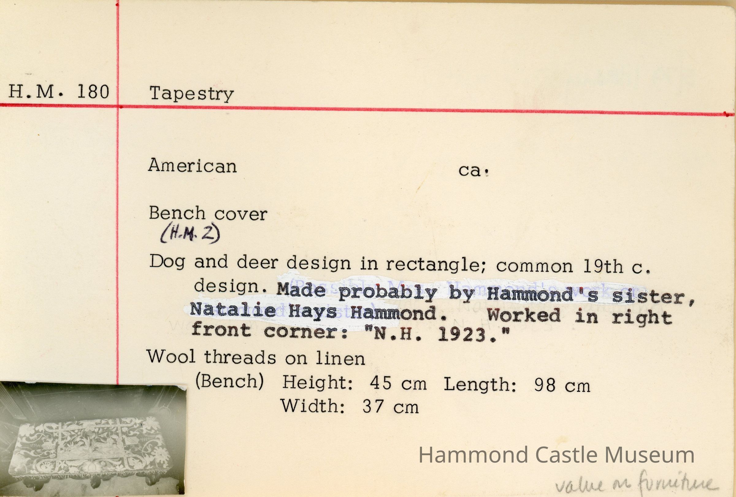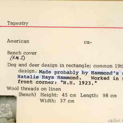 Bench cover (HM2). Dog and deer design in rectangle; common 19th c. design. Most likely made by Hammond's sister, Natalie Hays Hammond. Worked in right front corner: "N.H. 1923."