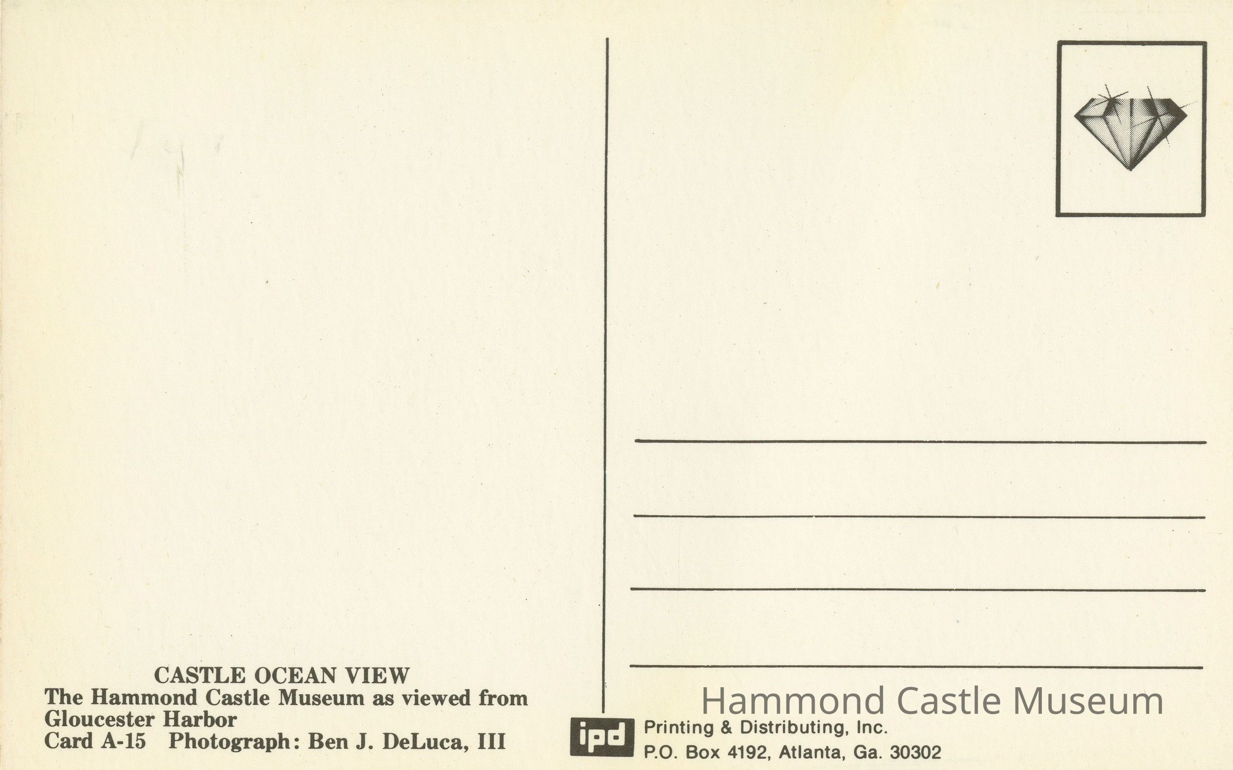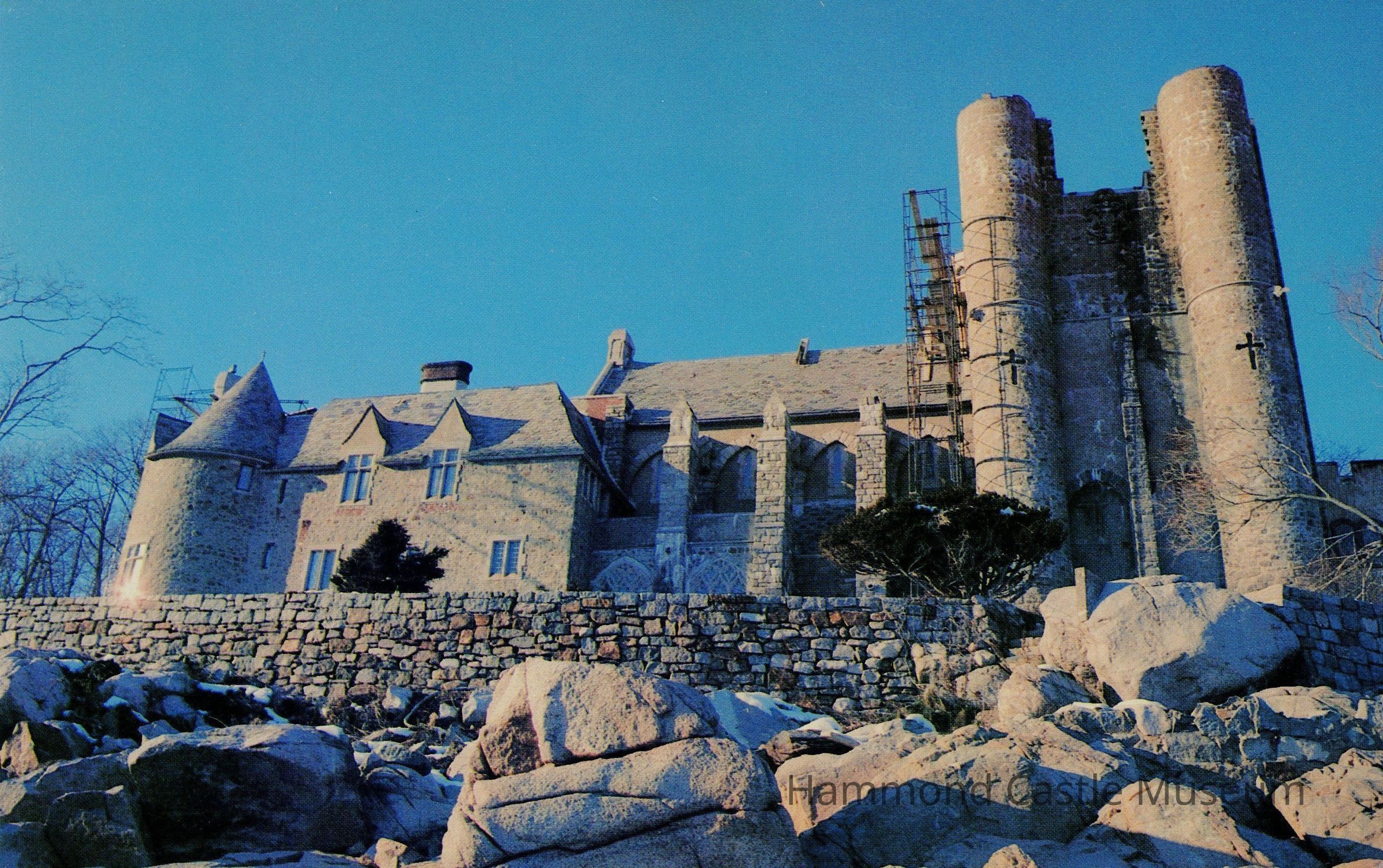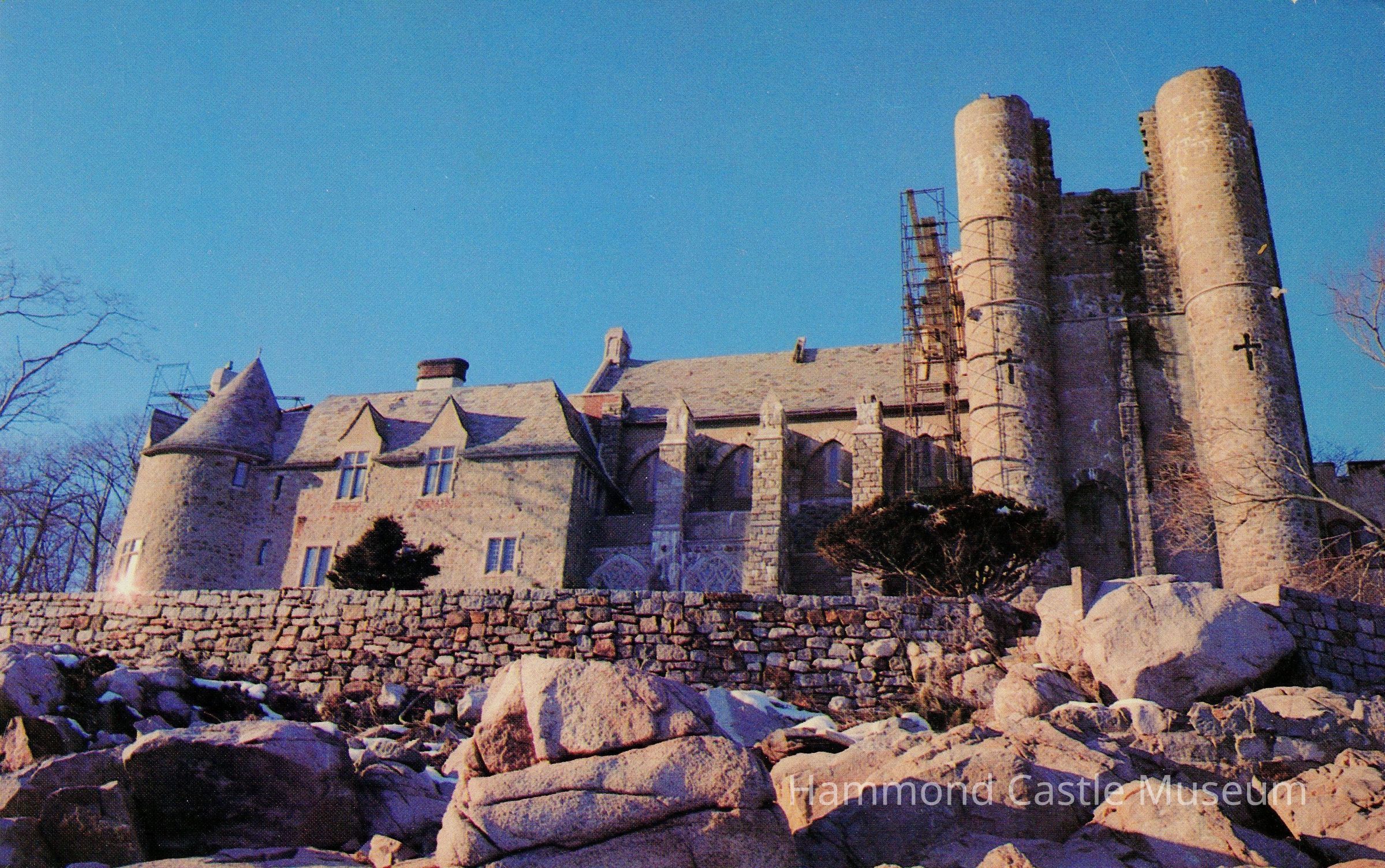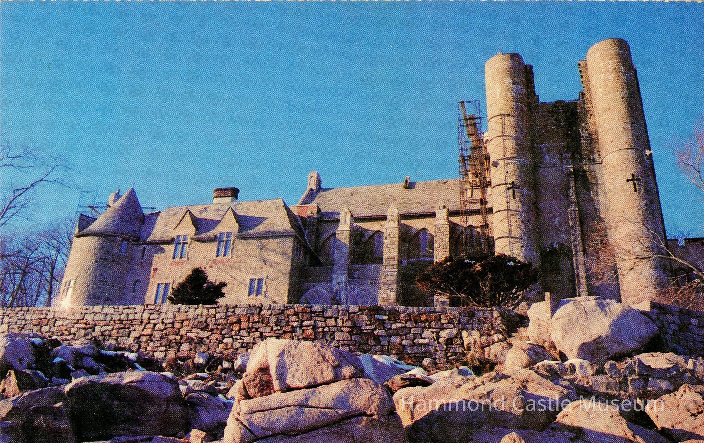 Postcard of ocean side facade from rocks, pre-cliff fencing & bushes, scaffolding up to oriel window Image by Ben Deluca 5 copies PCB-035, 036, 037, 038, 039
