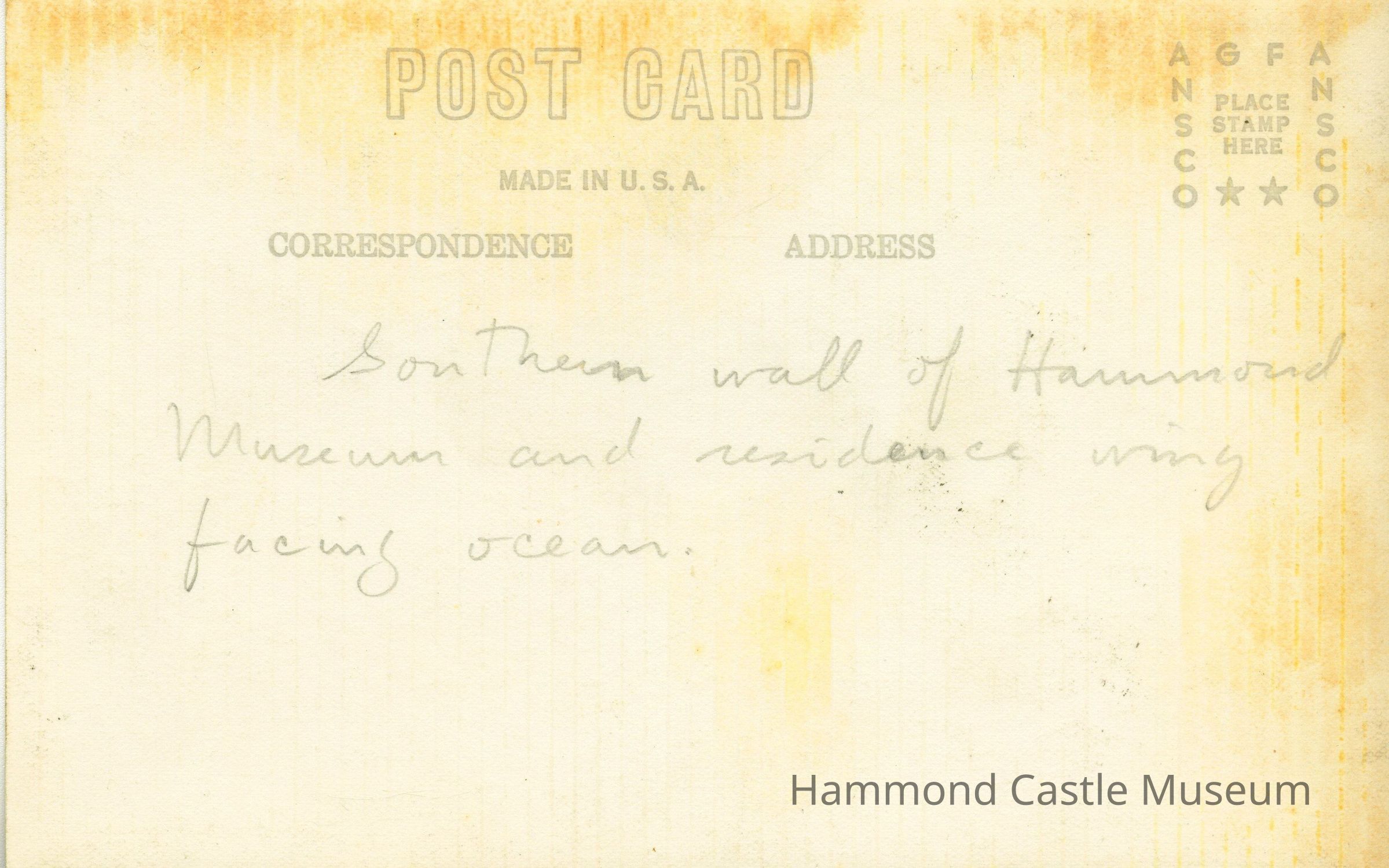 Early postcard of ocean side facade with buttresses, pre-Hearst lanterns