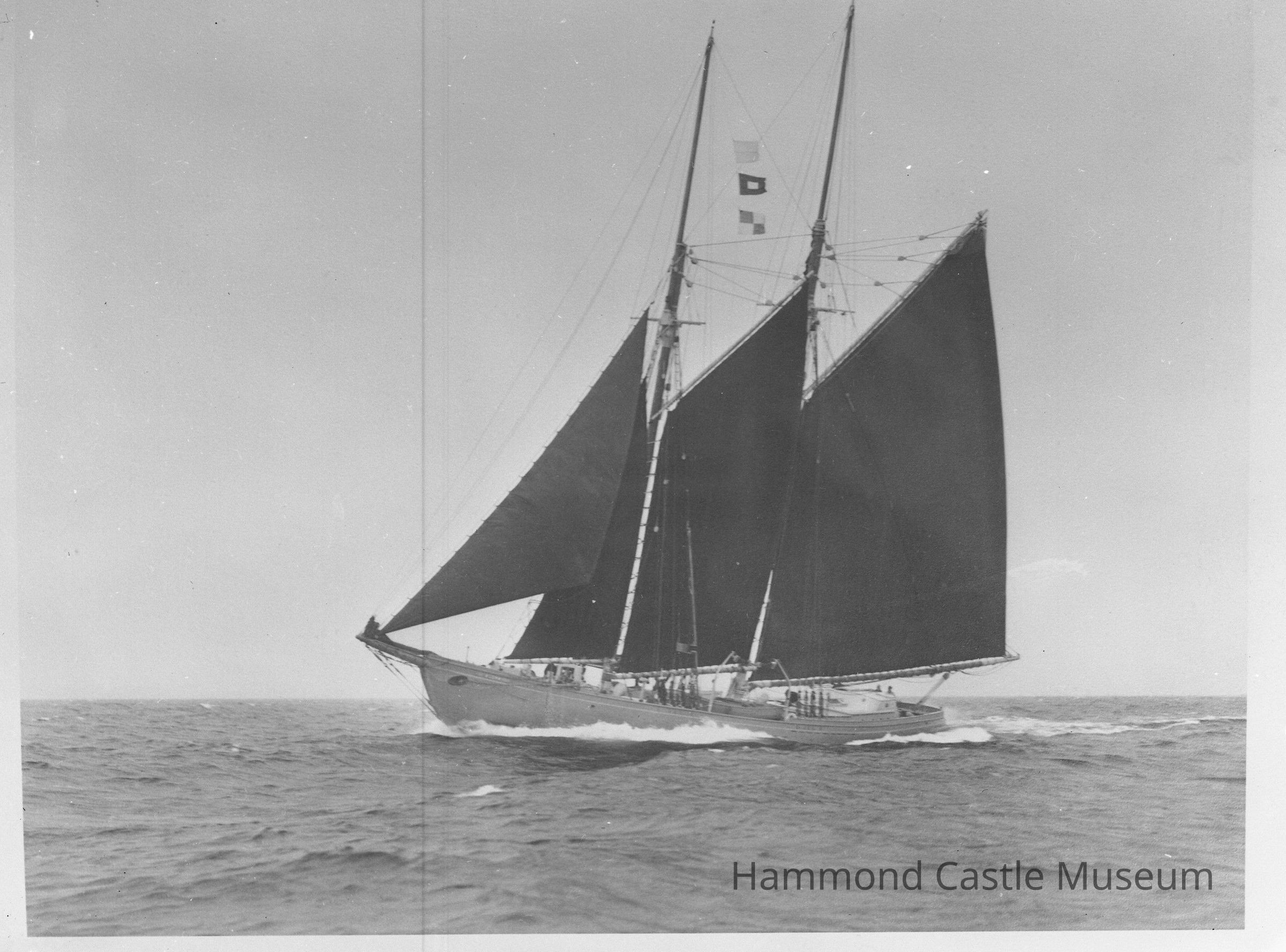 Negative of Hammond schooner Odysseus with lower dark sails