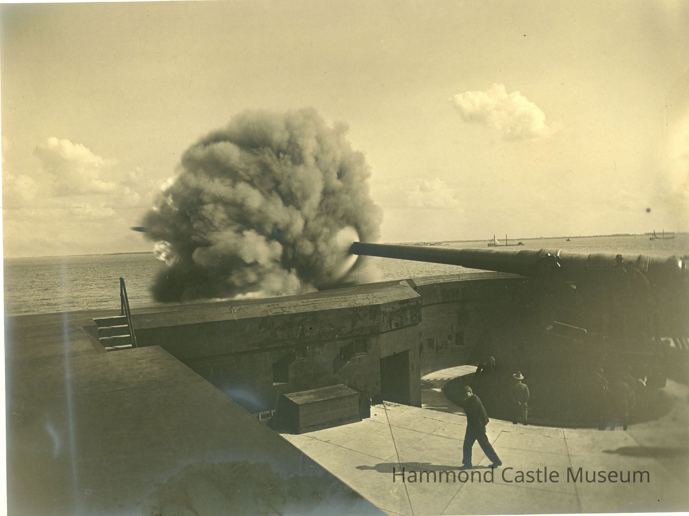 Photo of coastal battery with cannon firing