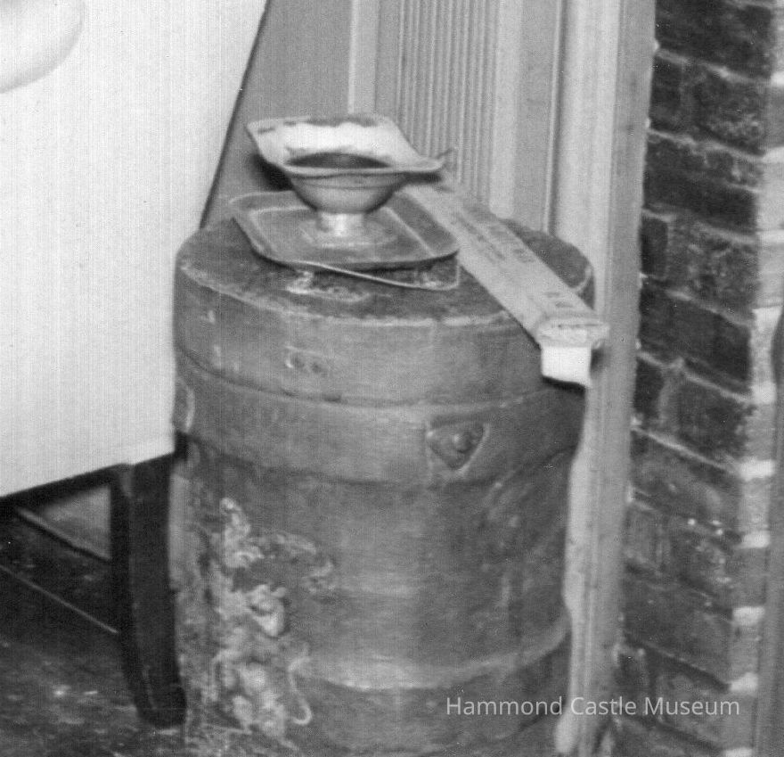 Red painted leather keg with wooden frame Lift off cover Coat of Arms decorations