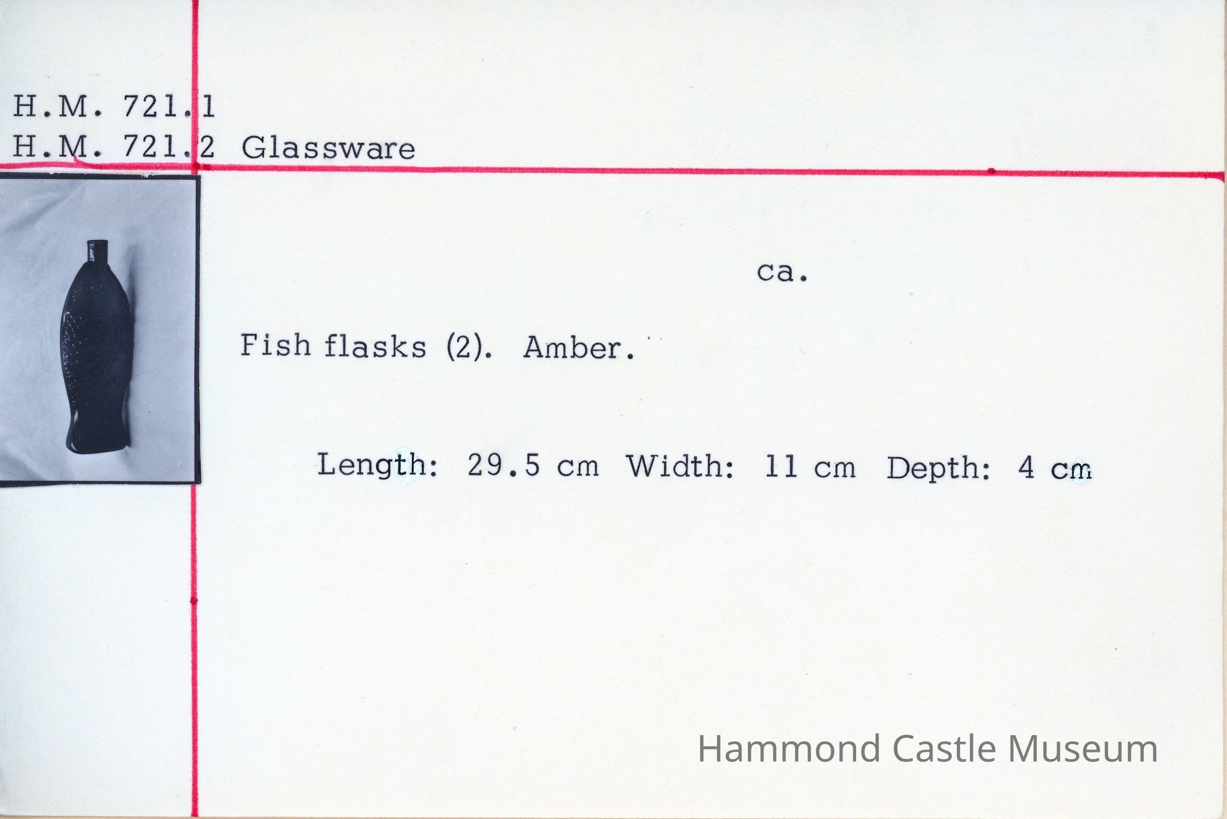 Amber glass fish shaped bottles L: 29.5cm W: 11cm D: 4cm DEACCESSIONED 1991