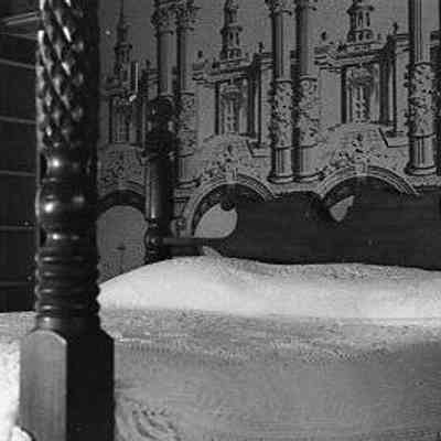 Purple & silver architectural wallpaper once hung in upper colonial guest.