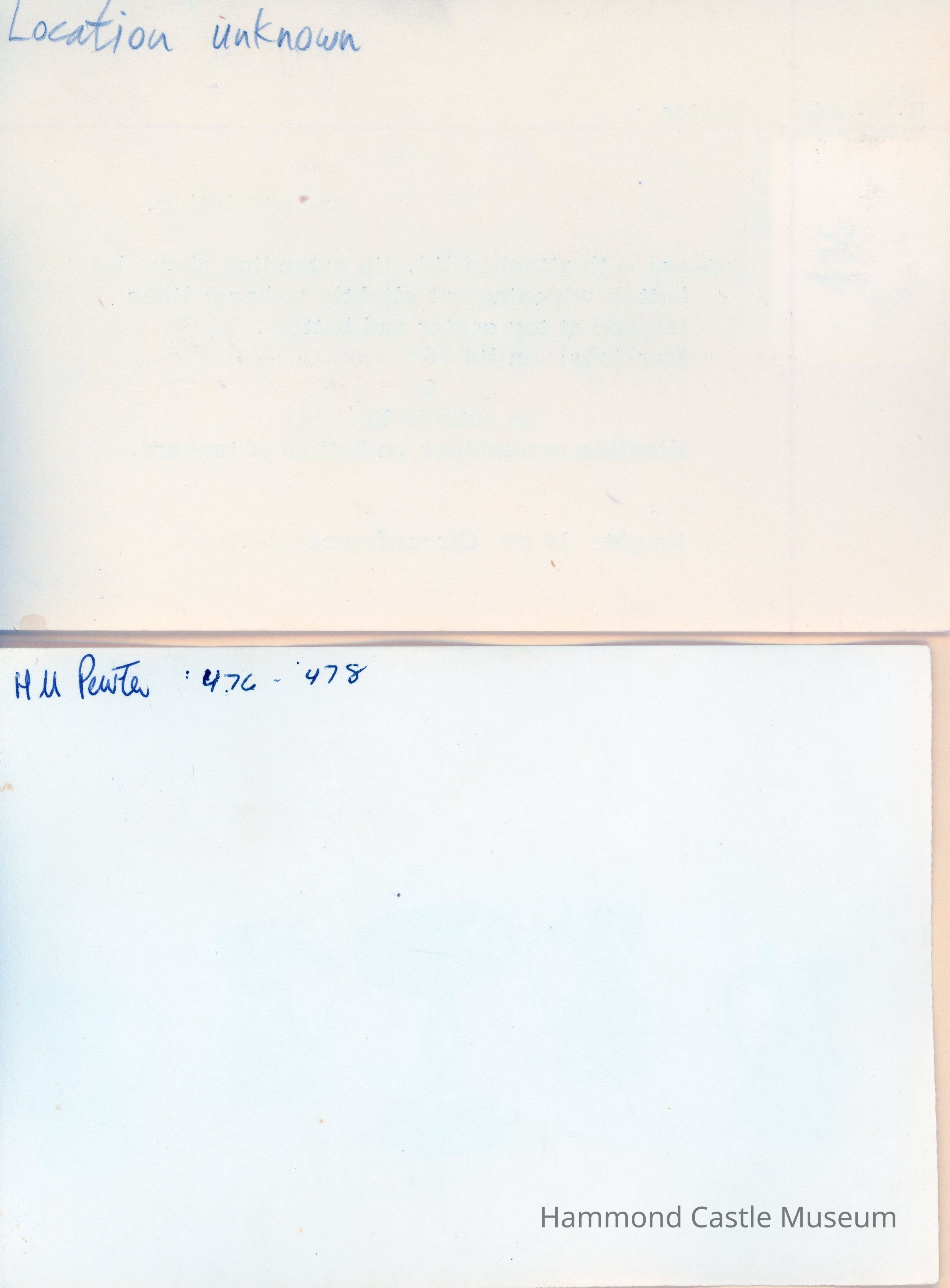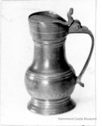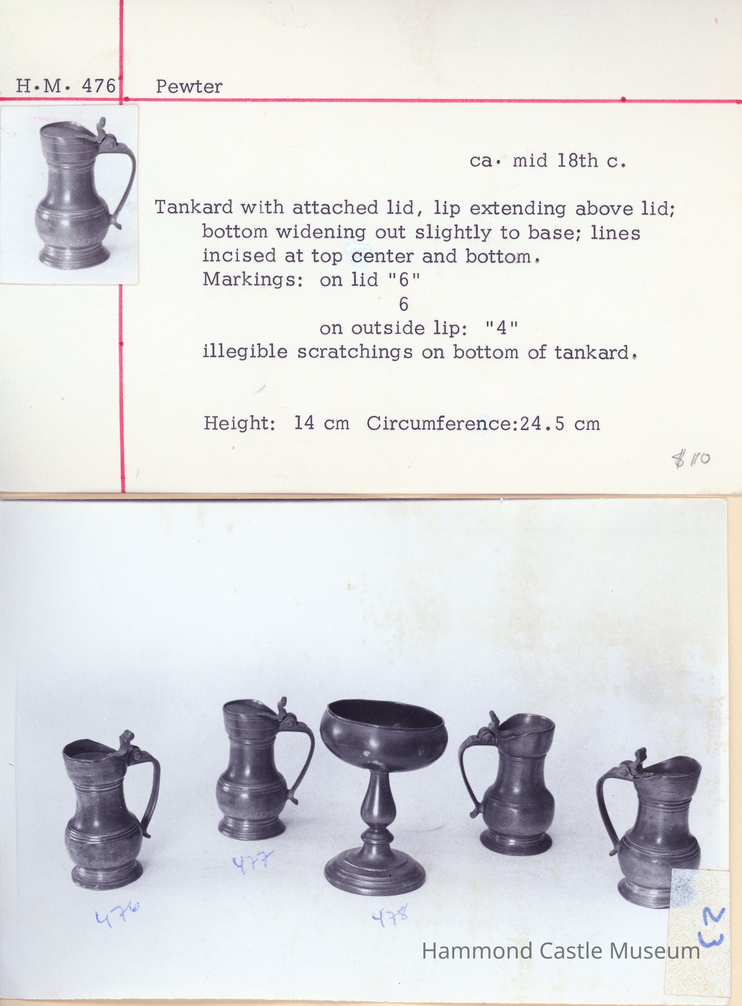 Pewter pitcher-tankard with attached lid, lip extending above lid; bottom widening out slightly to base; lines incised at top center and bottom. Markings: see catalogue card. Illegible scratchings on bottom of tankard.