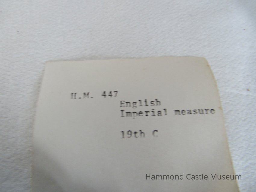 Half-pint English Imperial measure. Marked: see catalogue card. Multiple capacity marks: 3 with "VR" for the reign of Queen Victoria and one "ER" that was most likely for the reign of Edward VII. Partially faded crests, similar to HM441.