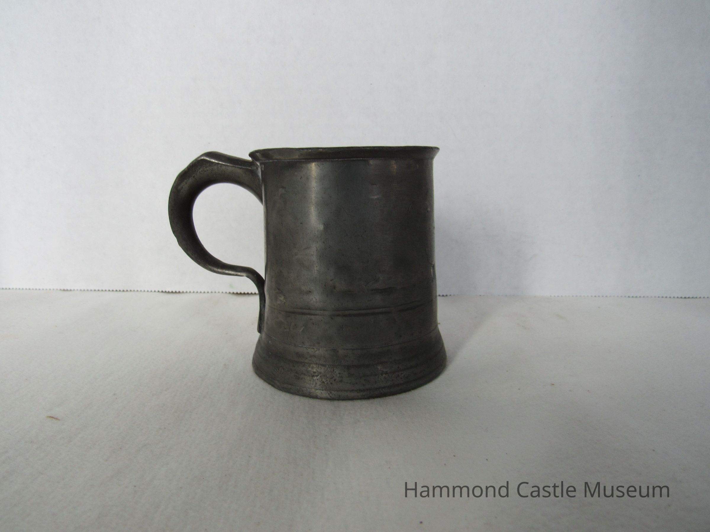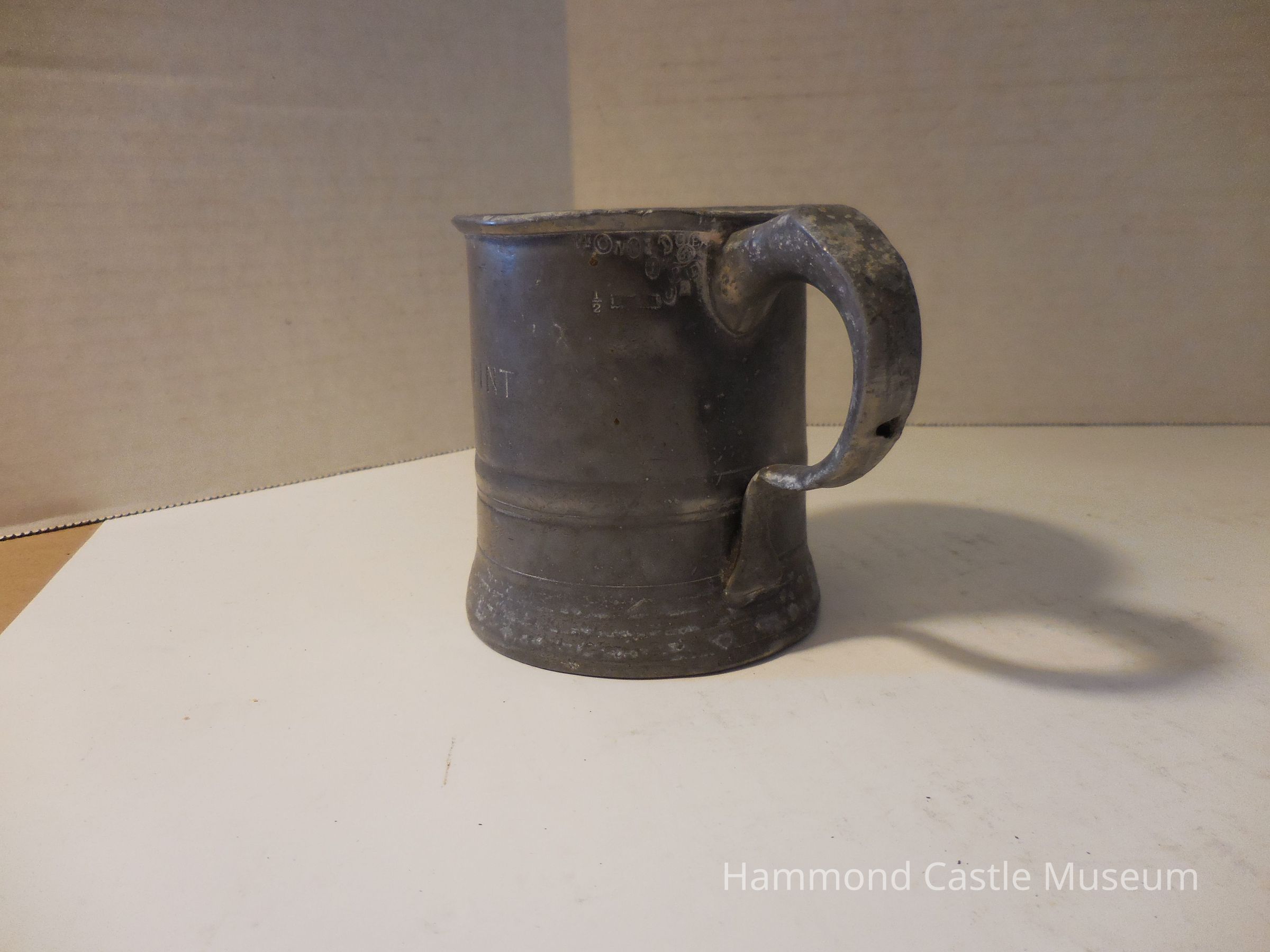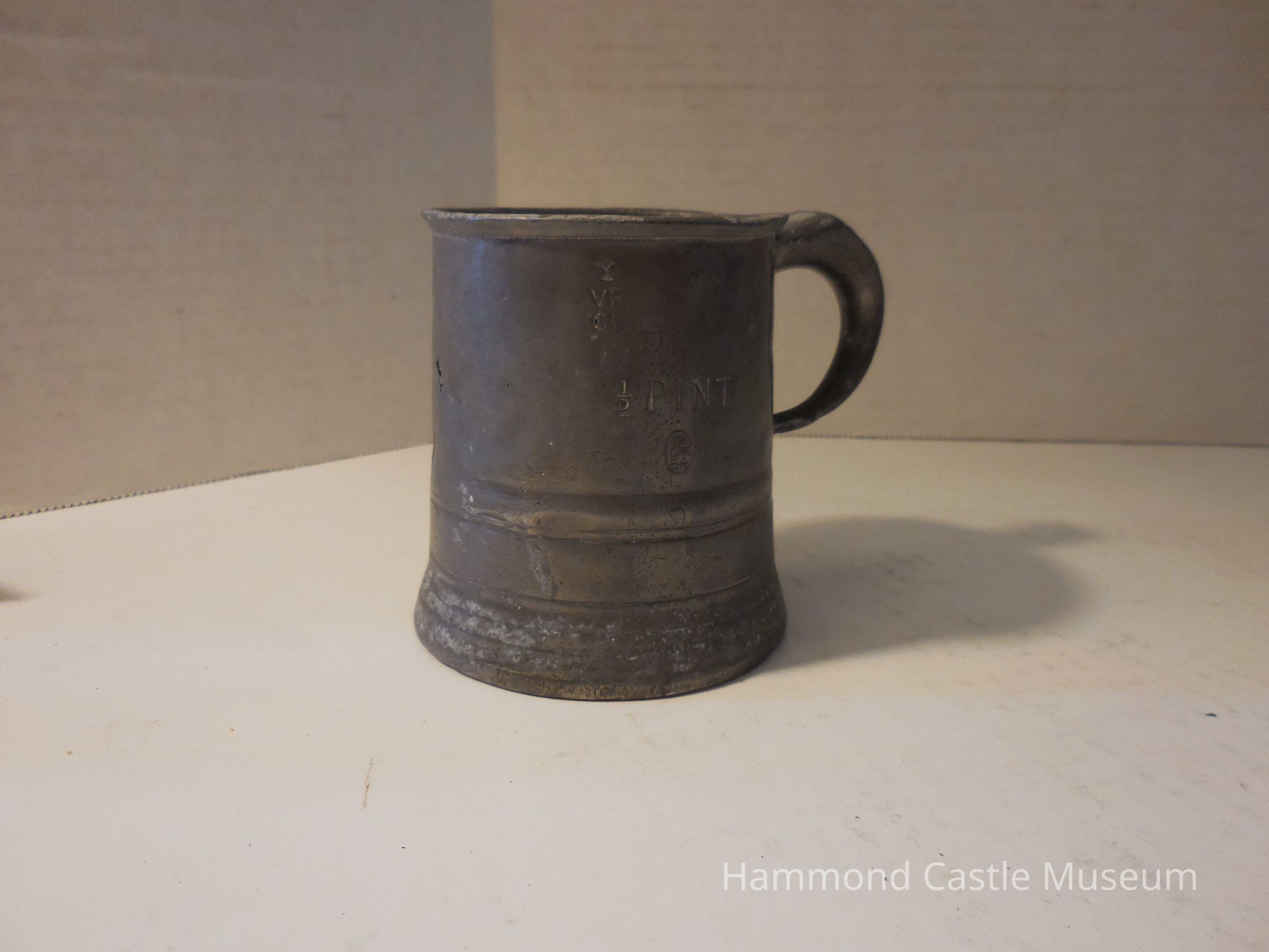 Half-pint English Imperial measure. Marked: see catalogue card. Plus encircled lettered at handle. Capacity mark for the reign of Queen Victoria, and the reign of either George V or VI.