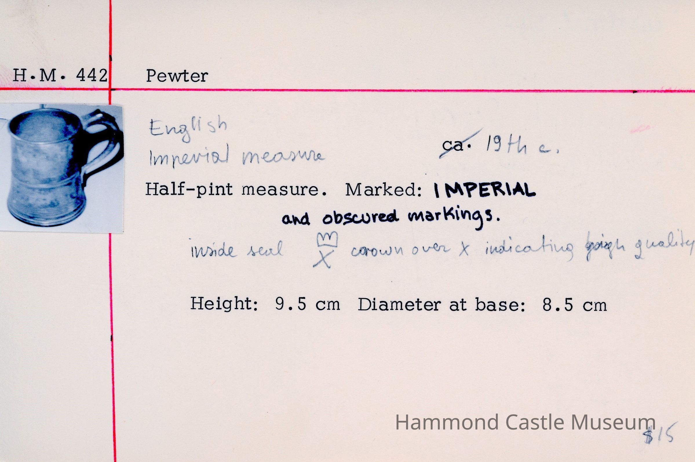 English Pewter Flagon Imperial half-pint measure. Marked: IMPERIAL and obscured markings (see catalogue card).