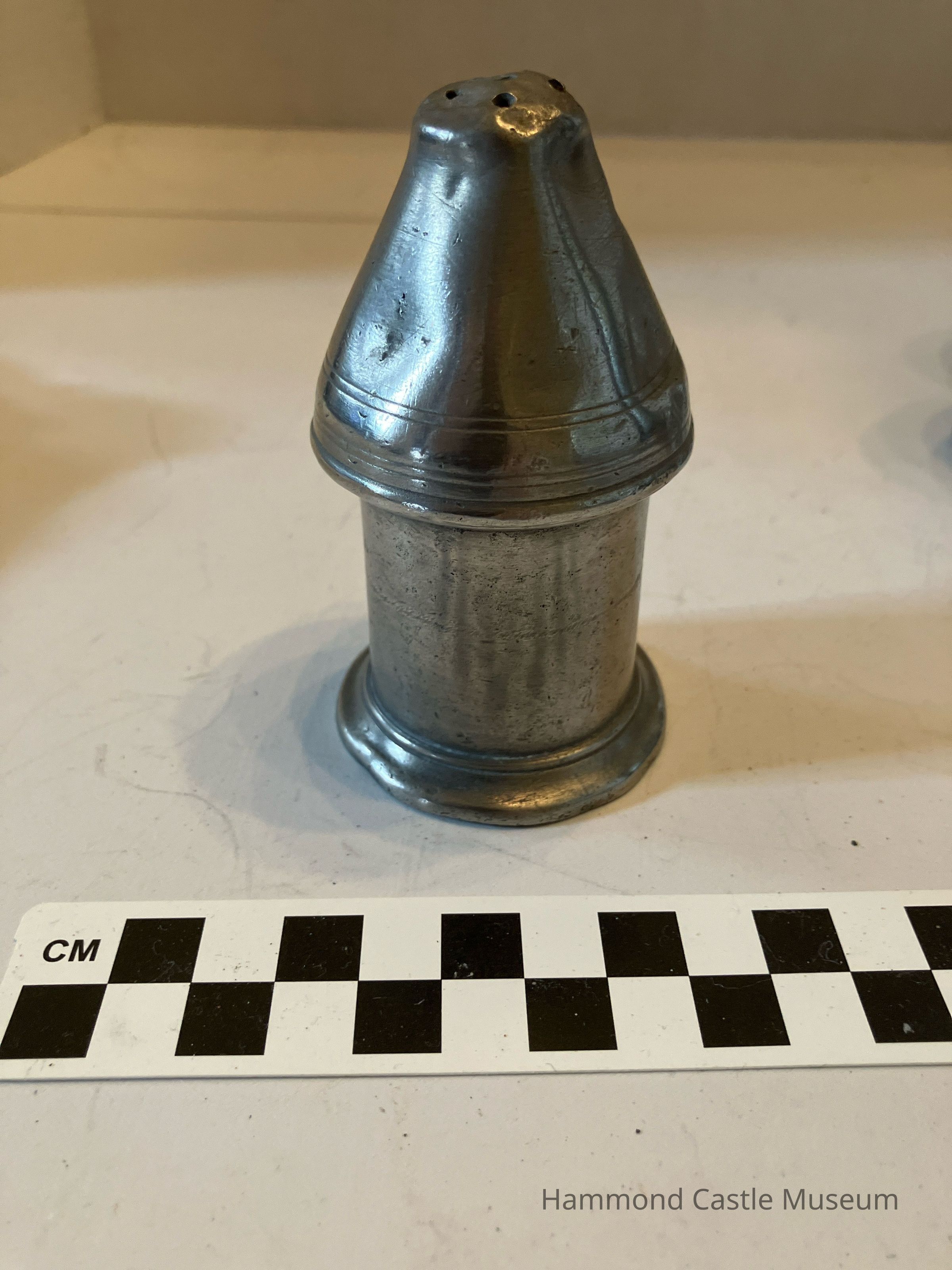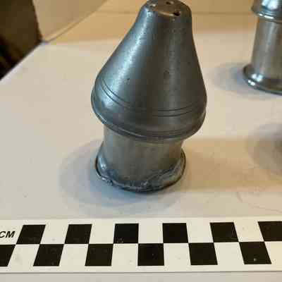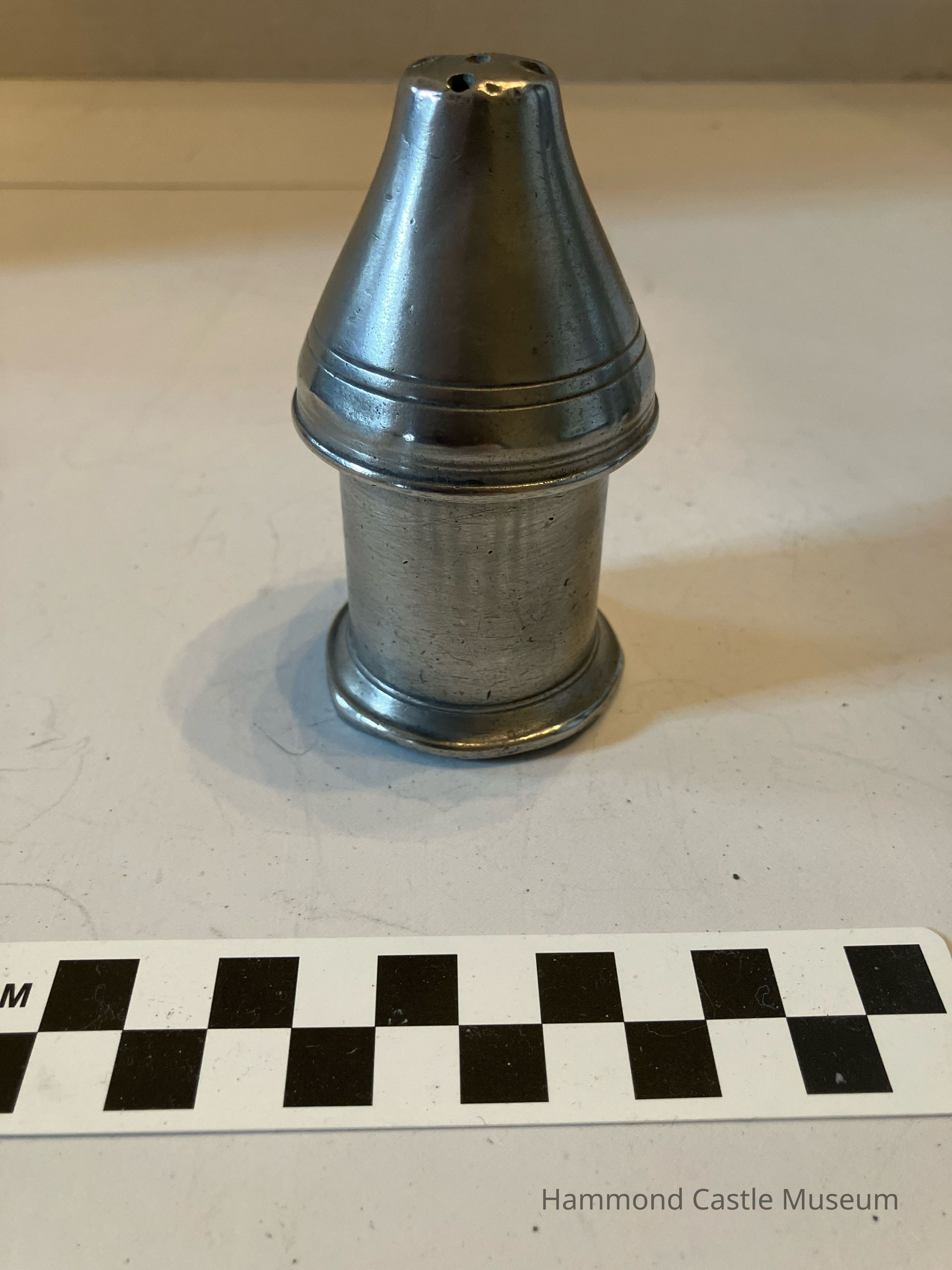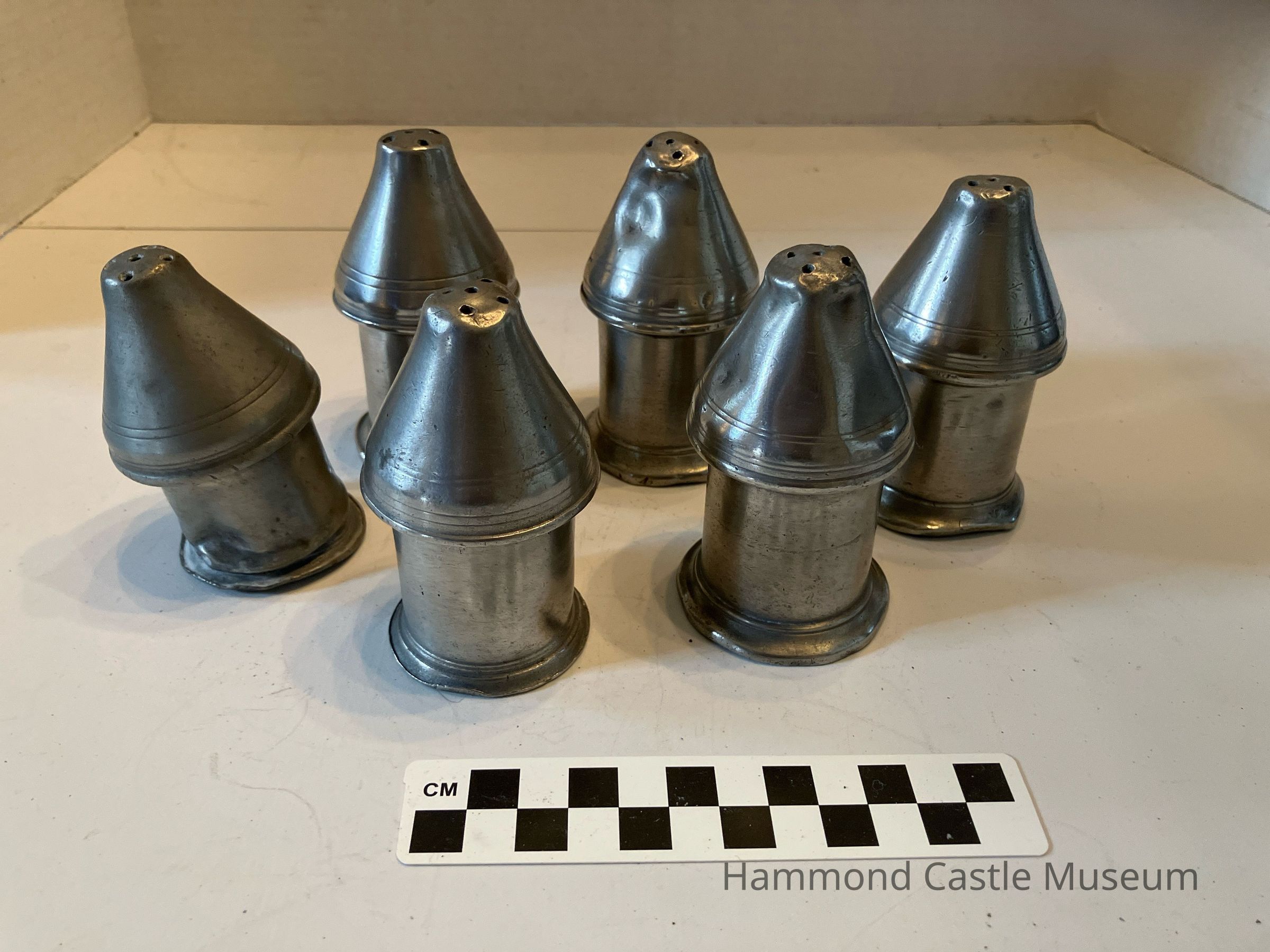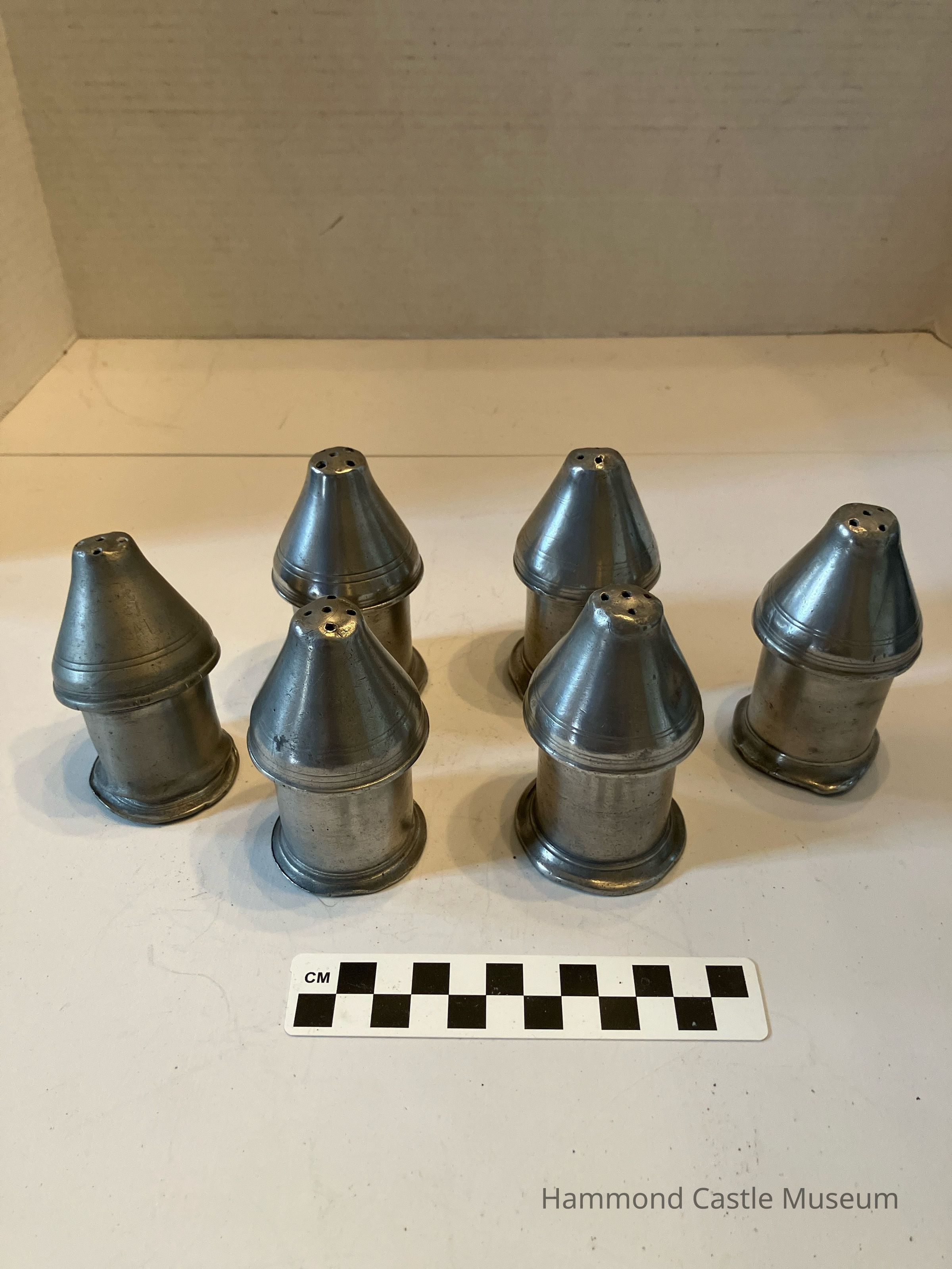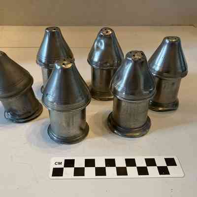 Set of 6 pepper shakers, all similar in shape with lipped bases ringed above with cylindrical central section. Perforated cone-shaped tops which unscrew, with two sets of turnings. One shaker damaged at base.