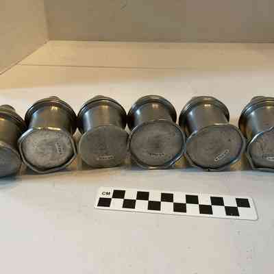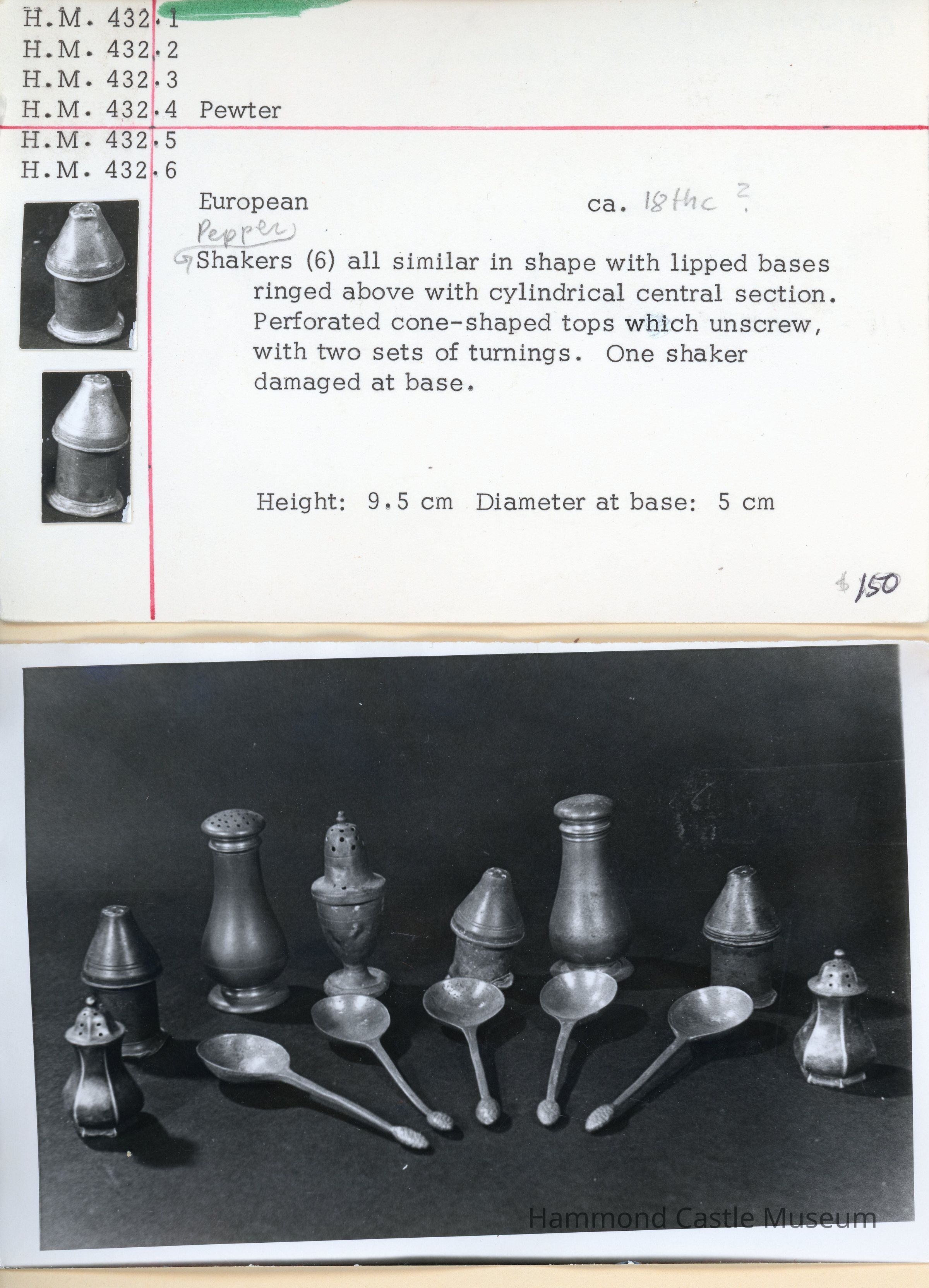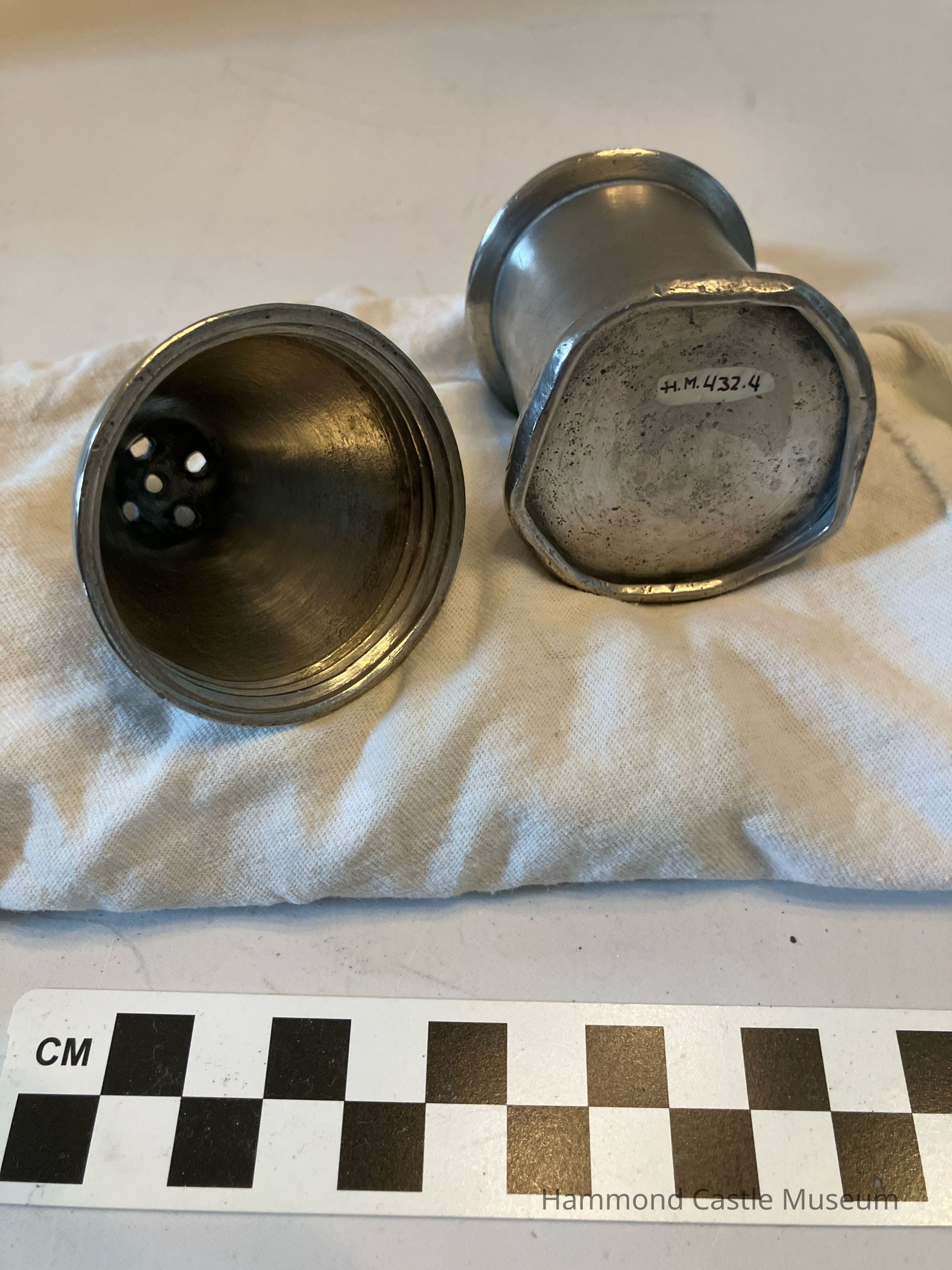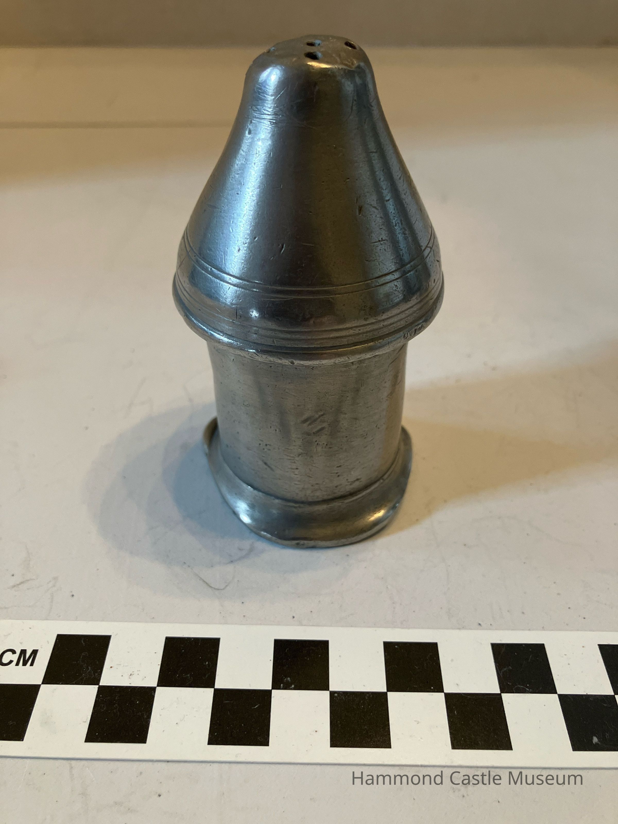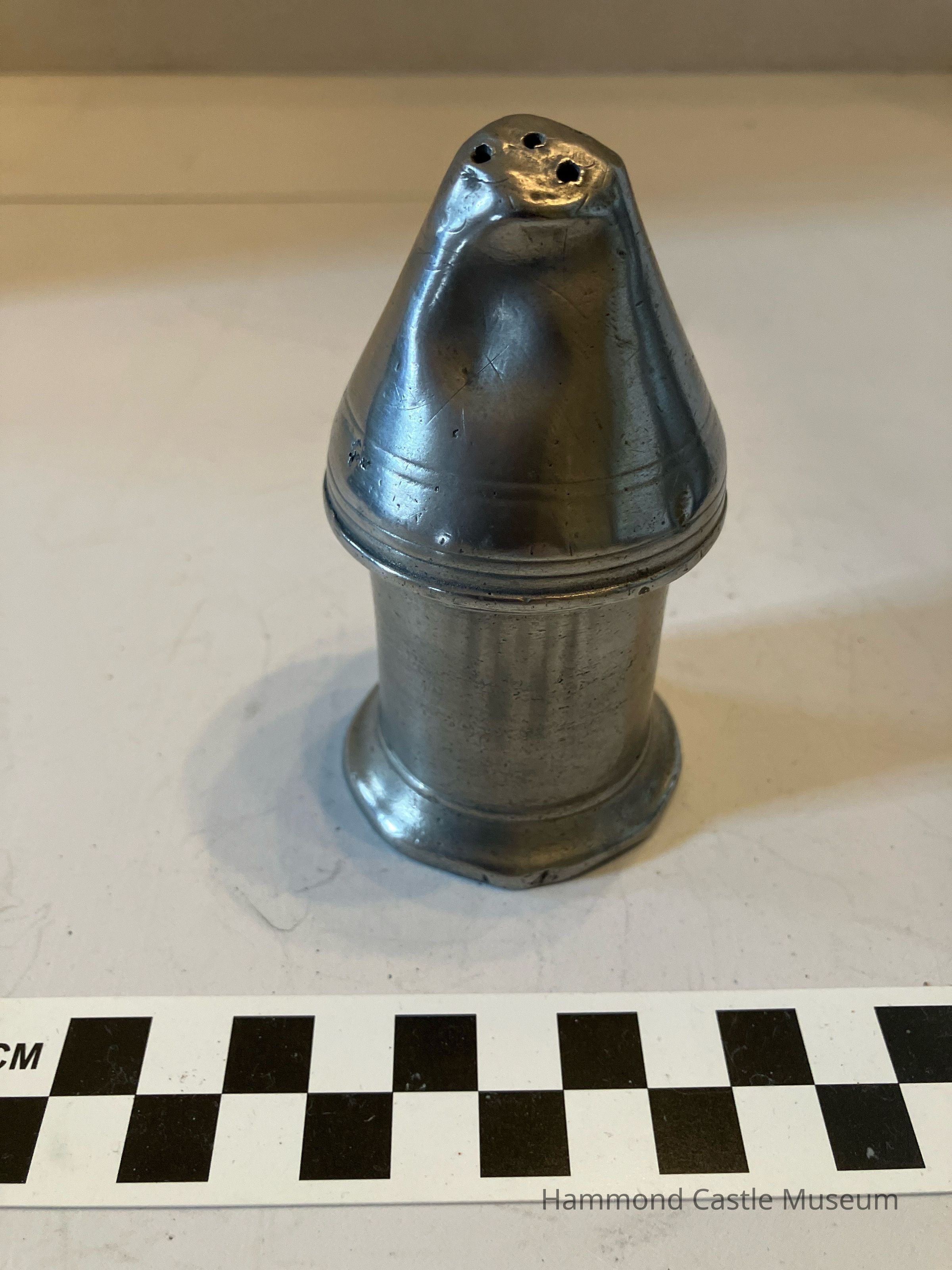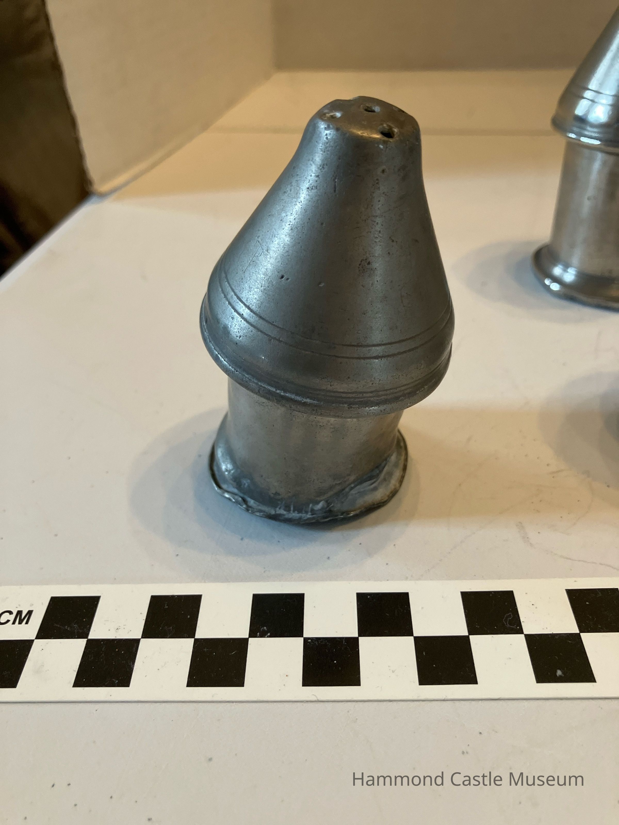 Set of 6 pepper shakers, all similar in shape with lipped bases ringed above with cylindrical central section. Perforated cone-shaped tops which unscrew, with two sets of turnings. One shaker damaged at base.