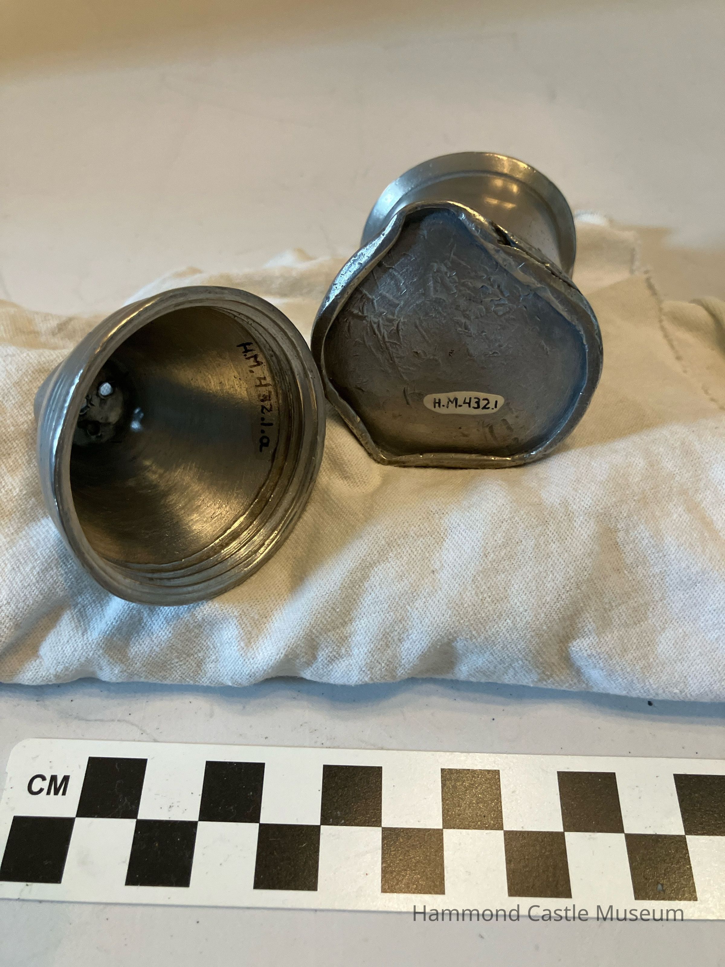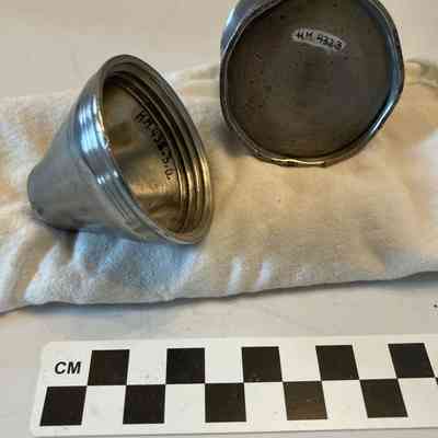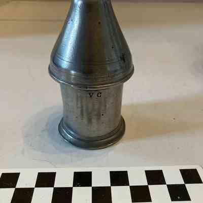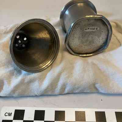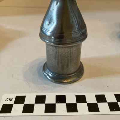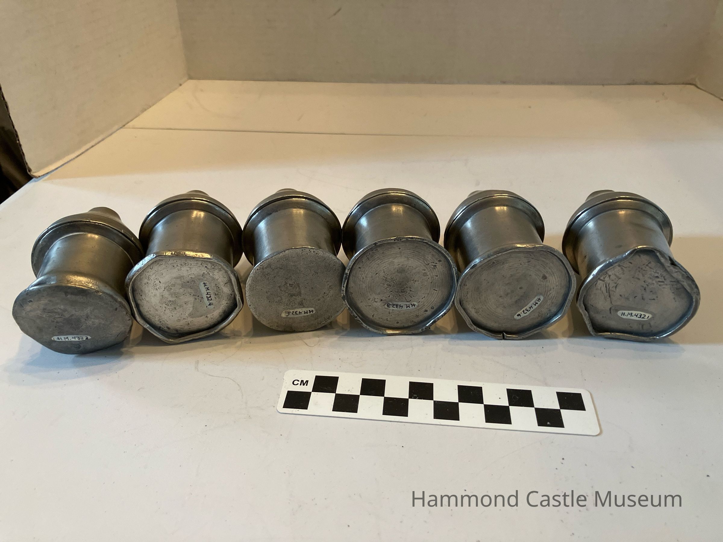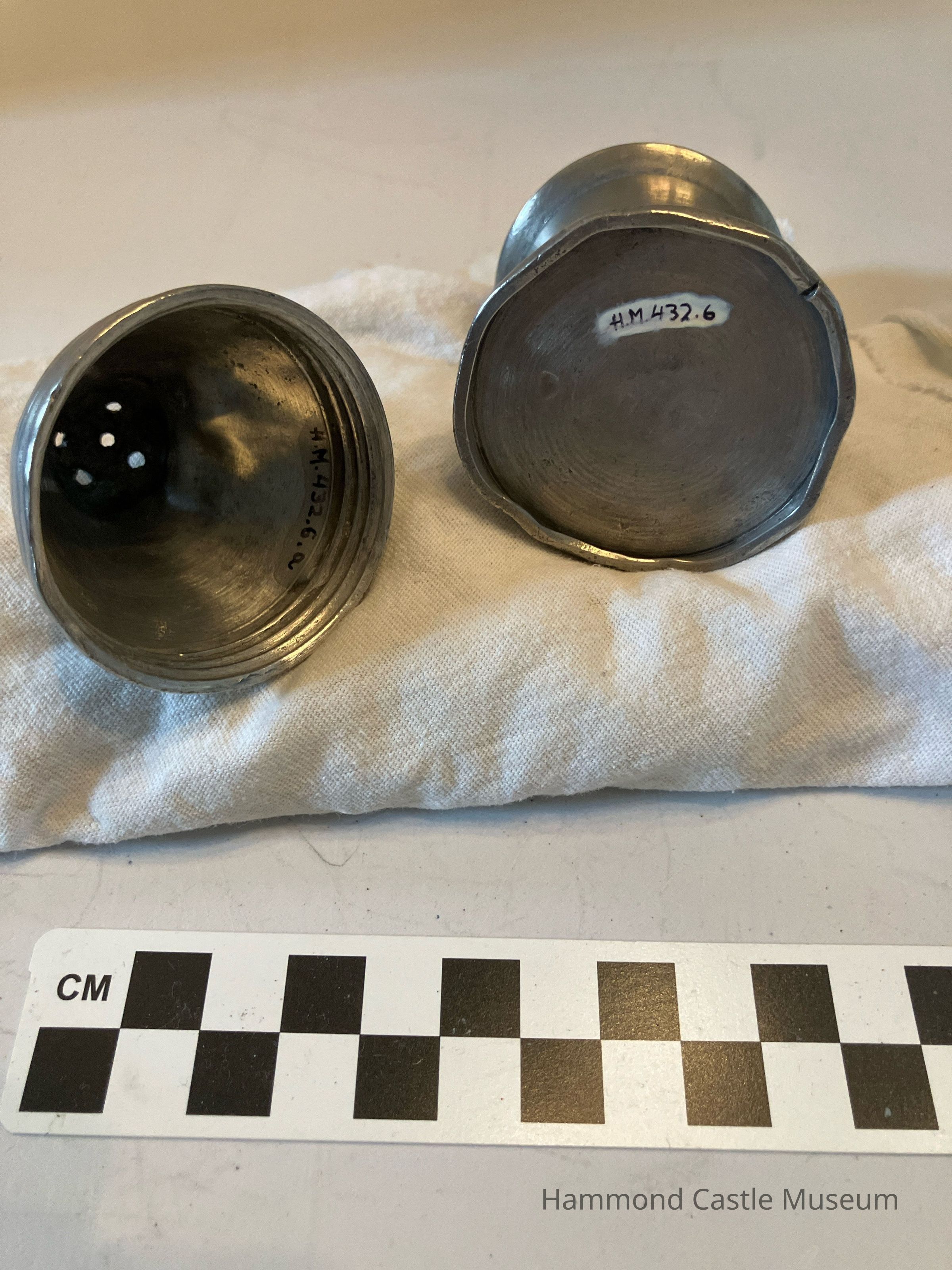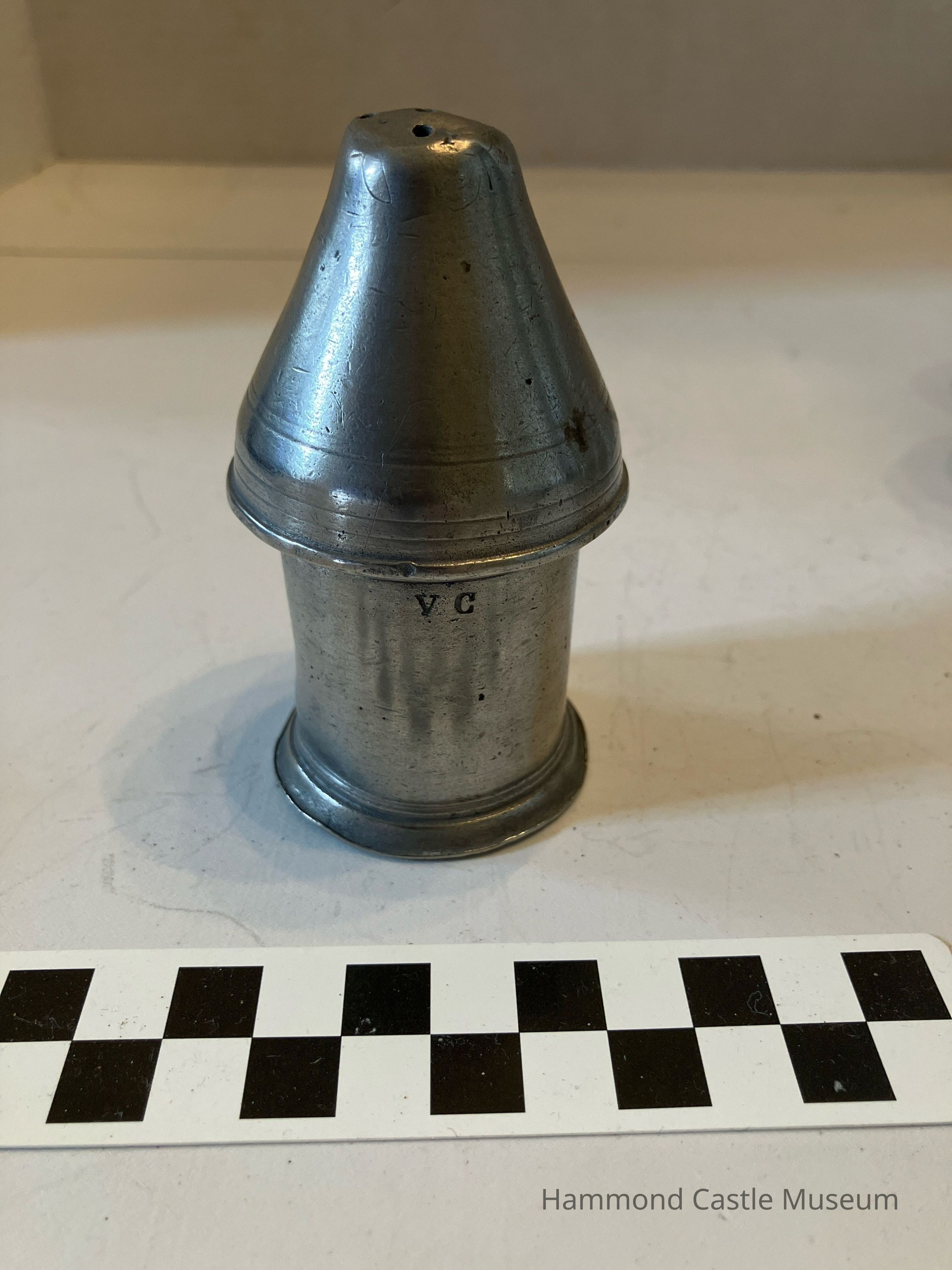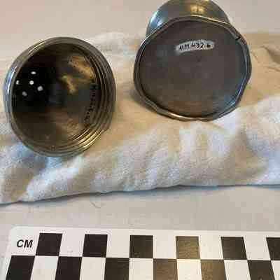 Set of 6 pepper shakers, all similar in shape with lipped bases ringed above with cylindrical central section. Perforated cone-shaped tops which unscrew, with two sets of turnings. One shaker damaged at base.