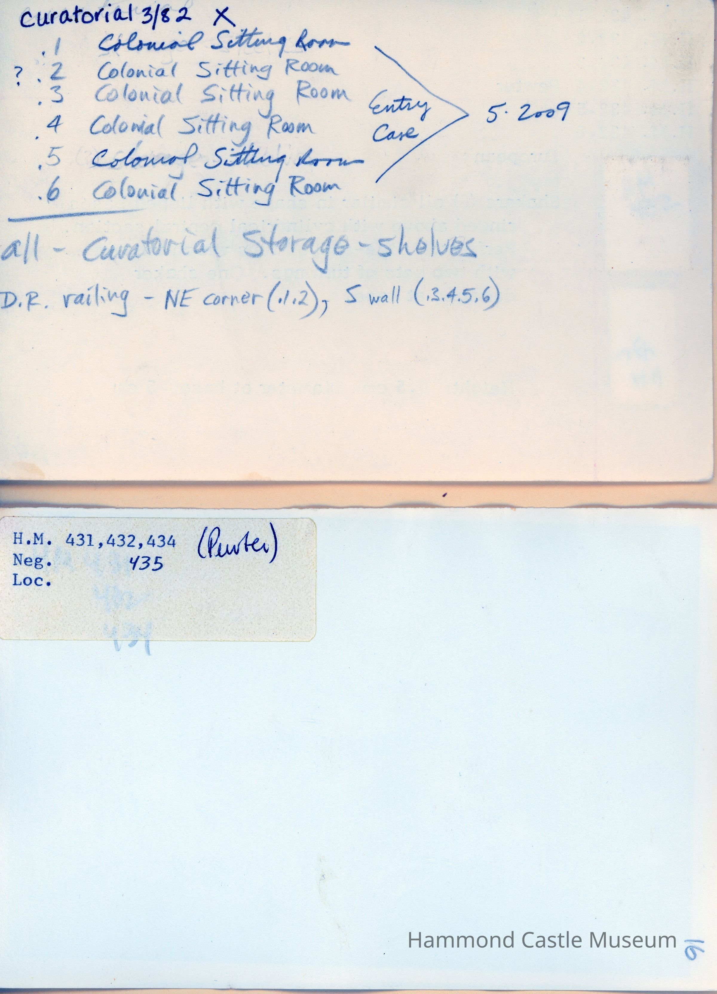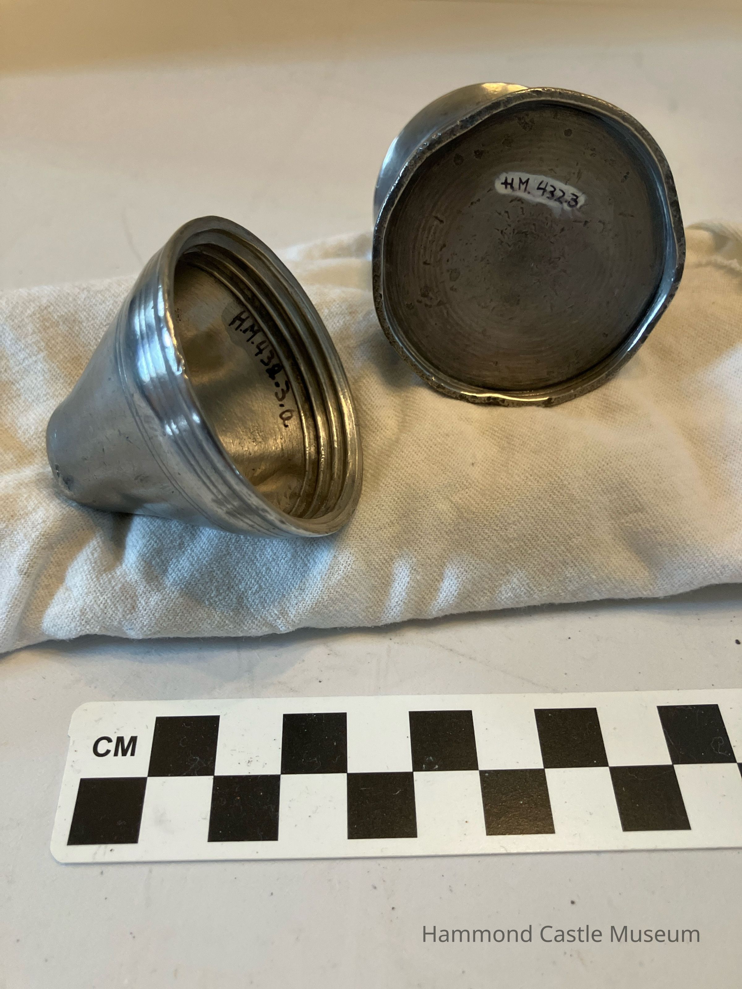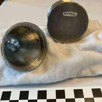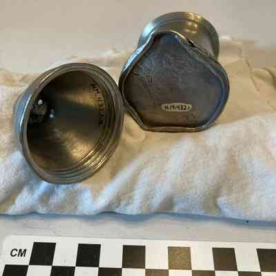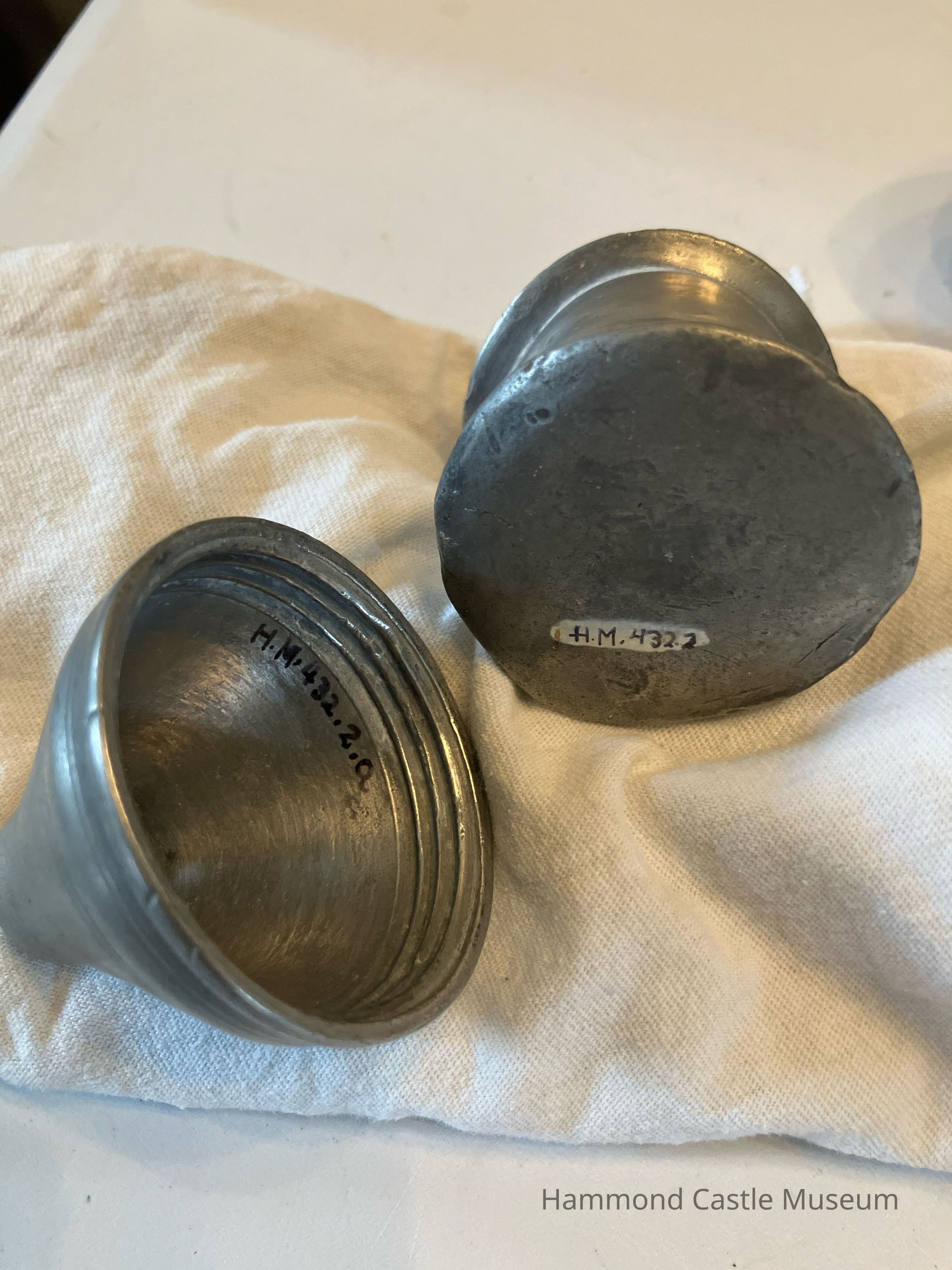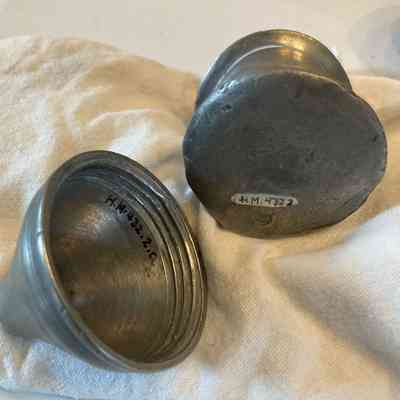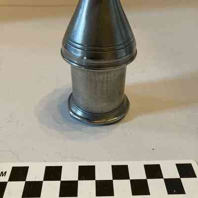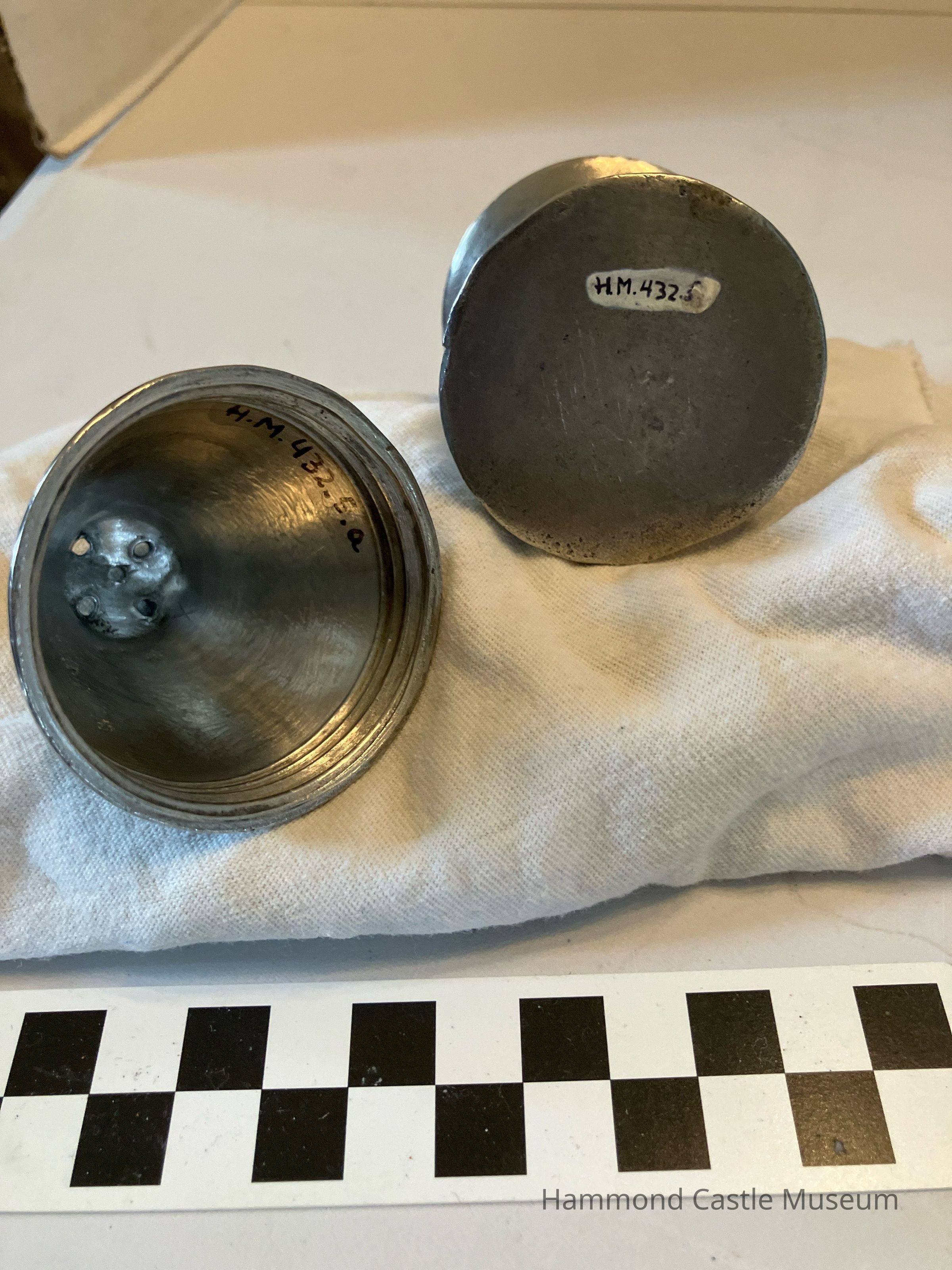 Set of 6 pepper shakers, all similar in shape with lipped bases ringed above with cylindrical central section. Perforated cone-shaped tops which unscrew, with two sets of turnings. One shaker damaged at base.