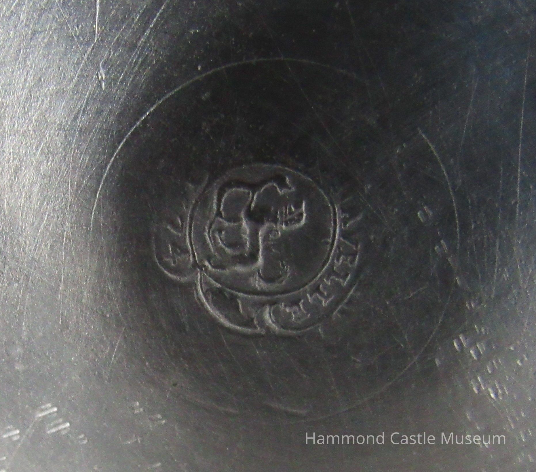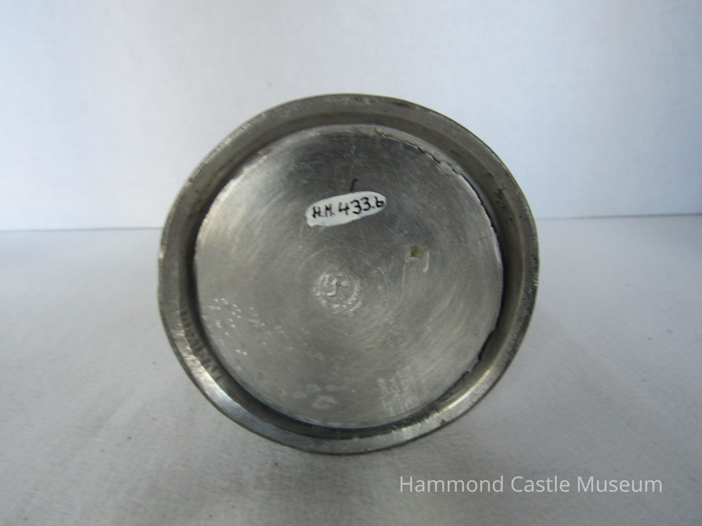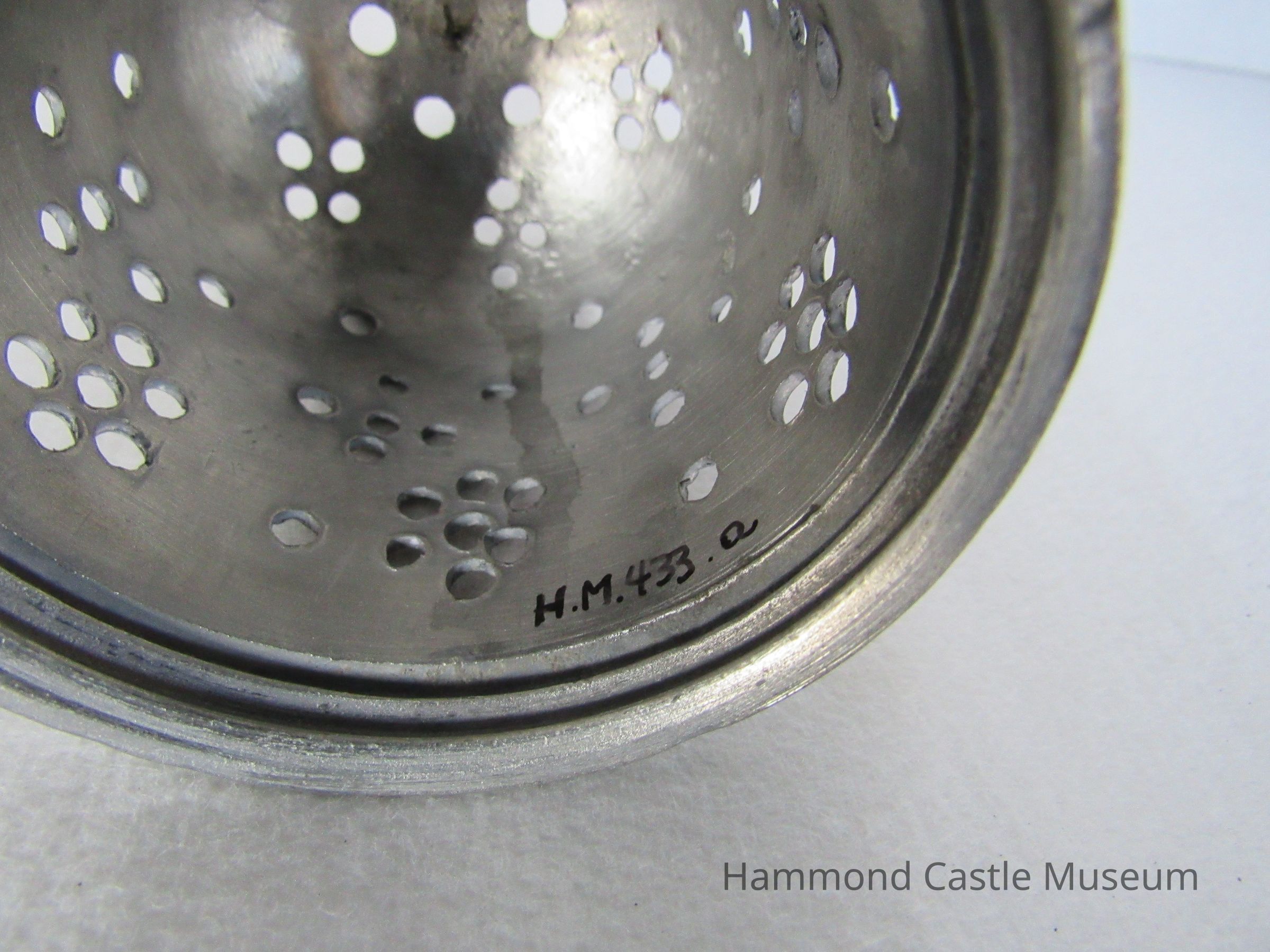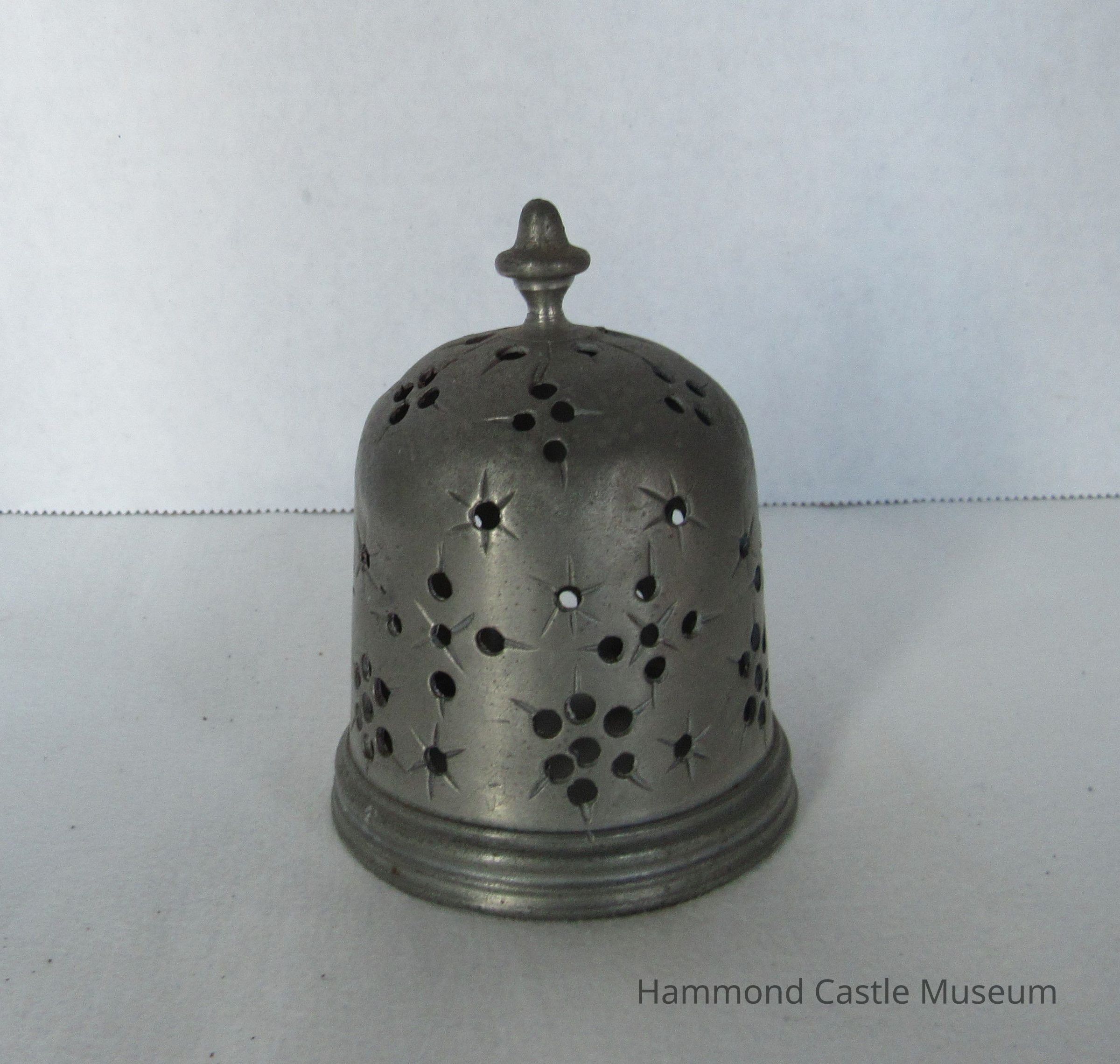 Large 2 part (a&b) sugar shaker dated on bottom: 1674. Dome-shaped with starred perforations above center line. Marking: see card catalogue.