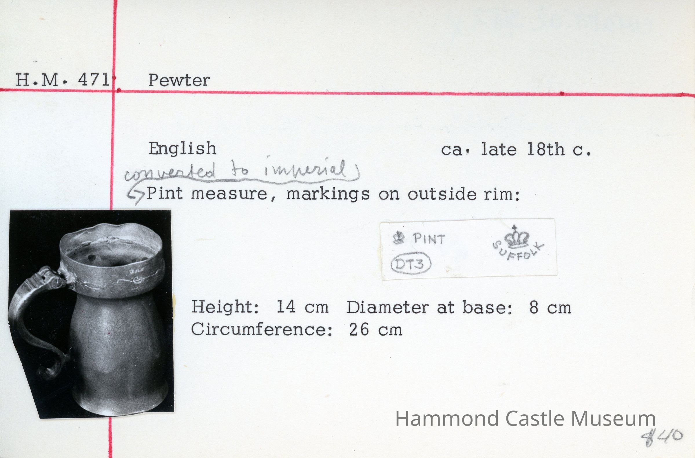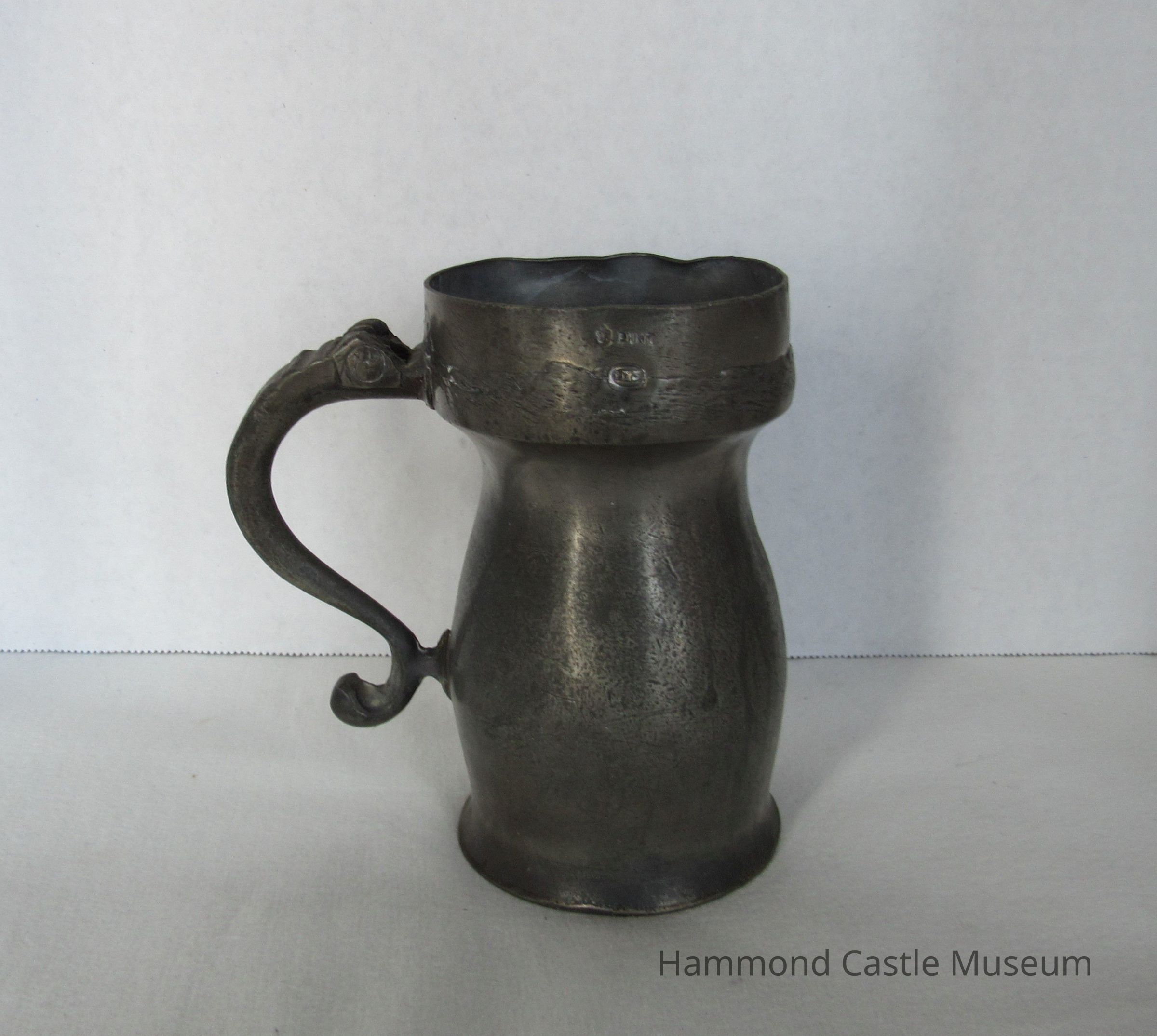 Pewter Tankard Converted to English Imperial pint measure, markings on outside rim: see catalogue card.