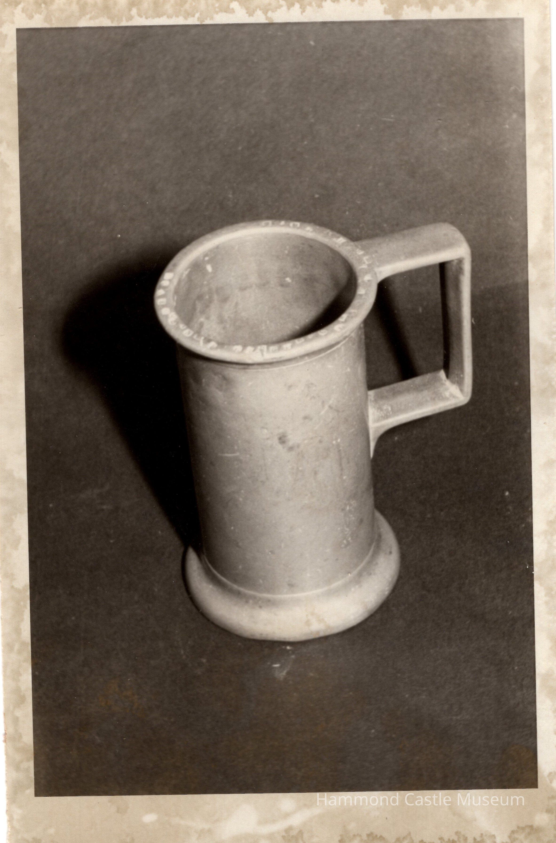 French double centiliter measure, squared-off handle single band under lip and at base. Markings: stamped on lip numerous capital letters. Marking on bottom: see catalogue card.