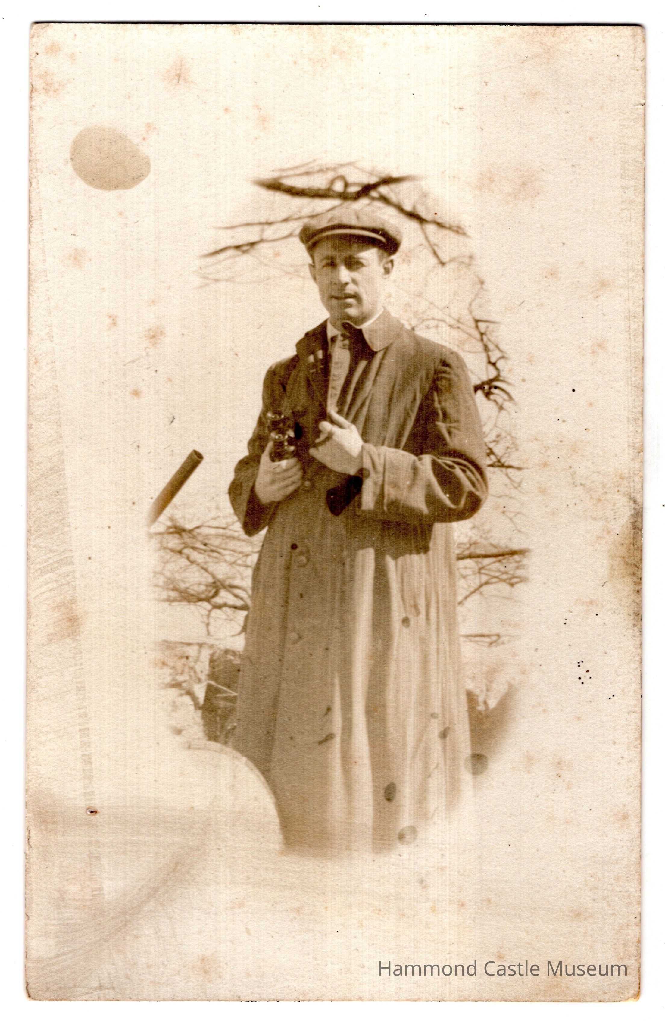 Photocard ca1920 JHH Jr with binoculars, Lookout Hill, Gloucester