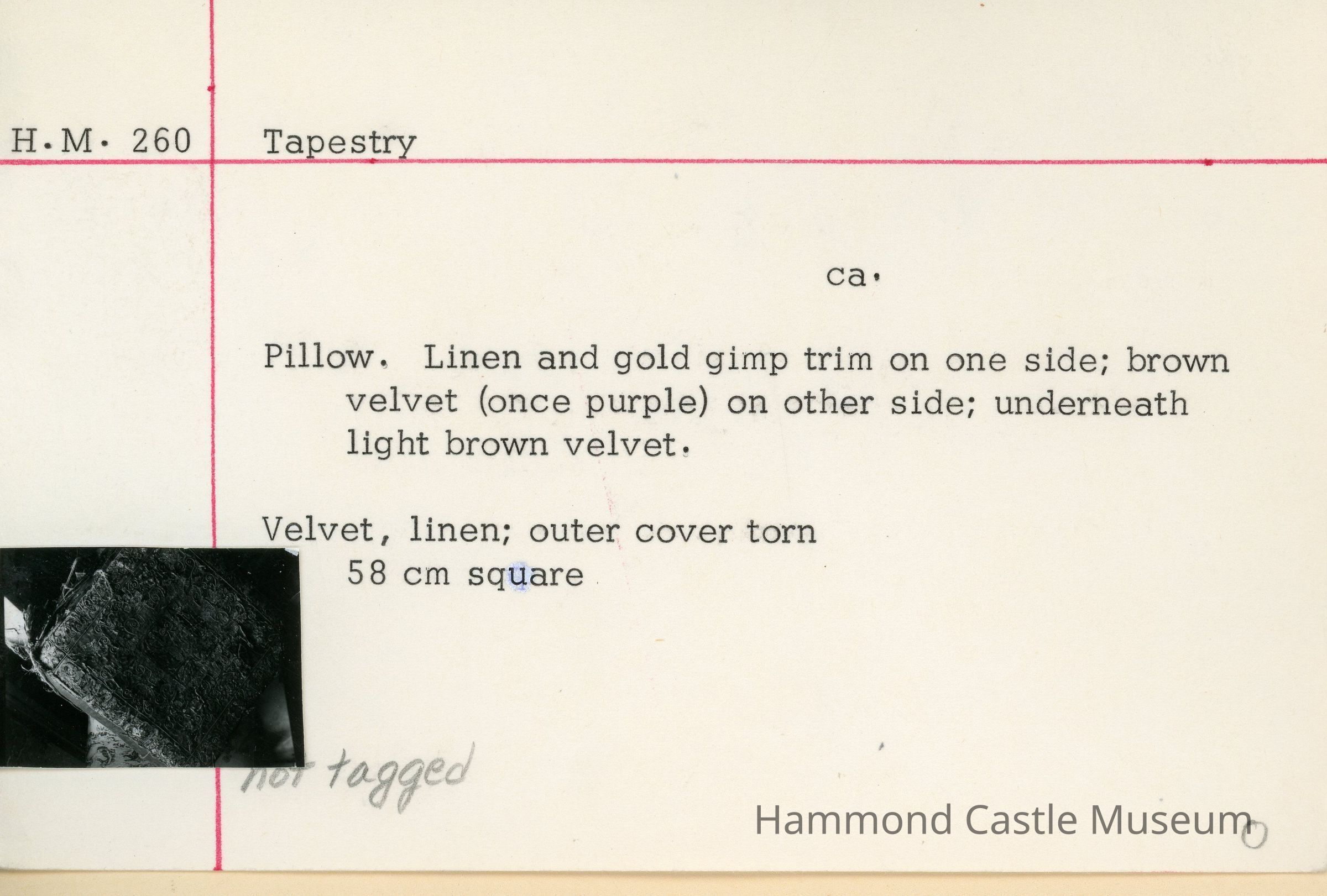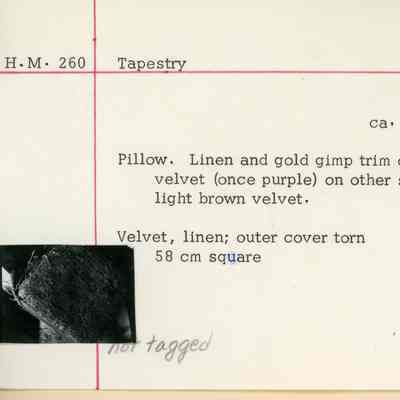 Linen and gold gimp trim on one side; brown velvet (once purple) on other side; underneath light brown velvet Not tagged