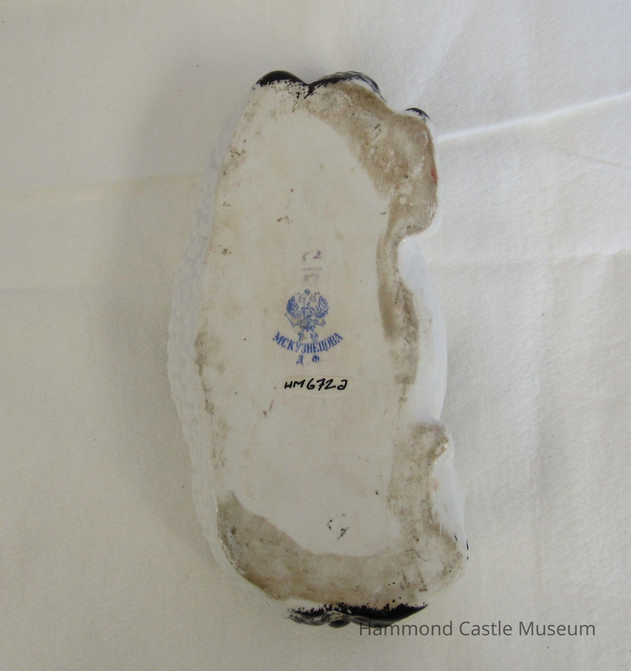 Bottom half of glazed porcelain sitting ram. Black and white in 2 parts.
