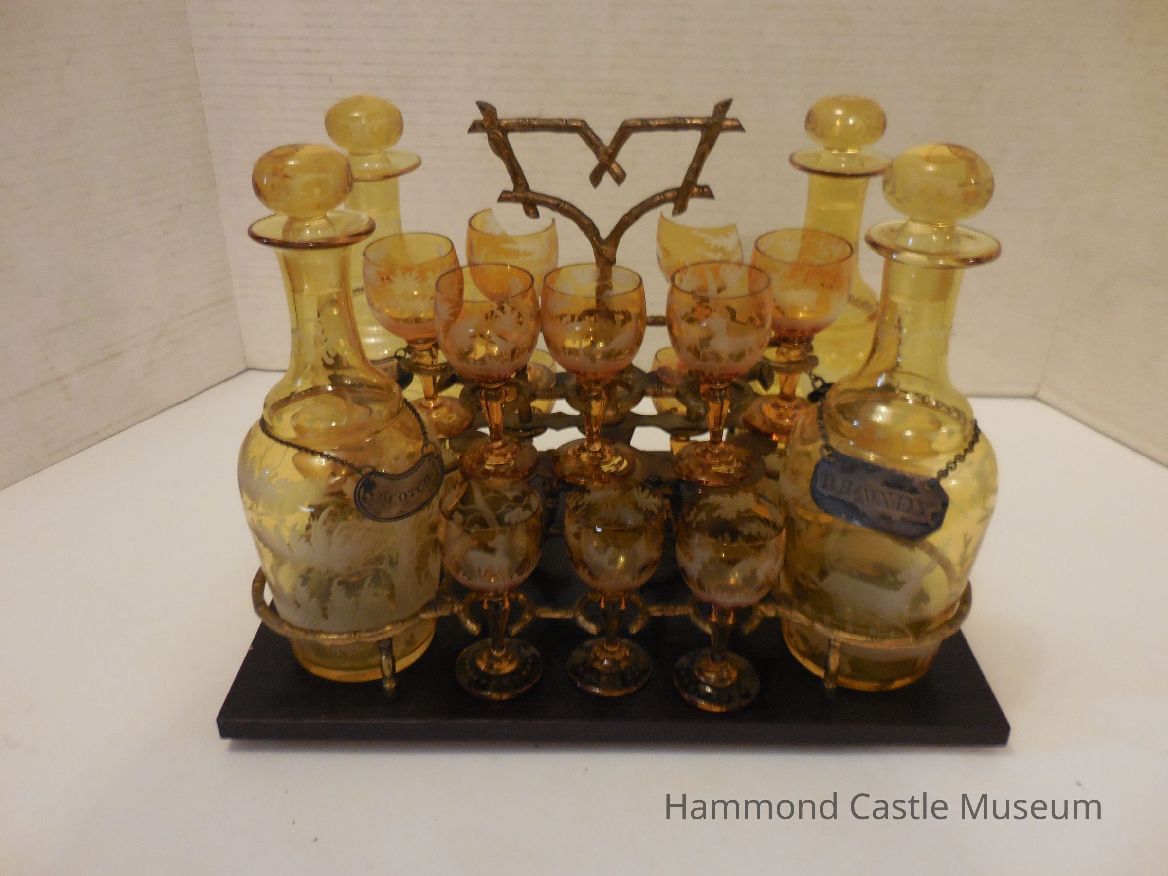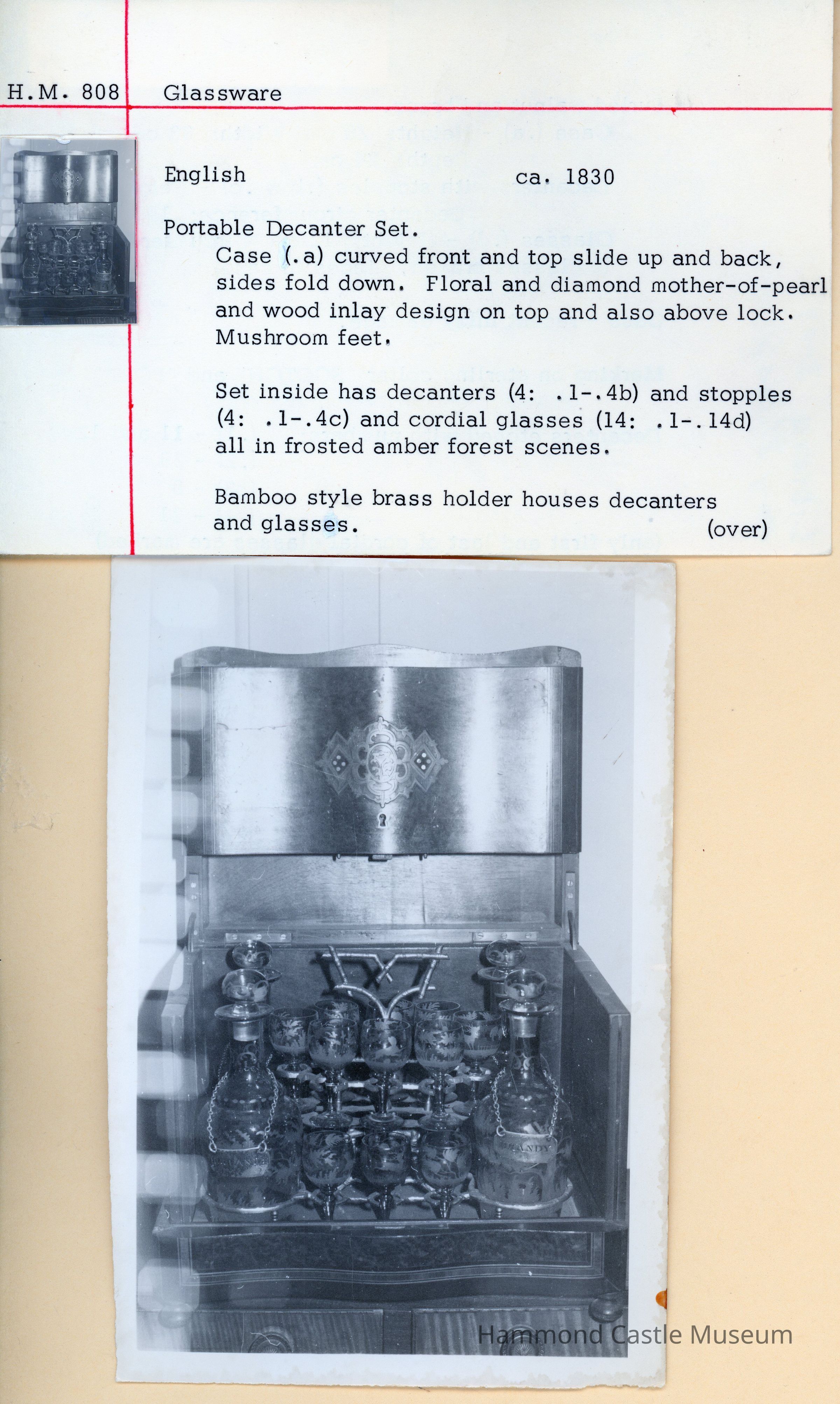 Set inside has 4 decanters (4: .1-.4b) with 4 stopples (4: .1-.4c) and 14 cordial glasses (14: .1-.14d) all in frosted amber forest scenes. Only first and last of cordial glasses are marked.