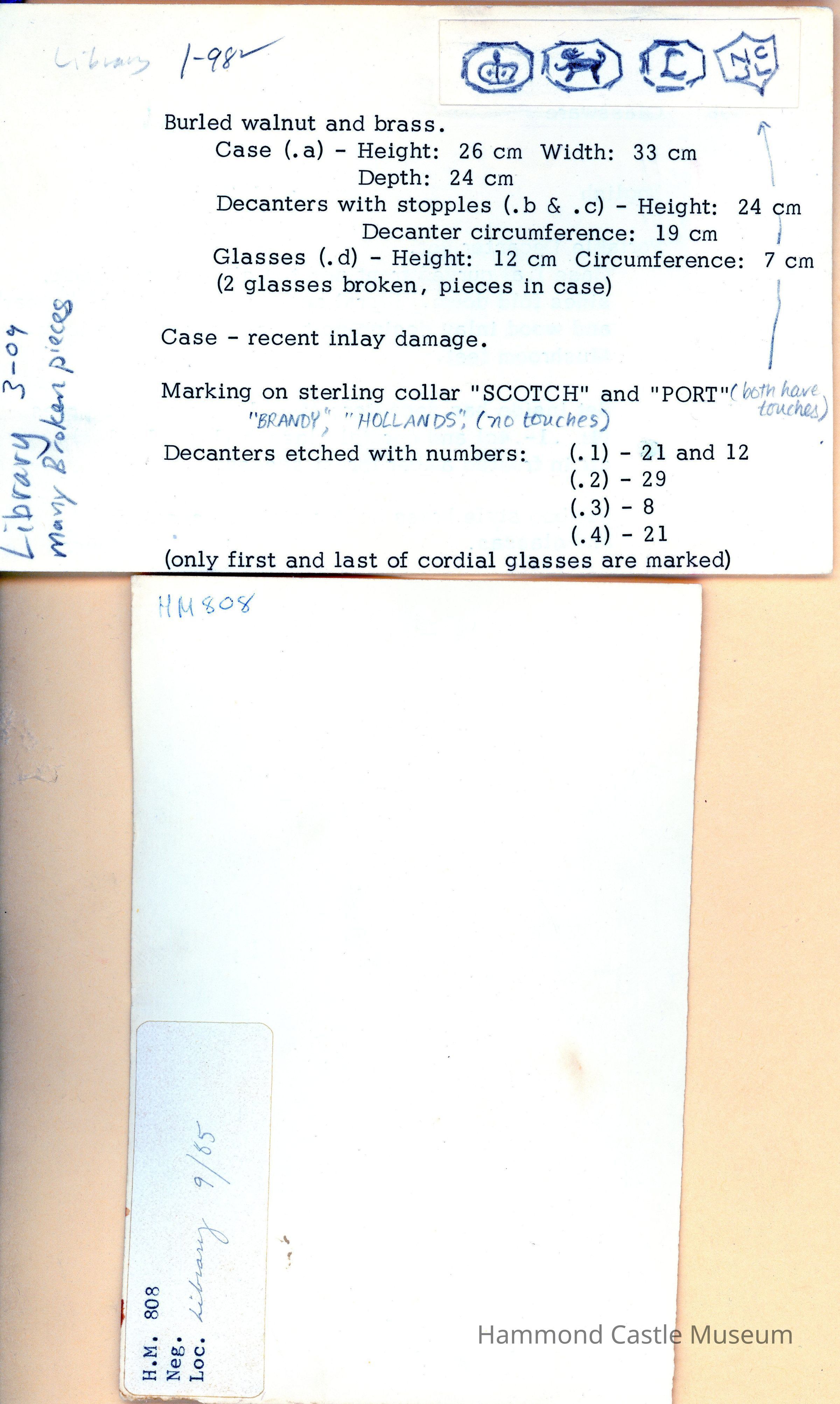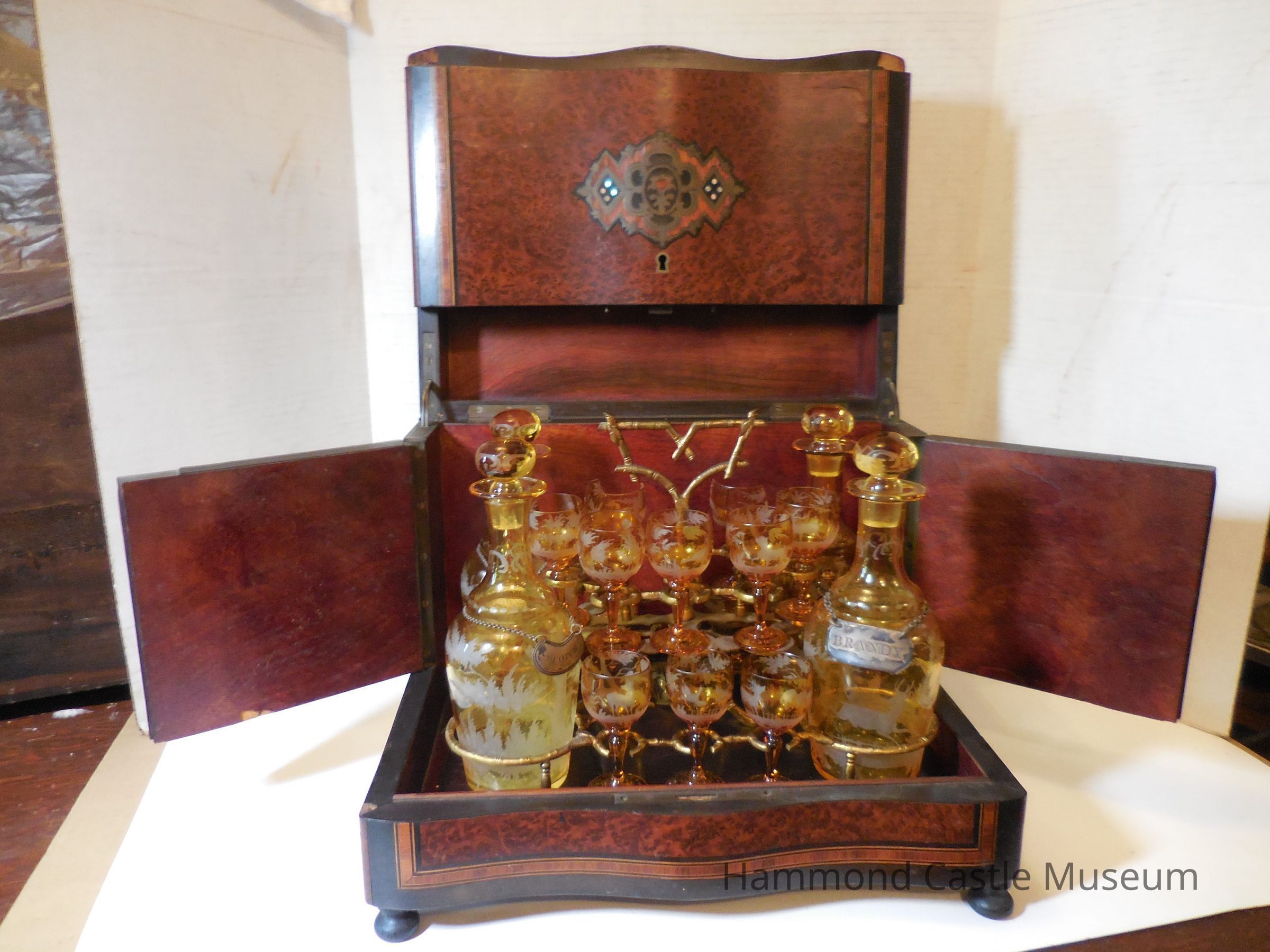 Burled walnut and brass. Marking on sterling collar "SCOTCH" and "PORT" both with touches, and "BRANDY" and "HOLLANDS" both with no touches.